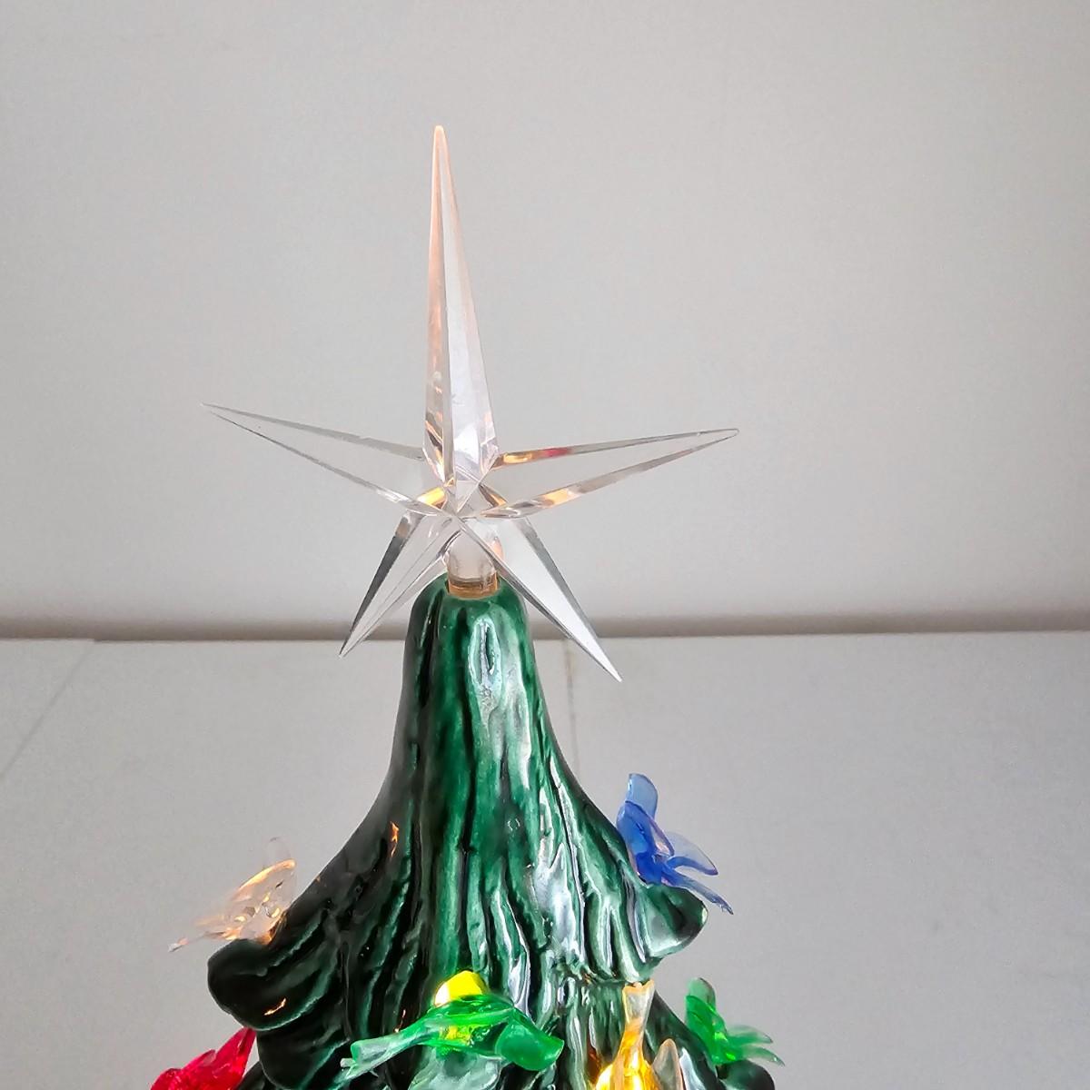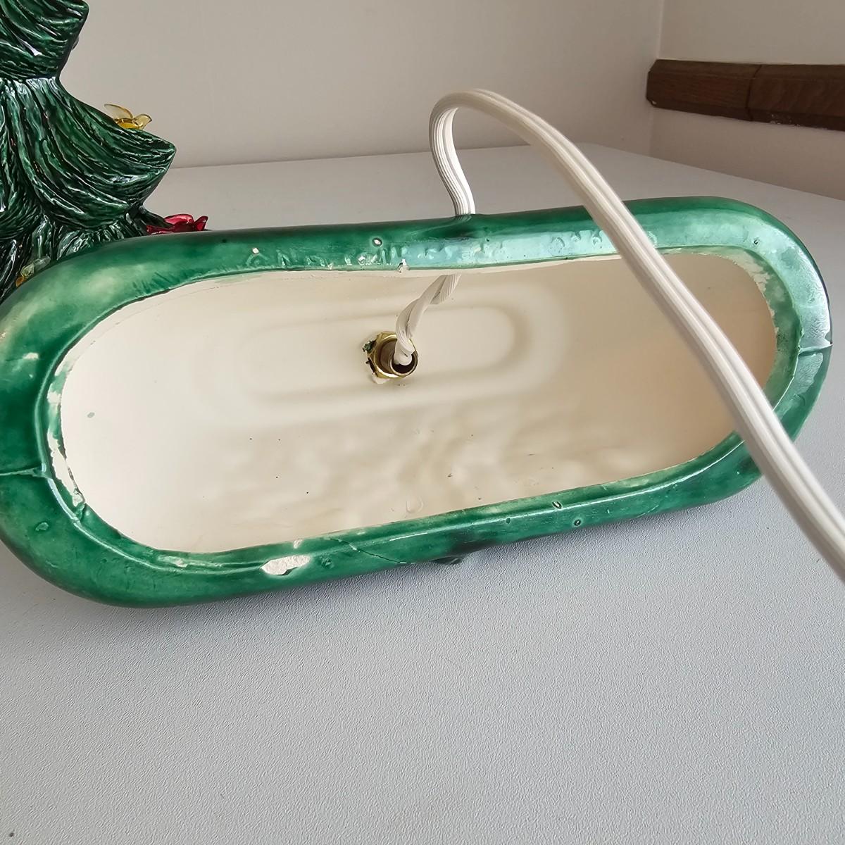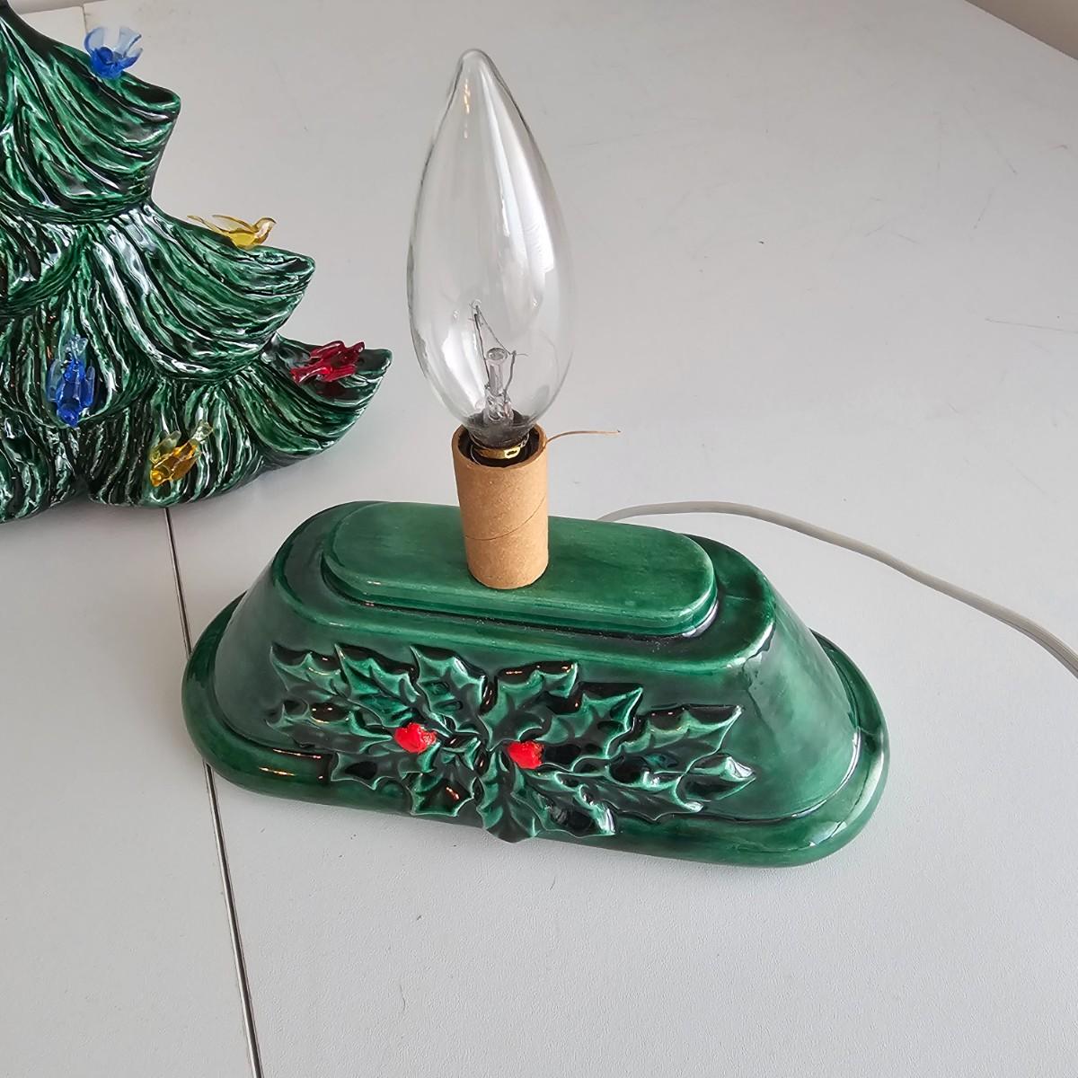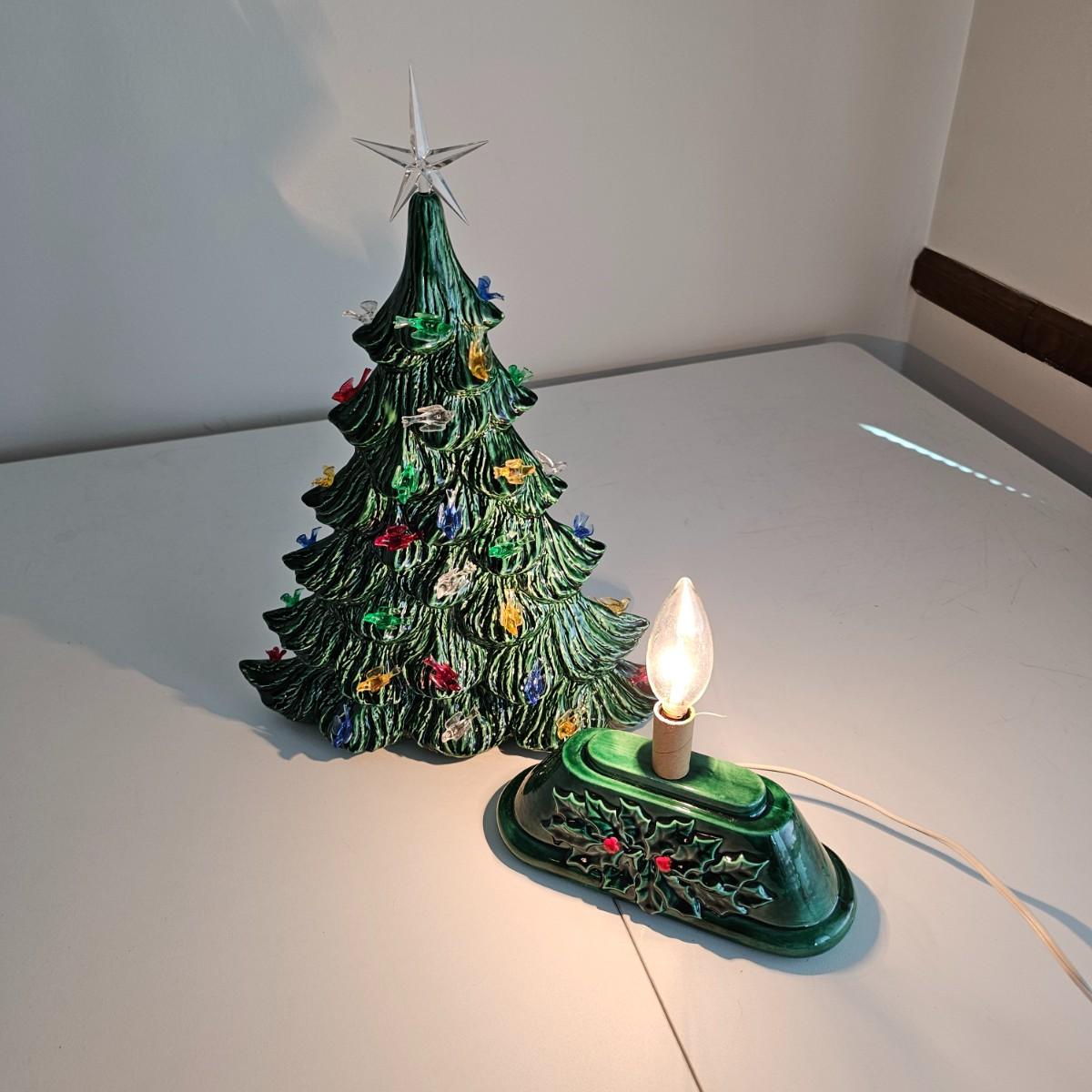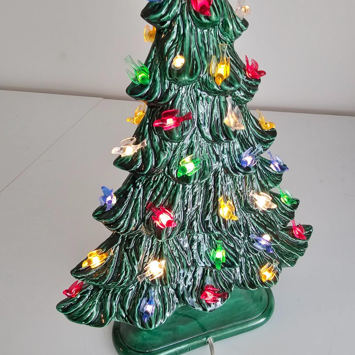 Unique slender oblong green ceramic tree, known as a mantel tree due to its slim design. Old world style sculpted branches, holly emblem on base. Includes all jewels and star topper: jewels are colored birds. Inline on/off switch, tree powered on when plugged in. Tree measures 4" x 11" x 18.5"H. Storage tub included. See photos for details. Shipping available.