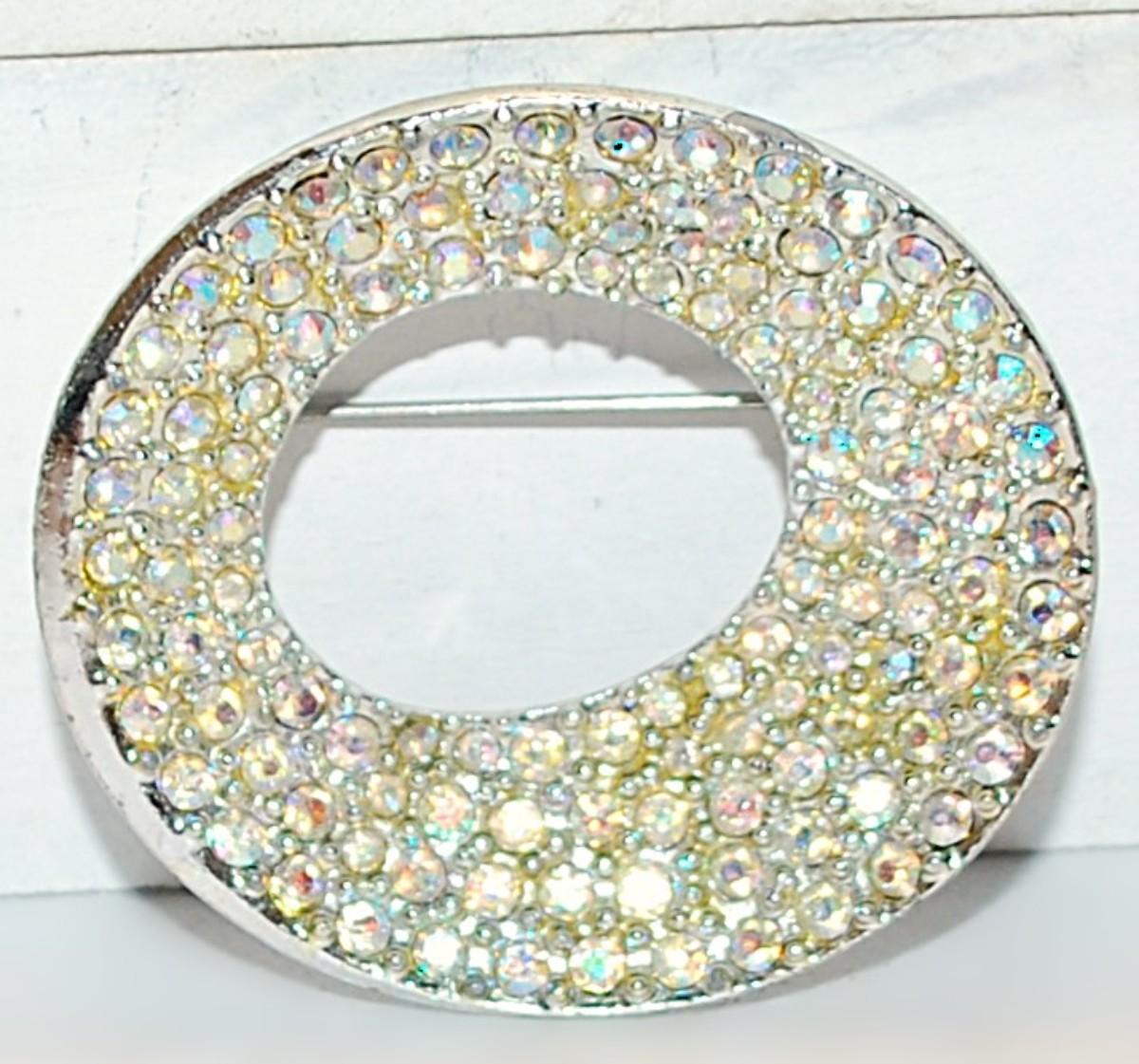 Oblong Oval "Bowl Style" BROOCH (2" x 1¾") Bejeweled with Iridescent Stone Accents on a Silver Tone Setting