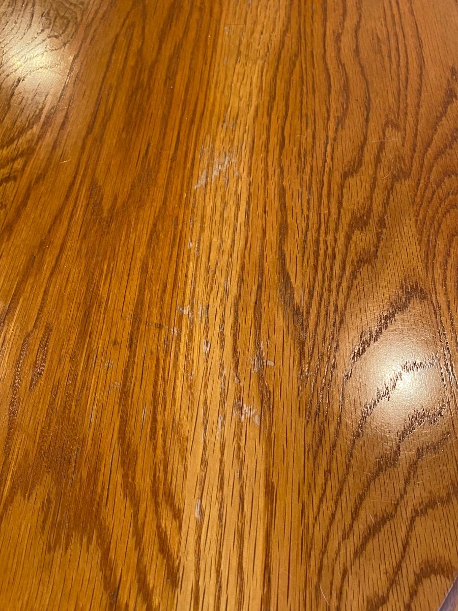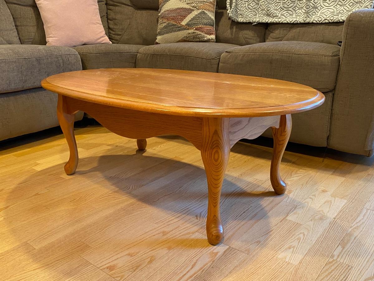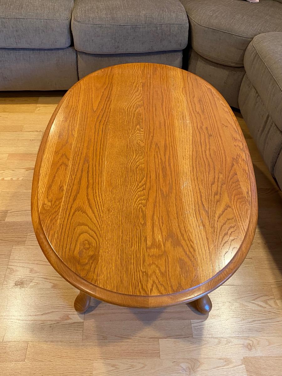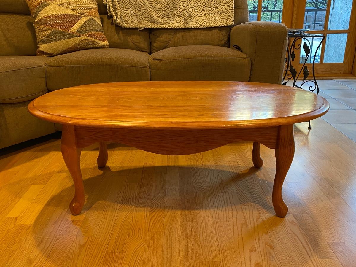 Oval wood coffee table. Looks like a light finished oak. Some light signs of use to the surface. About 4' length.