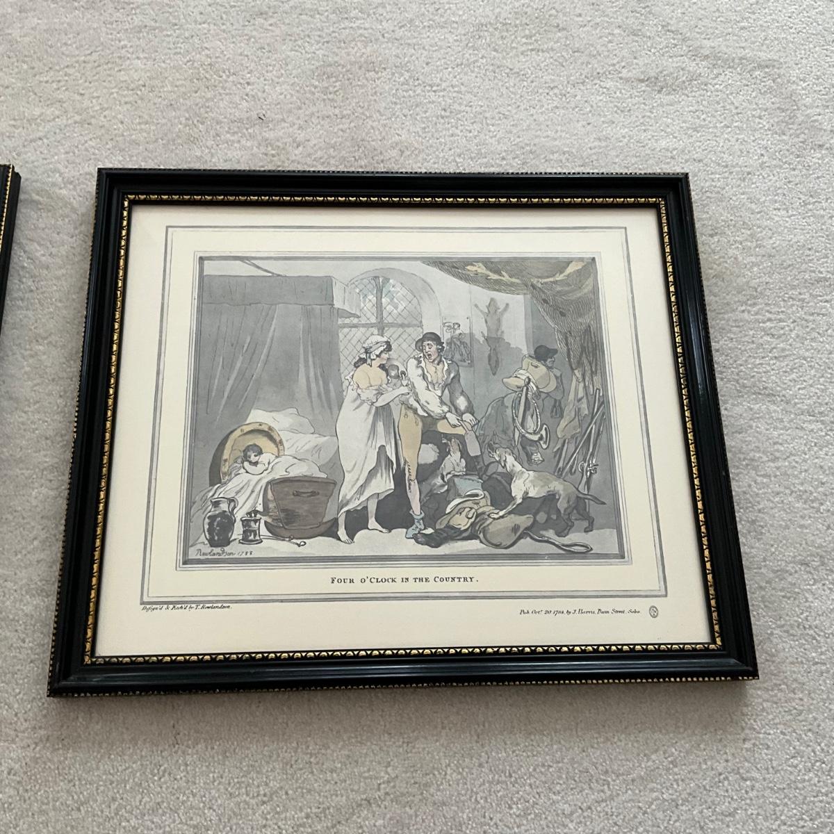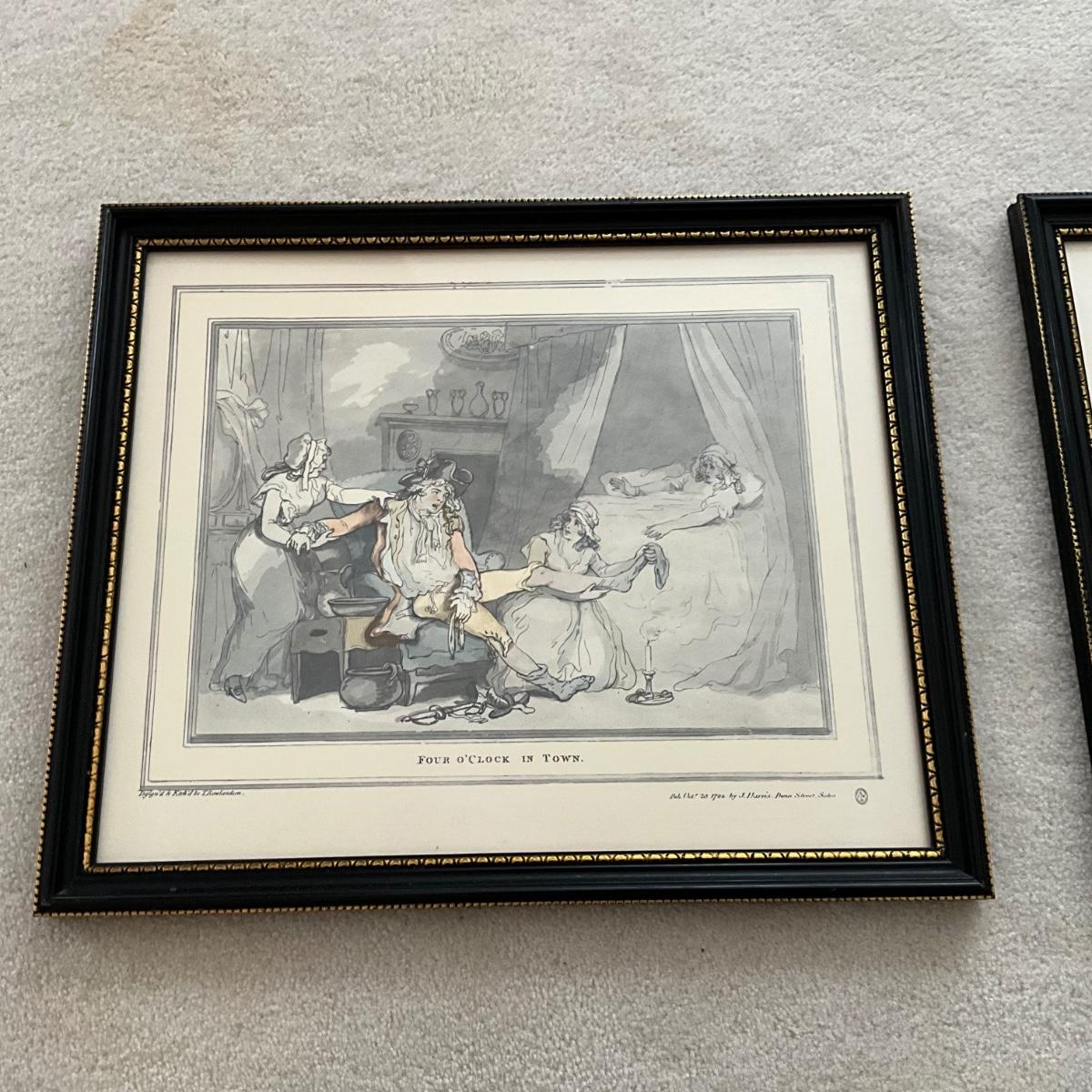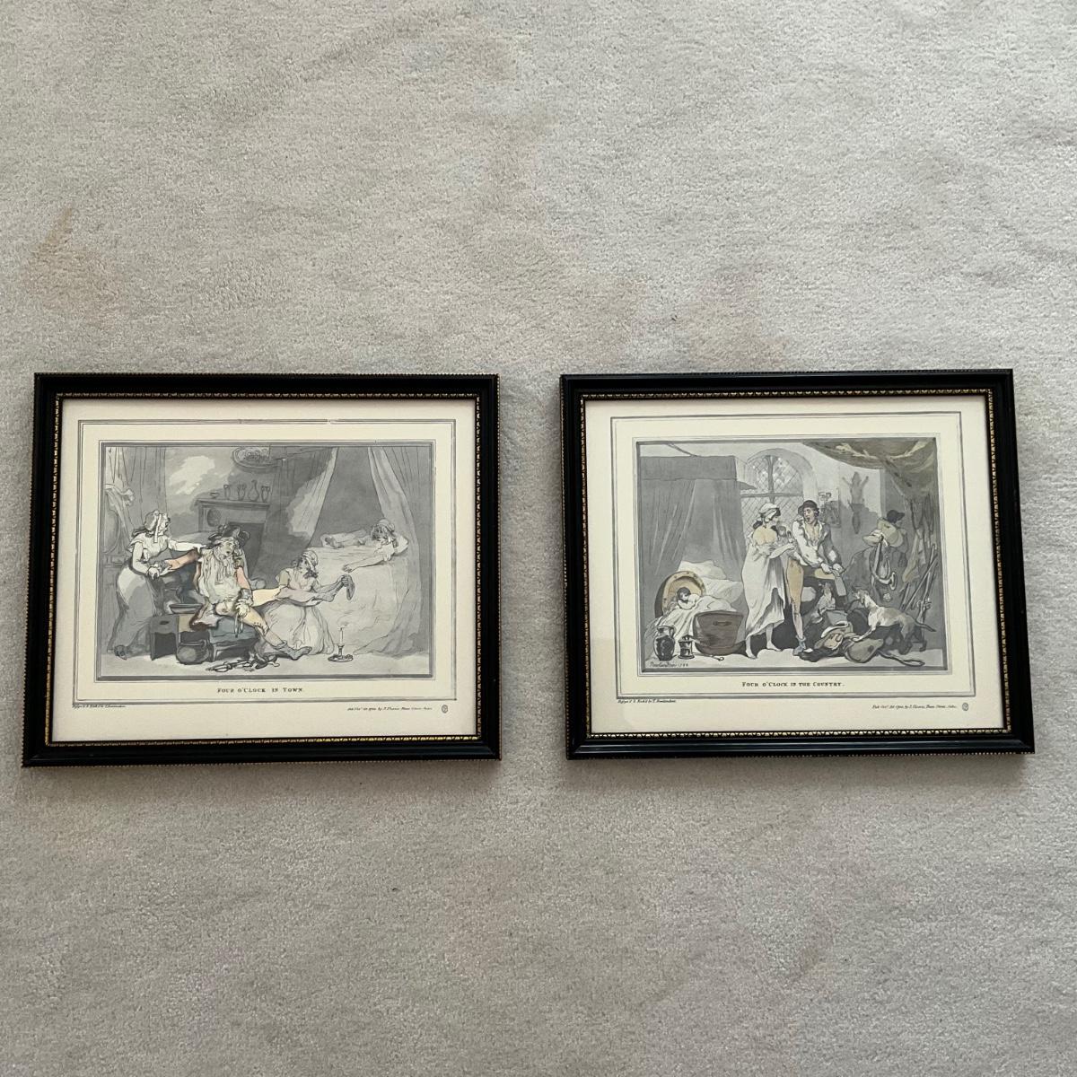 OBR1228 Pair of Antique Prints "Four O'Clock In Town" & "Four O'Clock In Country" by T. Rowlandson