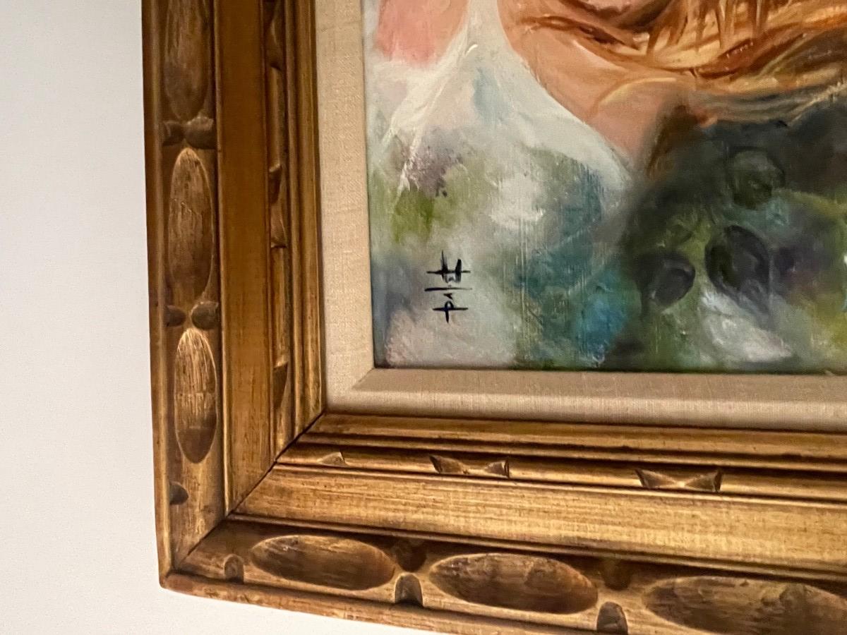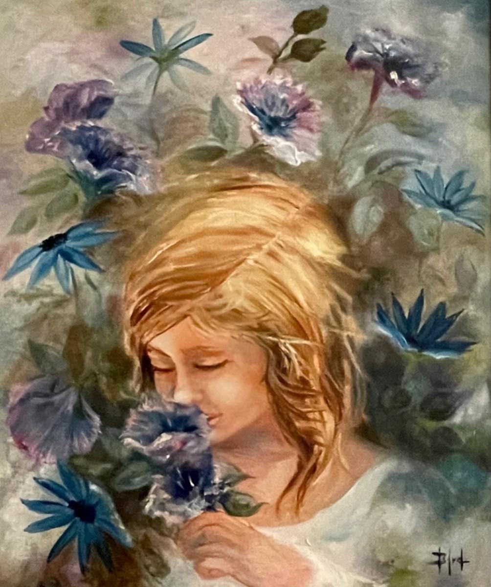 Description: Obscure Girl smelling flower Oil on Canvas; Framed Measurement: 28 x 24; Subject Measurement: 19.25 x 15.5