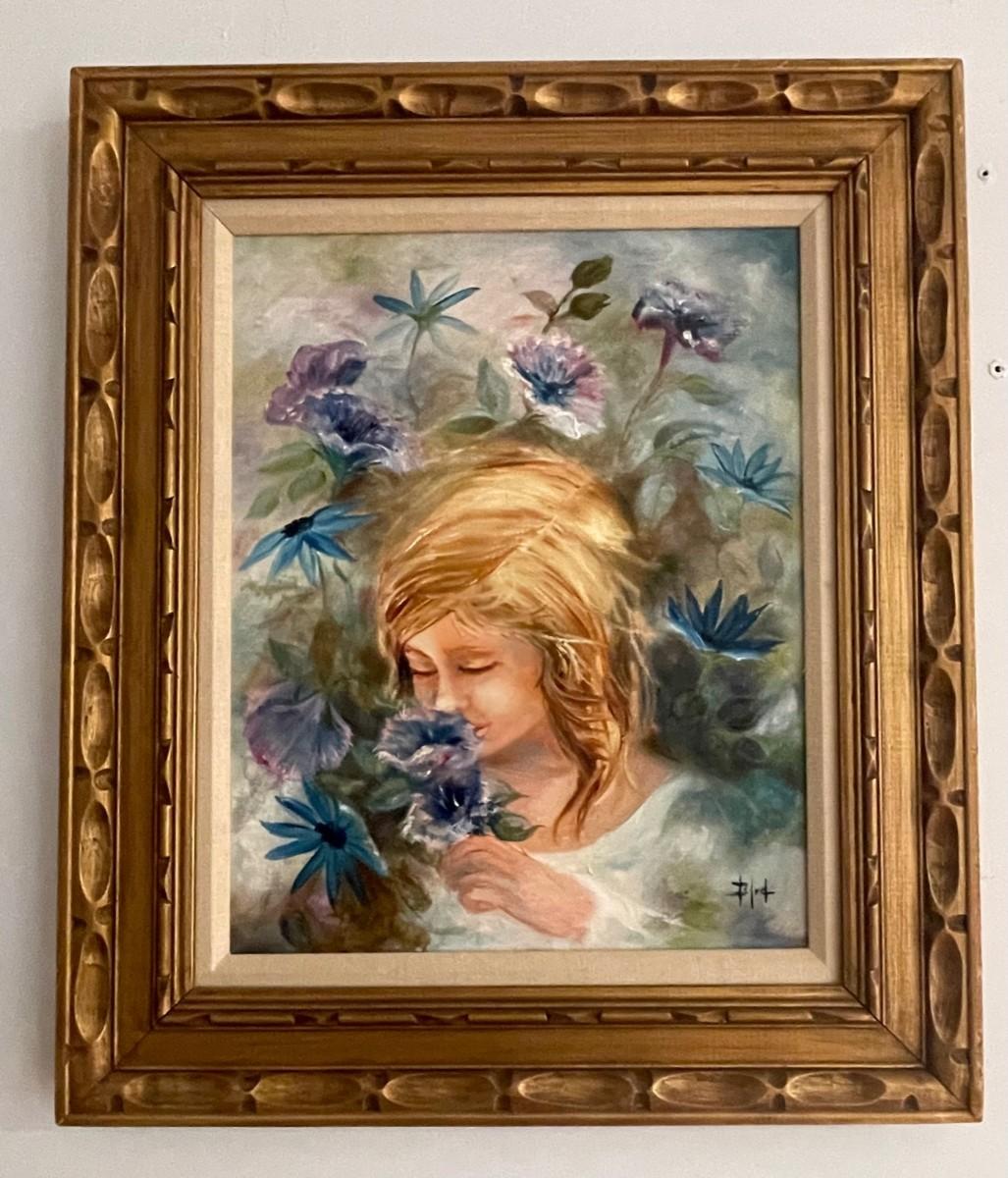 Description: Obscure Girl smelling flower Oil on Canvas; Framed Measurement: 28 x 24; Subject Measurement: 19.25 x 15.5