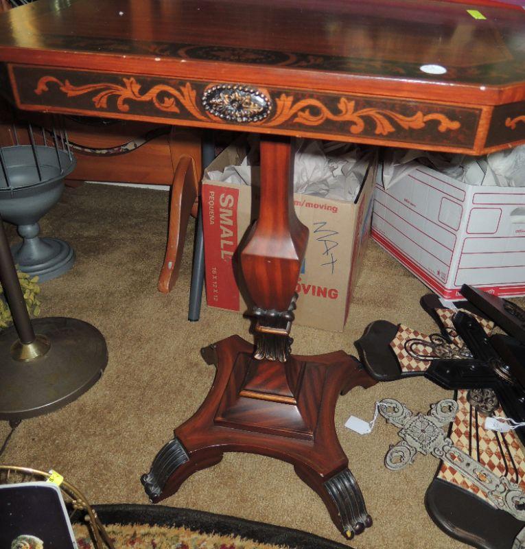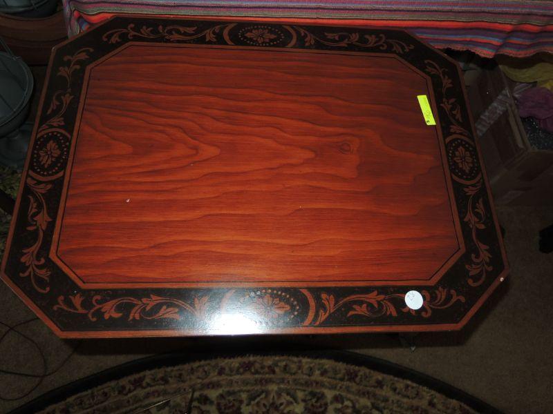 Cherry wood with black stenciled design and pretty pedestal base. Used condition. 16" D x 21 W x 26.5" T