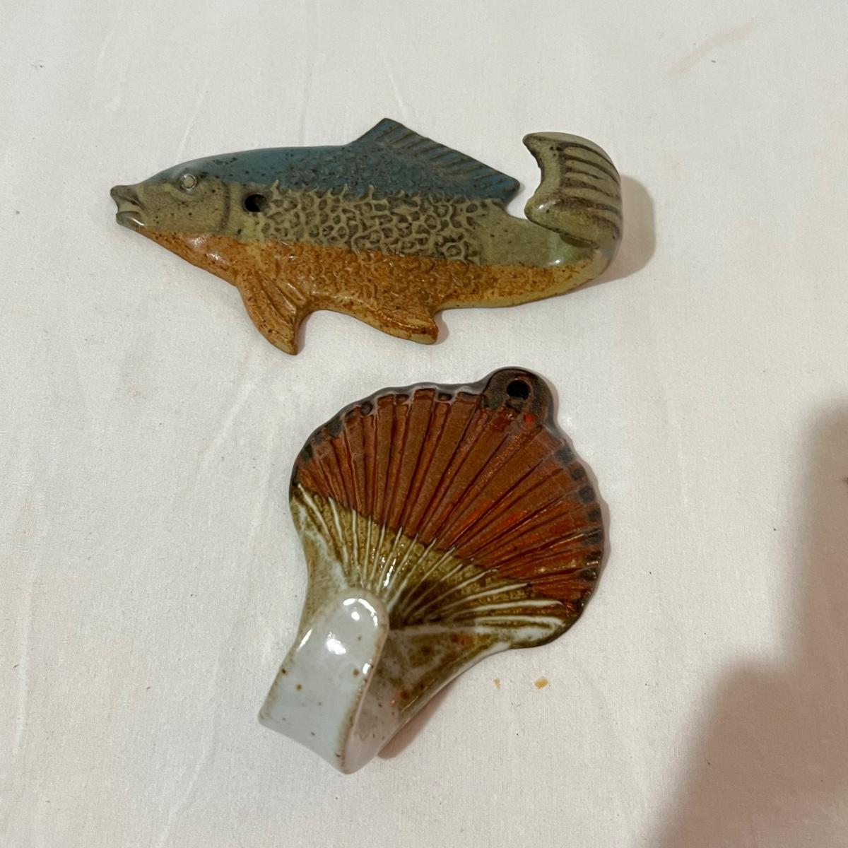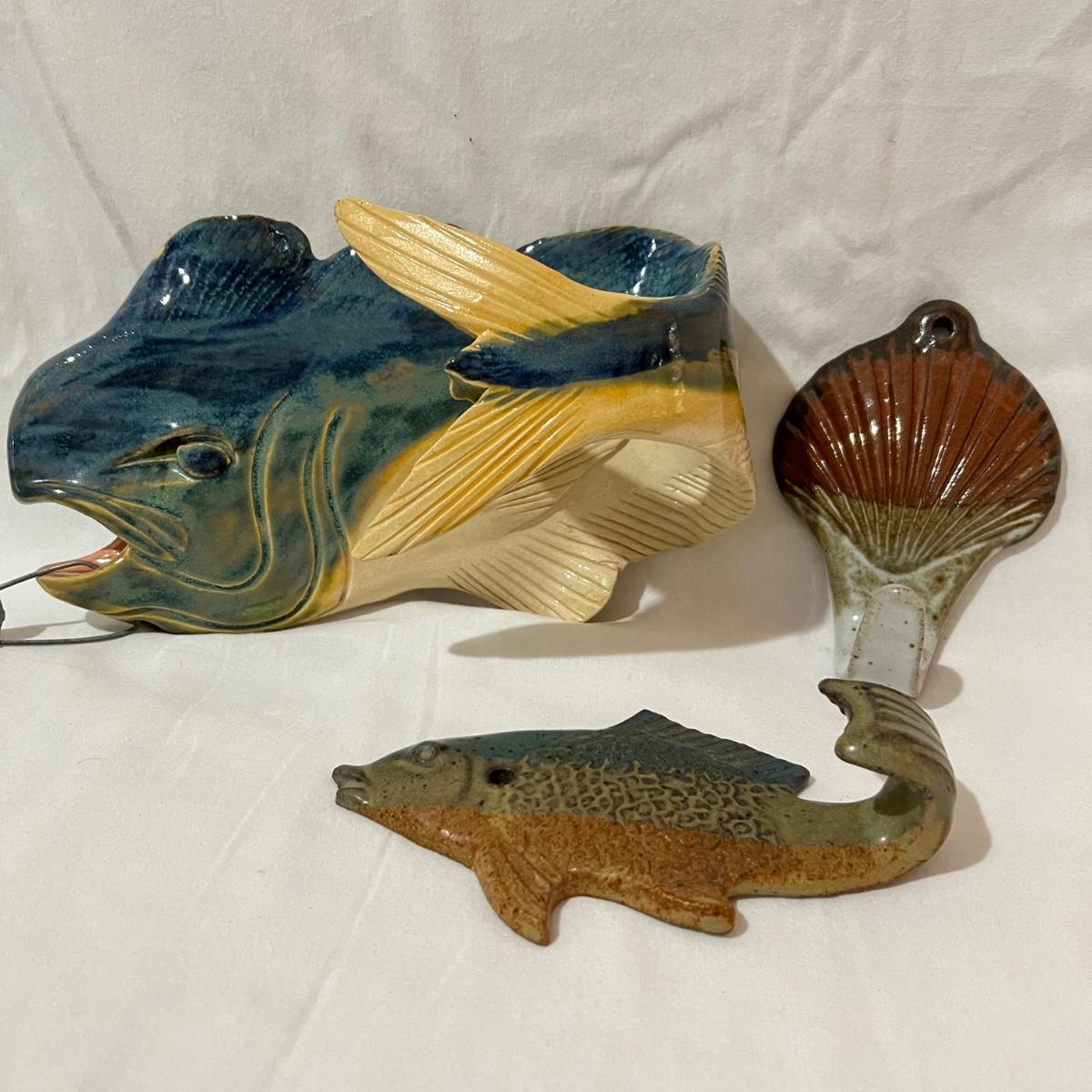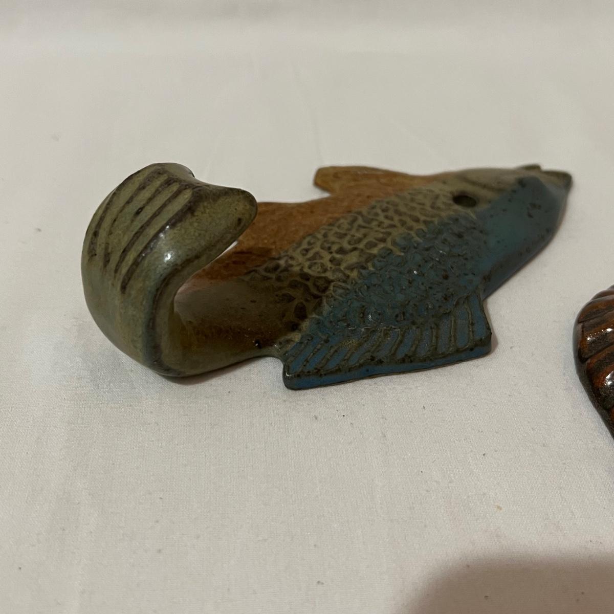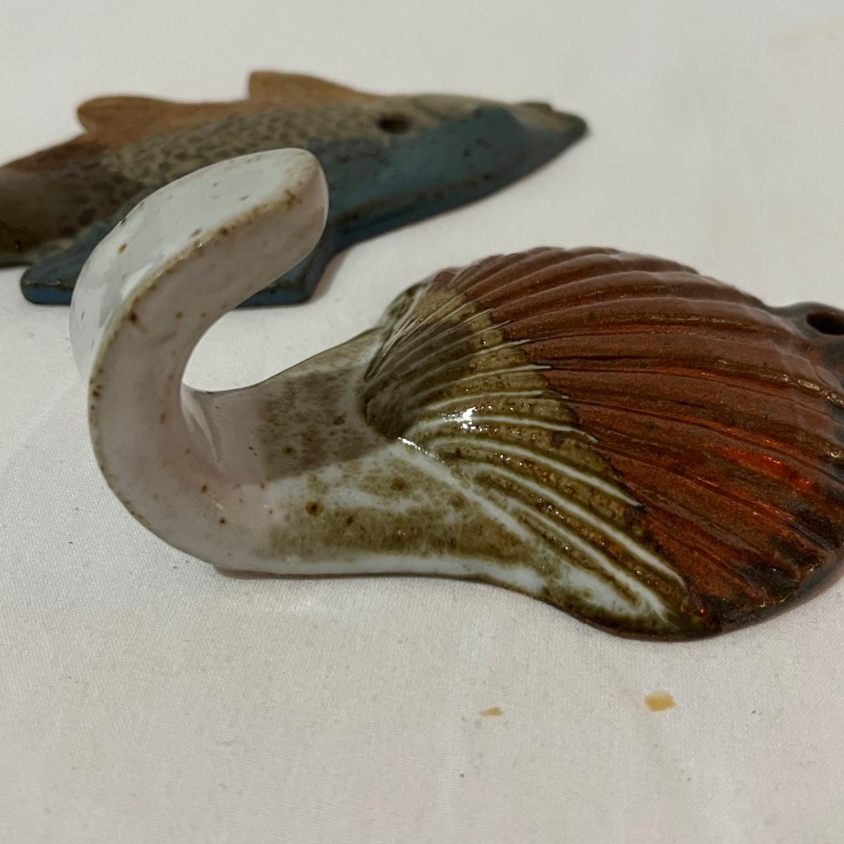 The largest piece in this trio of pottery is the whale who measures 6” x 4” x 10” H (not including the hook length) and it’s signed with an indecipherable signature; a small fish and a shell shaped coat hook completes this lot.