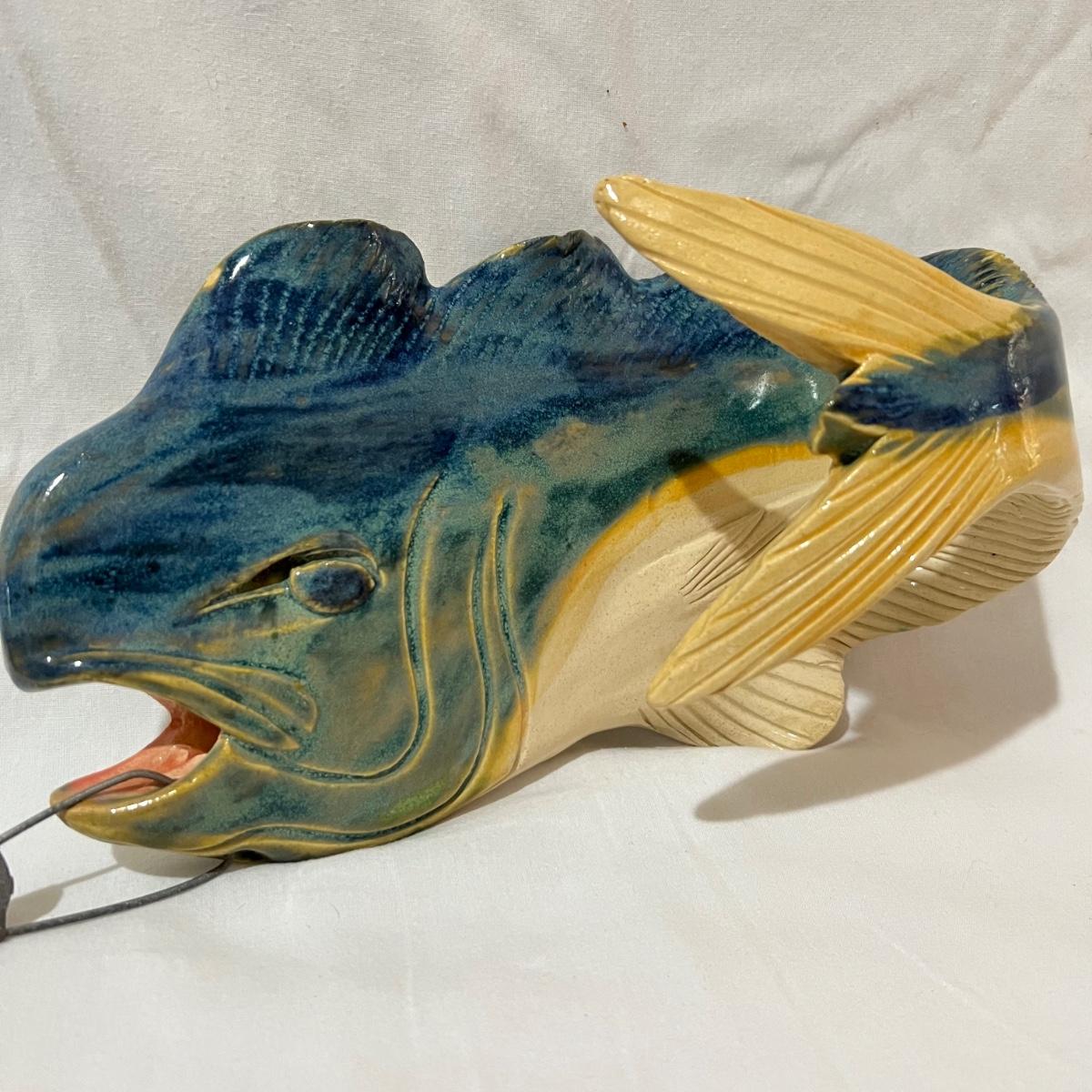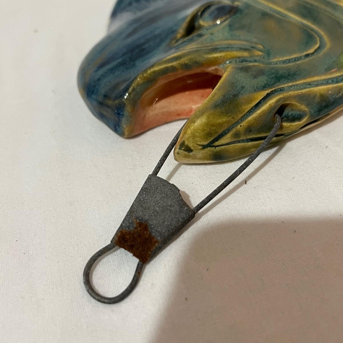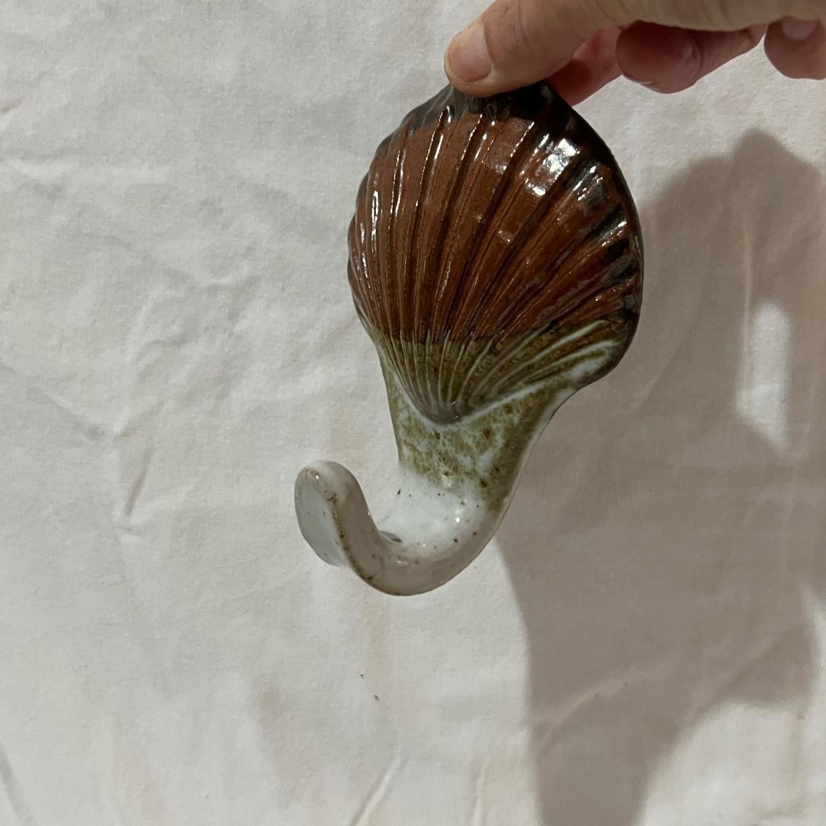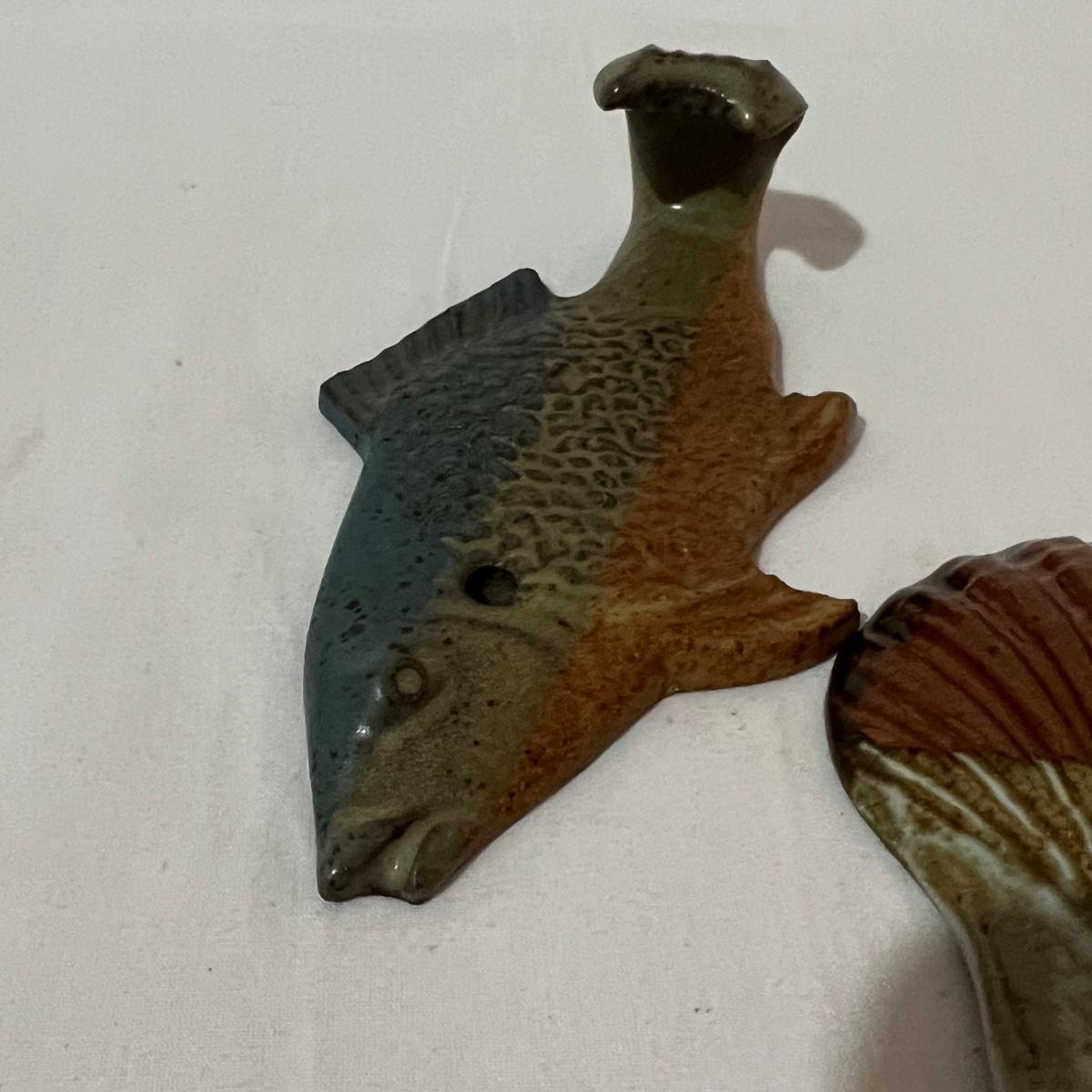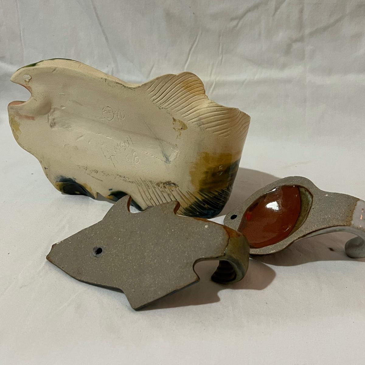 The largest piece in this trio of pottery is the whale who measures 6” x 4” x 10” H (not including the hook length) and it’s signed with an indecipherable signature; a small fish and a shell shaped coat hook completes this lot.