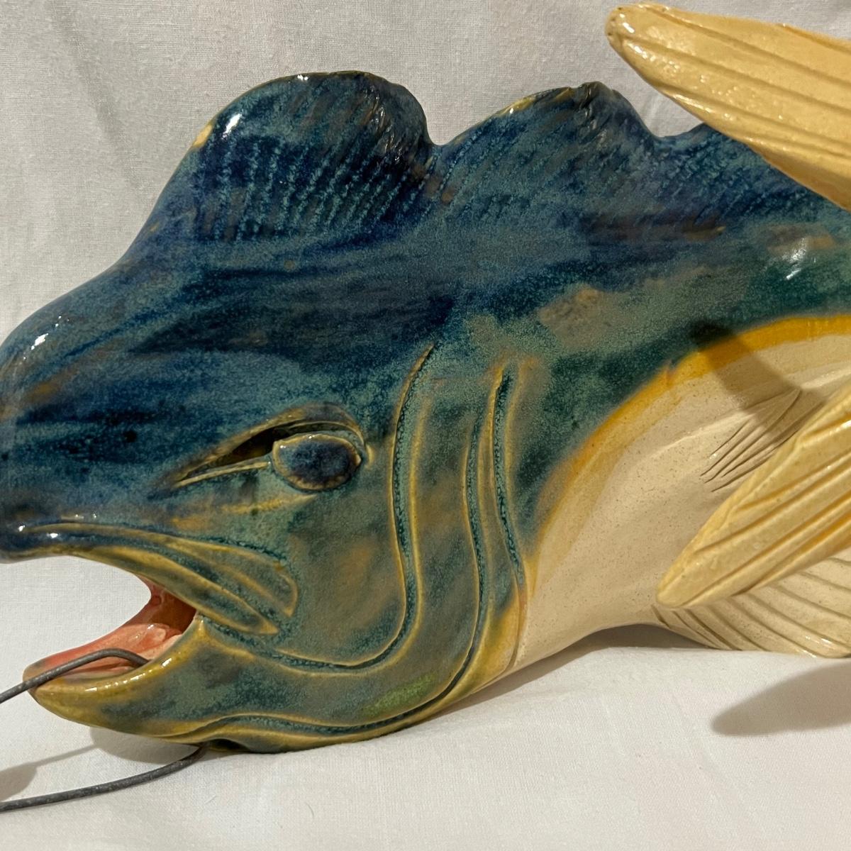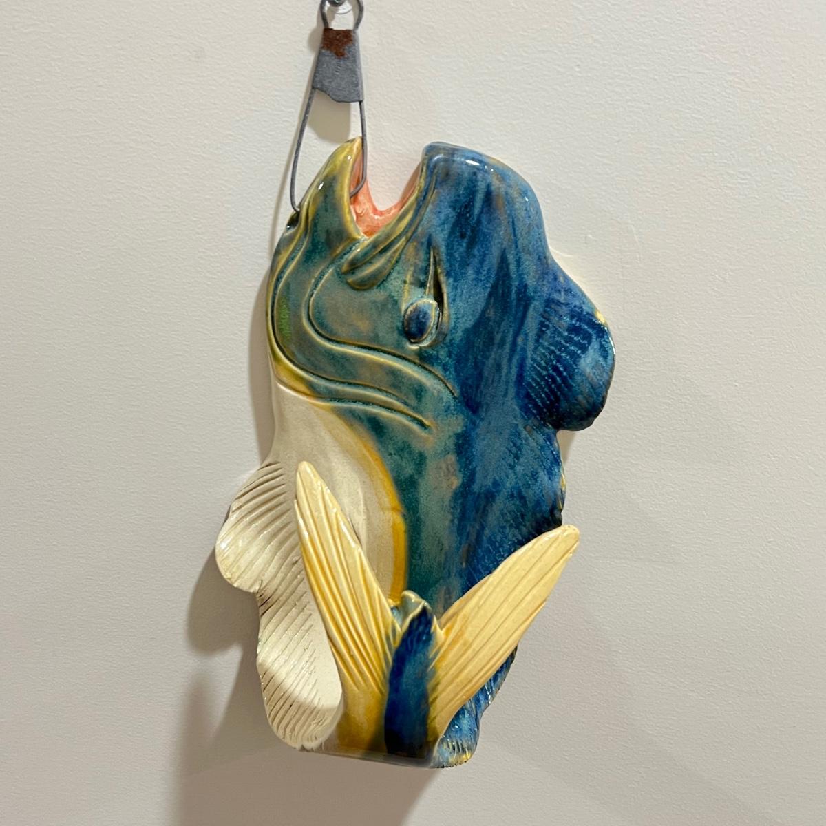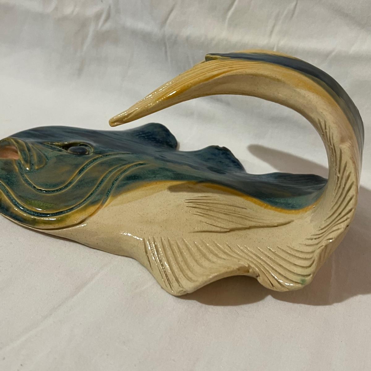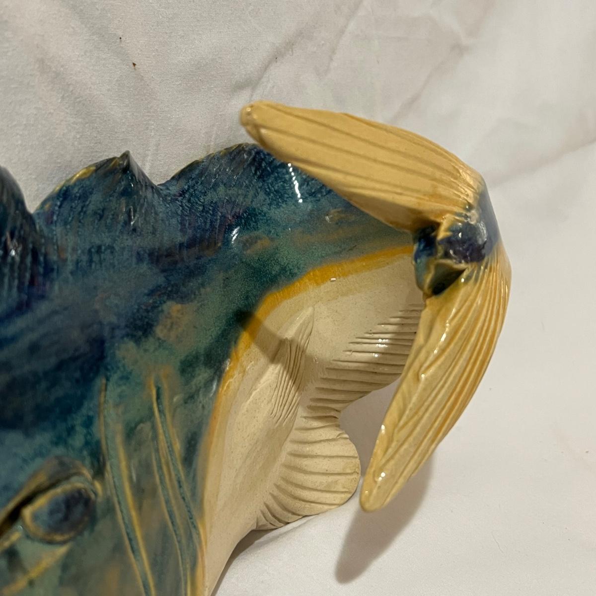 The largest piece in this trio of pottery is the whale who measures 6” x 4” x 10” H (not including the hook length) and it’s signed with an indecipherable signature; a small fish and a shell shaped coat hook completes this lot.