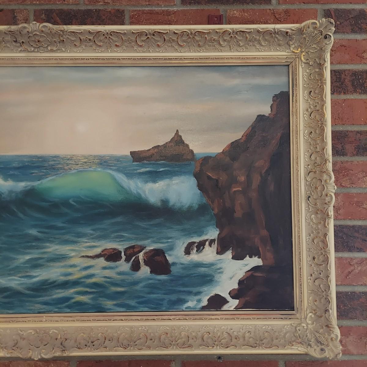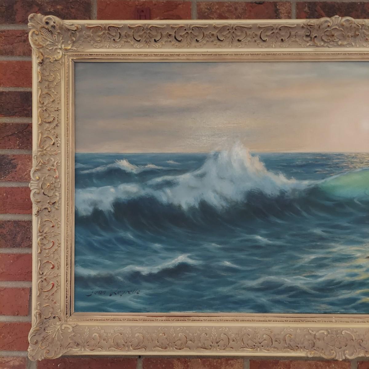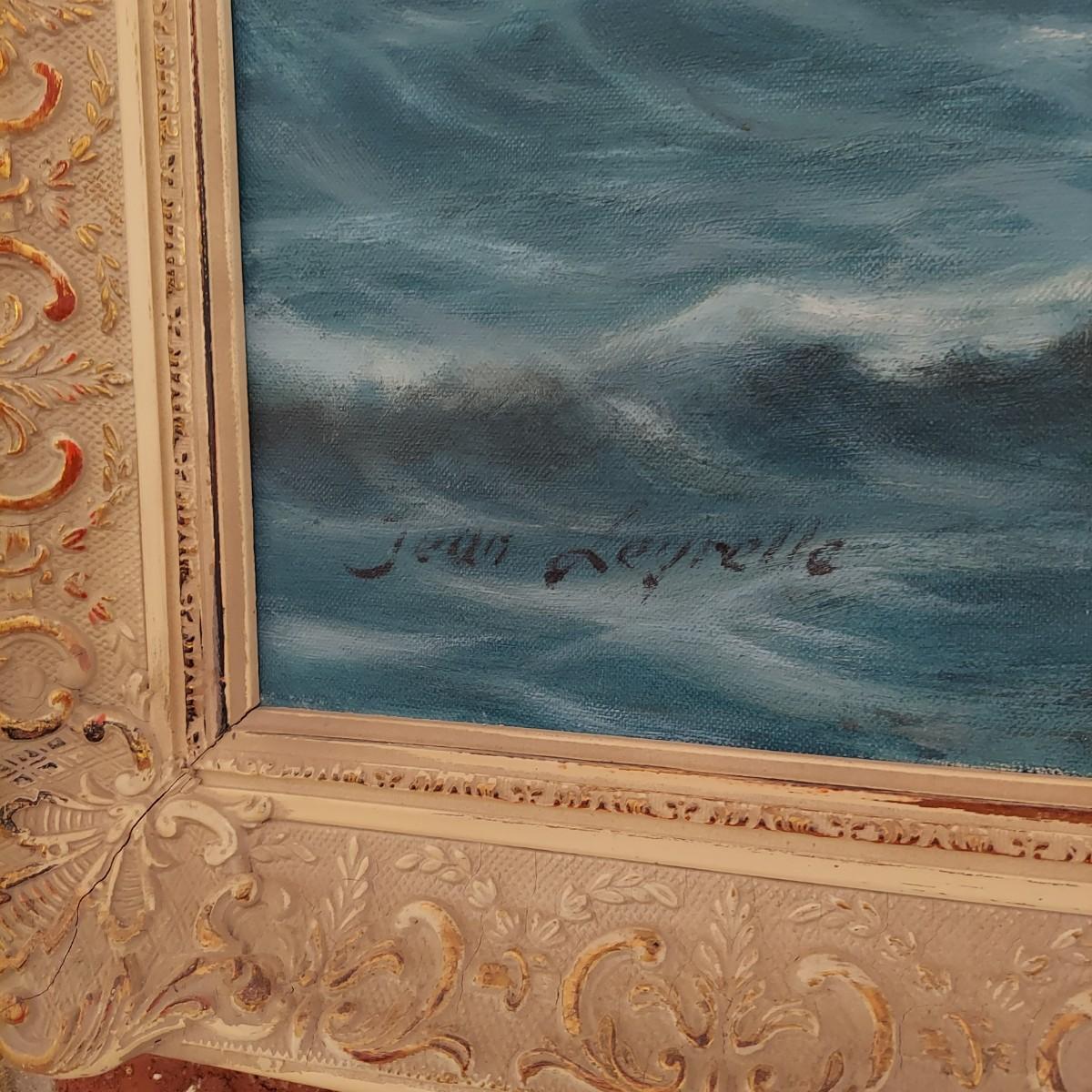 Large framed oil painting of ocean landscape. The frame is wooden with gold tone details. It measures 45" X 26"H. There is some overall cracking through the the frame details. Signature appears to read "Jean Leyrelle". Shipping available. Shipping certain items can be costly. We suggest contacting our preferred local shipping provider, Postage Express, with dimensions and getting an estimate before bidding: (828) 670-5501 or postageexpress@yahoo.com.