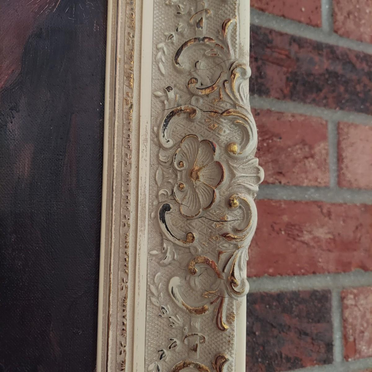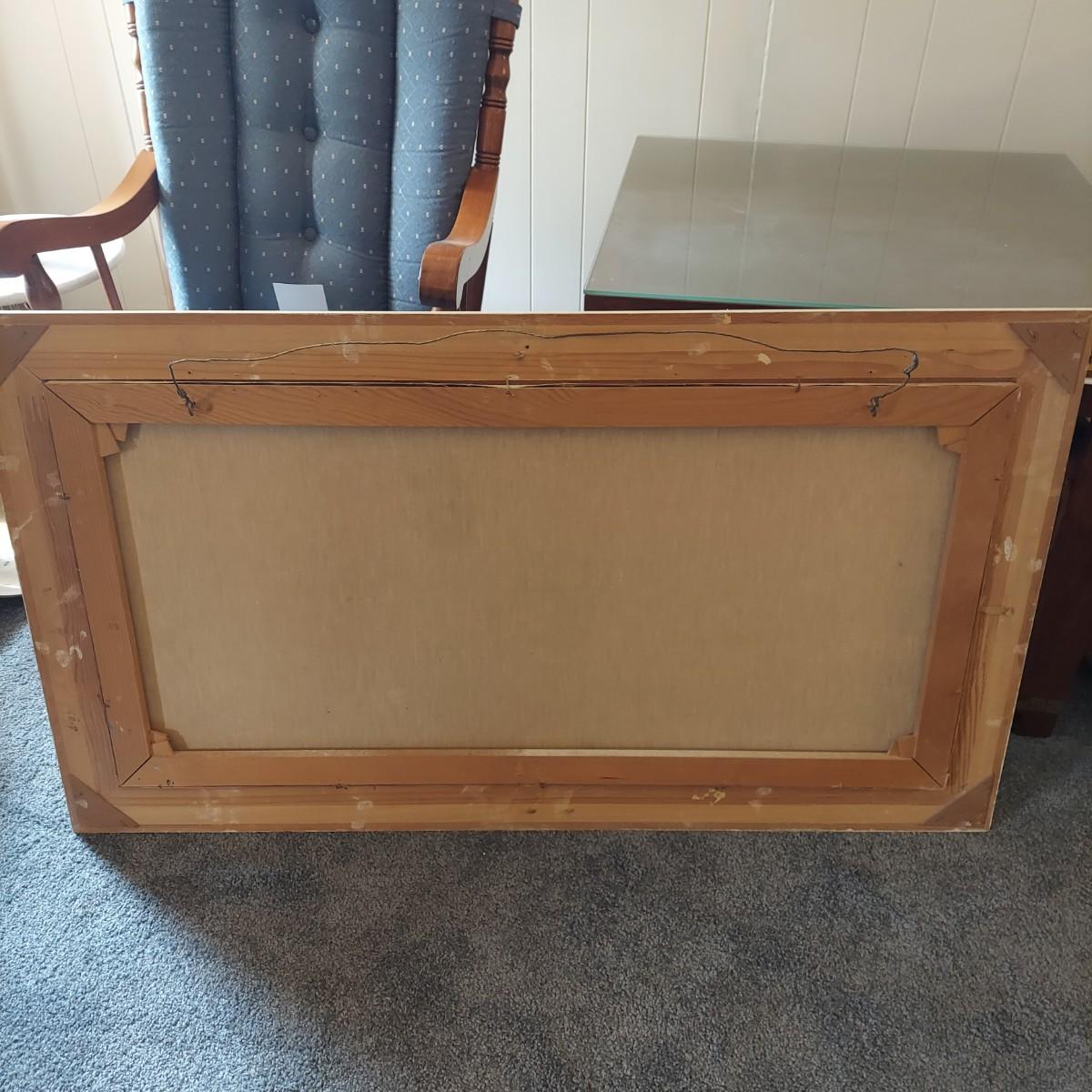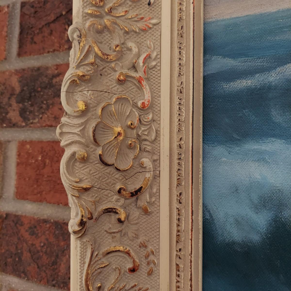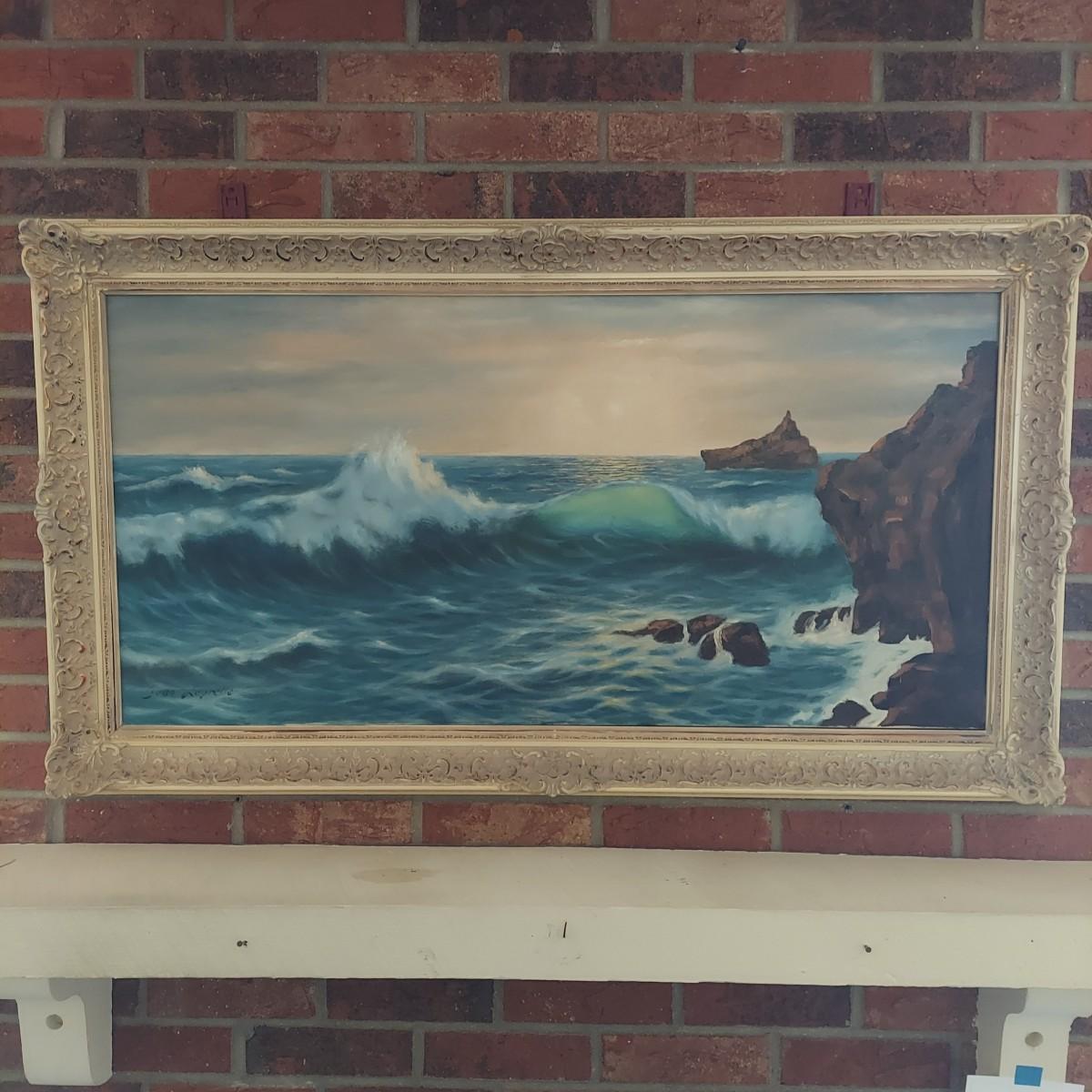 Large framed oil painting of ocean landscape. The frame is wooden with gold tone details. It measures 45" X 26"H. There is some overall cracking through the the frame details. Signature appears to read "Jean Leyrelle". Shipping available. Shipping certain items can be costly. We suggest contacting our preferred local shipping provider, Postage Express, with dimensions and getting an estimate before bidding: (828) 670-5501 or postageexpress@yahoo.com.