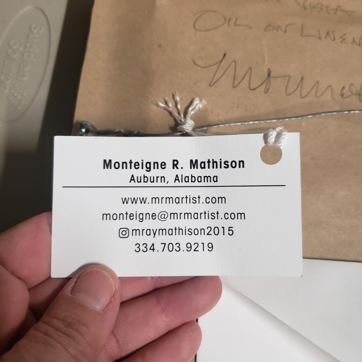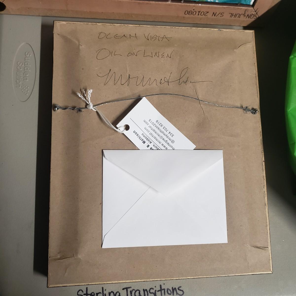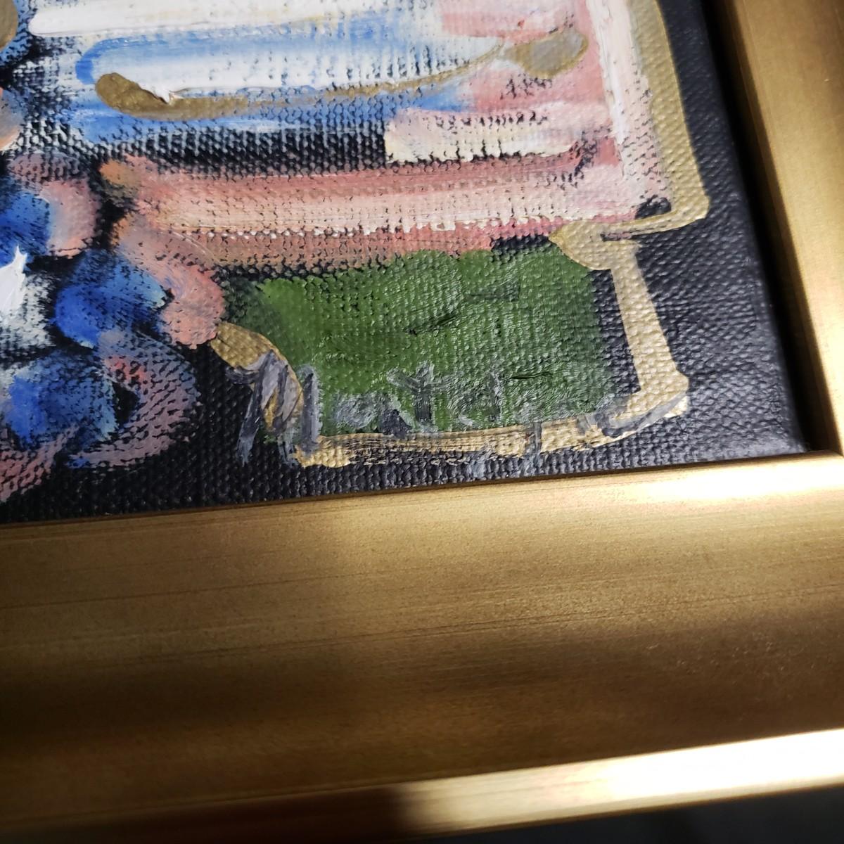 This appears to be an oil painting on linen called "Ocean Vista" by Monteigne Mathison. The gold wooden frame, without glass measures 10.5" x 12.5". The paint has a textured look to it.