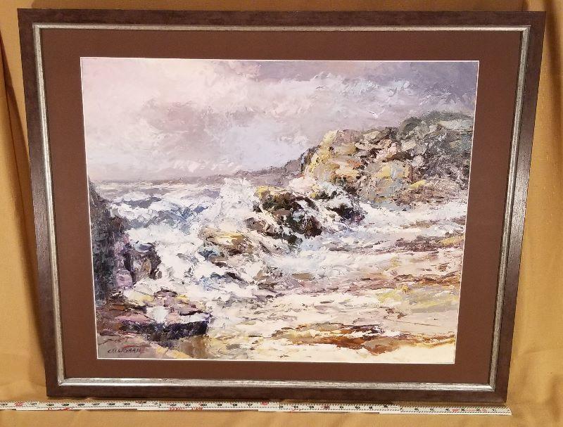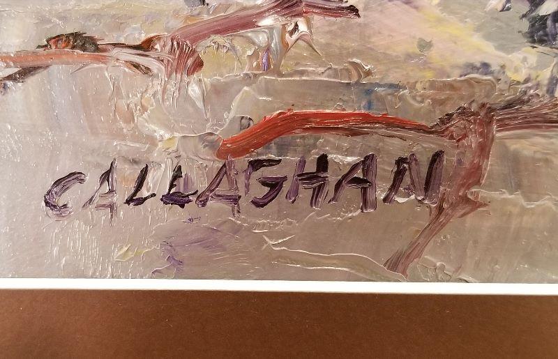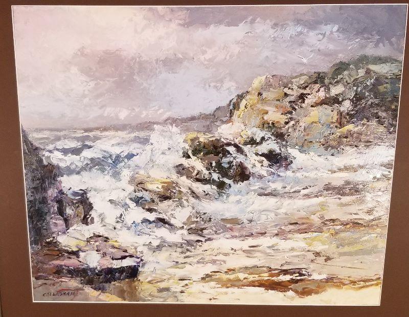 This painting by listed artist Robert Janes Callaghan is entitled “Ocean Textures” ““ The painting is nicely stretched and well framed. It was purchased by the seller from the artist in Singapore about 12 years ago for around $800.00. Overall size is 30 ½-inches wide X 25-inches tall