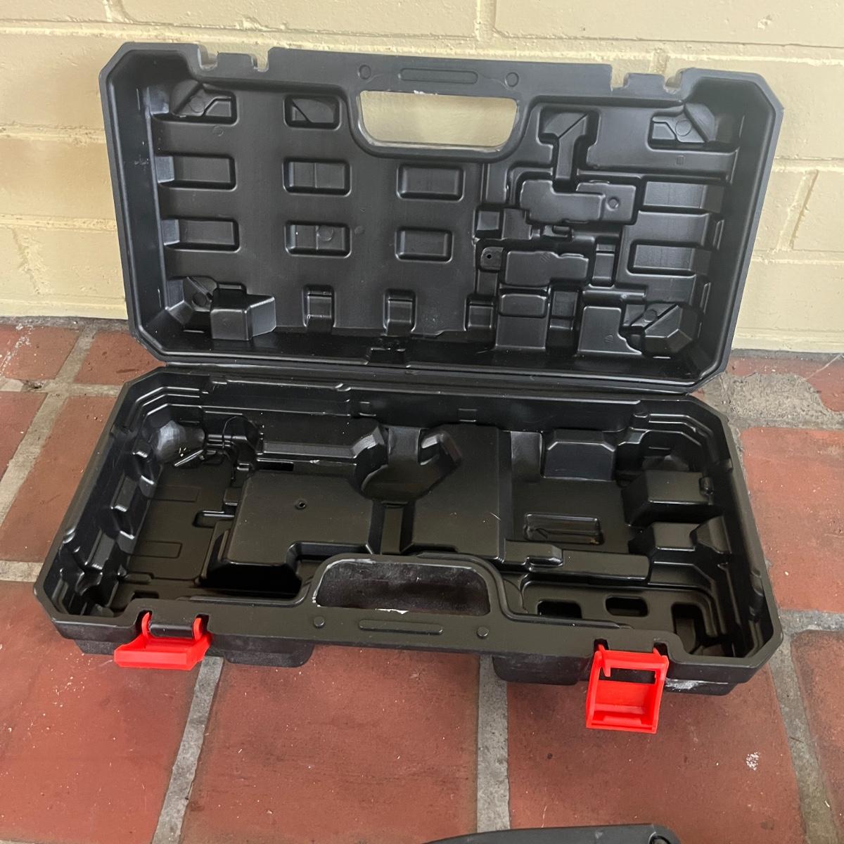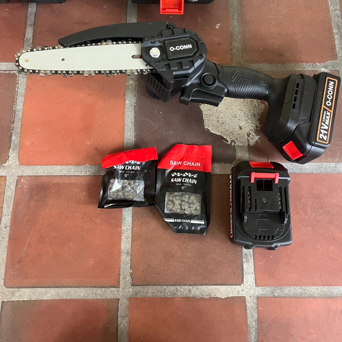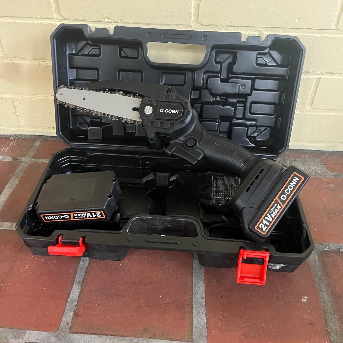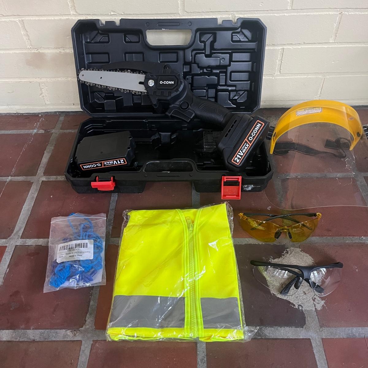 Lot includes a O-CONN handheld portable mini chainsaw with carrying case and two batteries. Case measures 15” x 8” x 5”H. The 21V lithium max battery packs require a battery charger that is not included. See photo for charge port, should be an easy replacement. Chainsaw was unable to be tested without charged batteries. Also included are gloves, safety glasses, two safety vests and ear plugs.