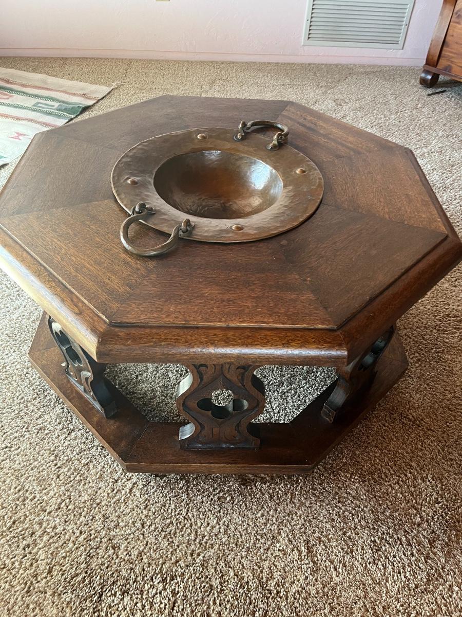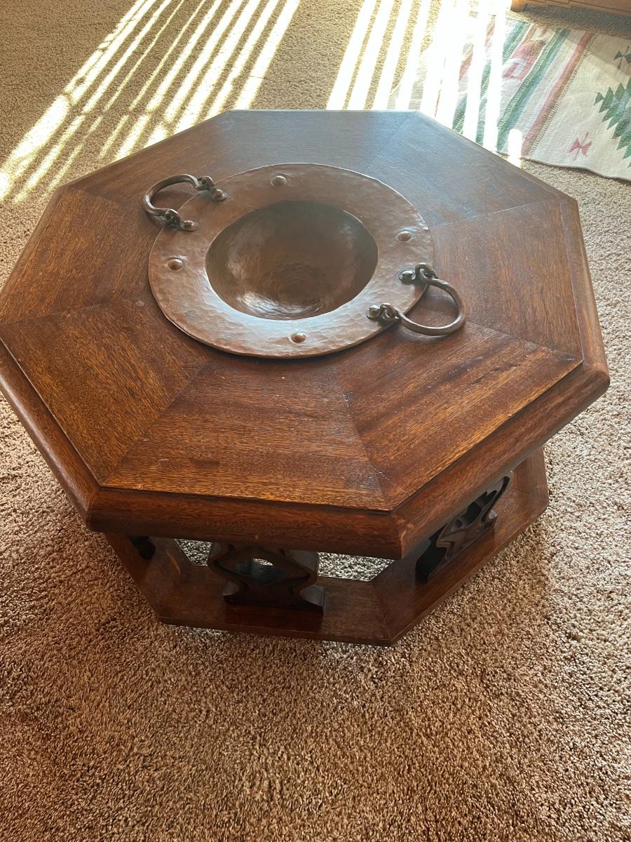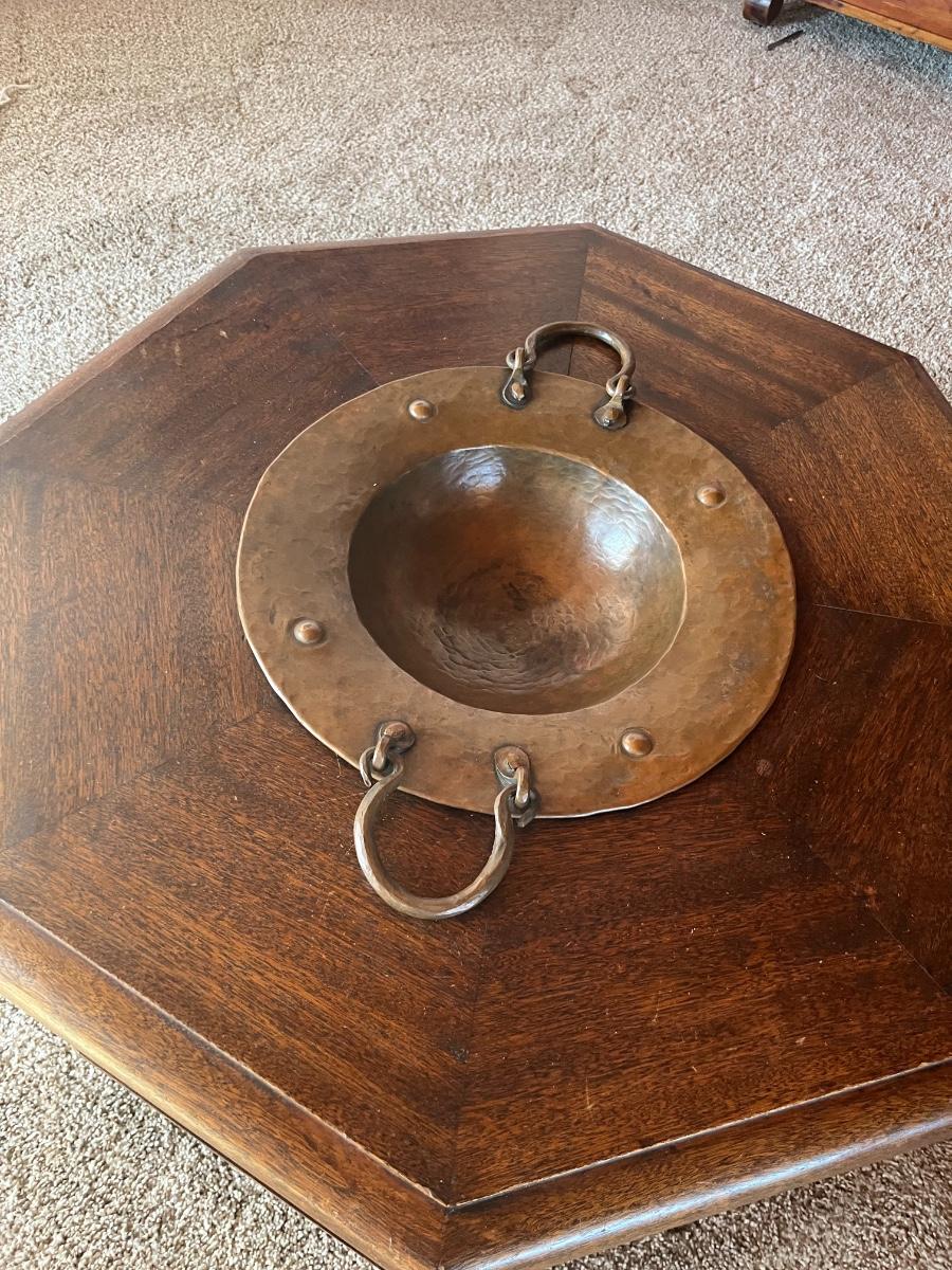 Octagon Shaped Coffee Table with Copper Bowl - carved shamrocks on the bottom
