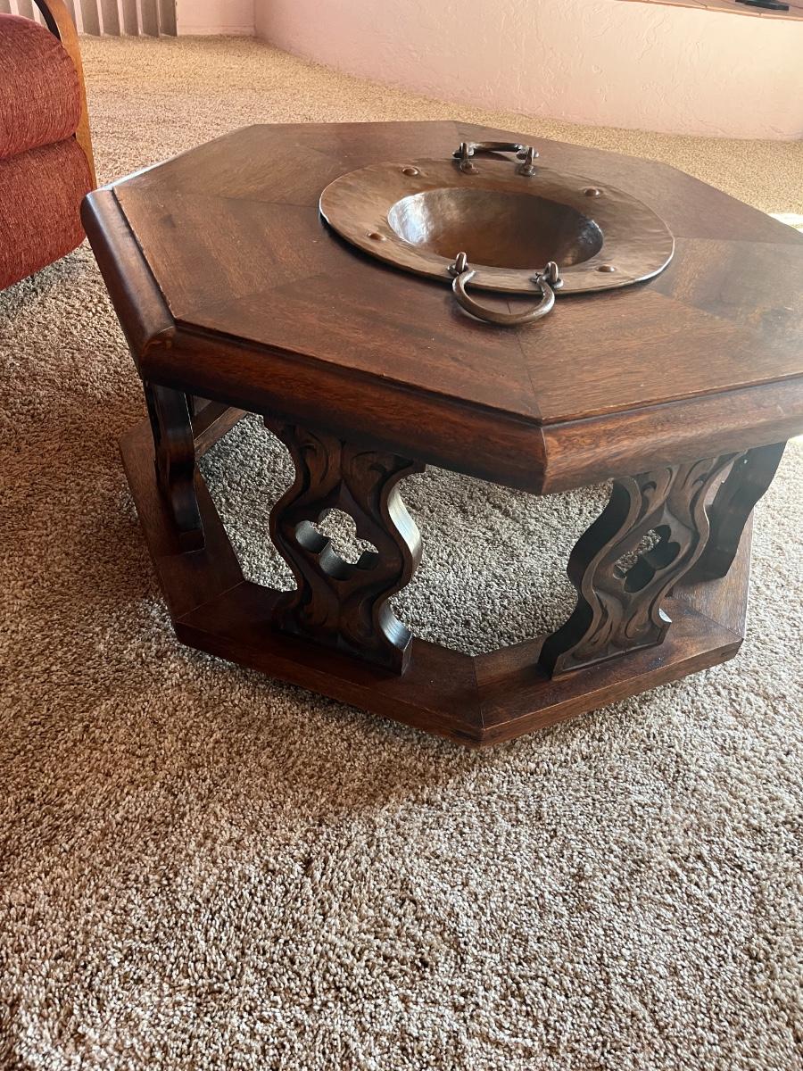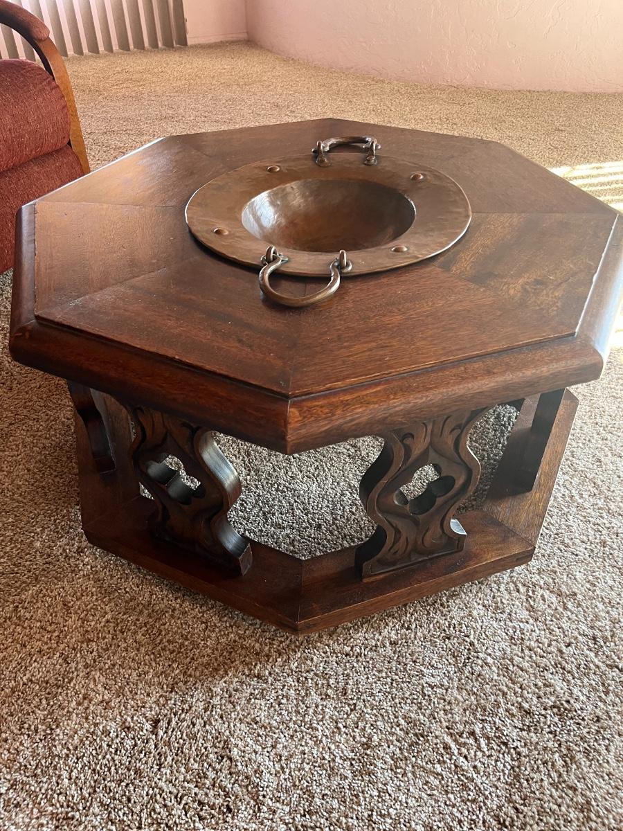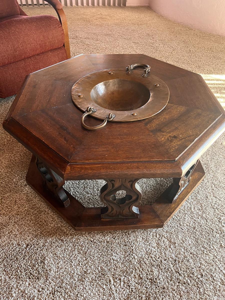 Octagon Shaped Coffee Table with Copper Bowl - carved shamrocks on the bottom