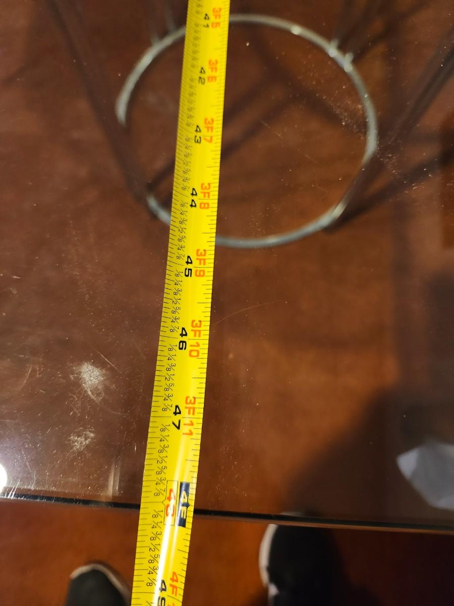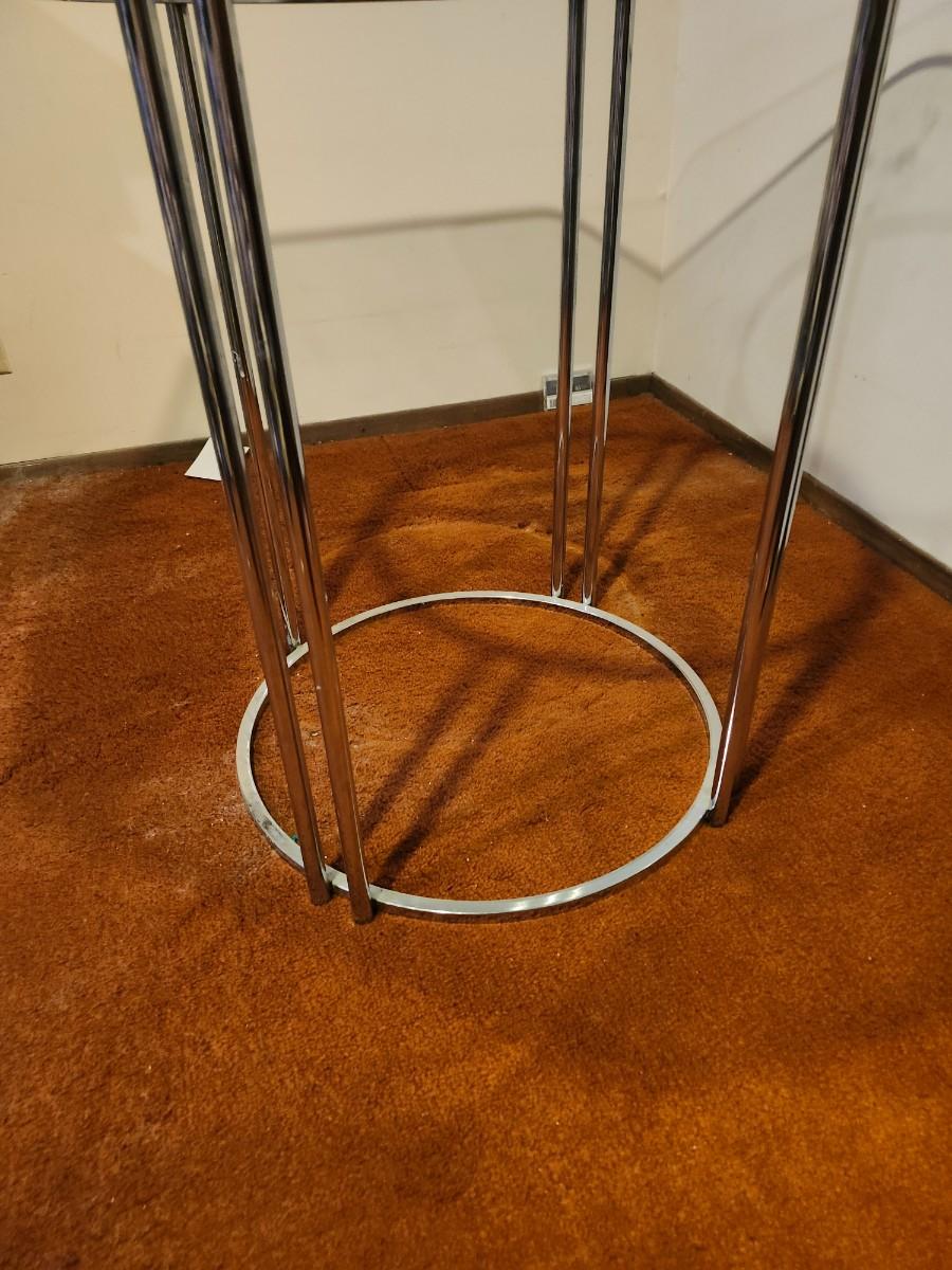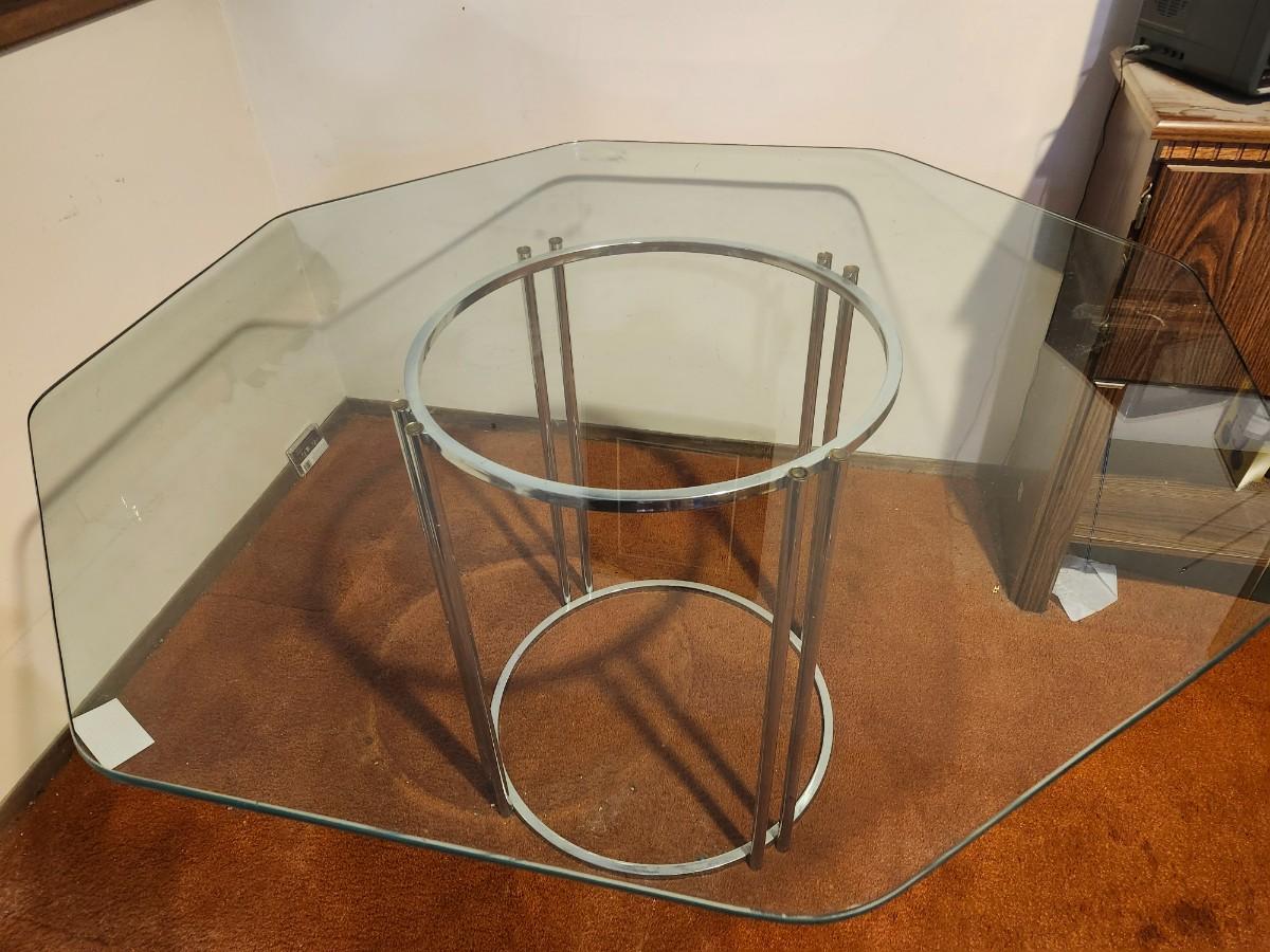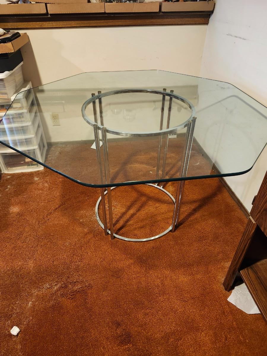 Octagonal glass dining table with chrome base (thick heavy glass top 1/2 inch ), measures 48” in diameter x 29” tall and priced (wear to glass top- some scratches but no chips!)