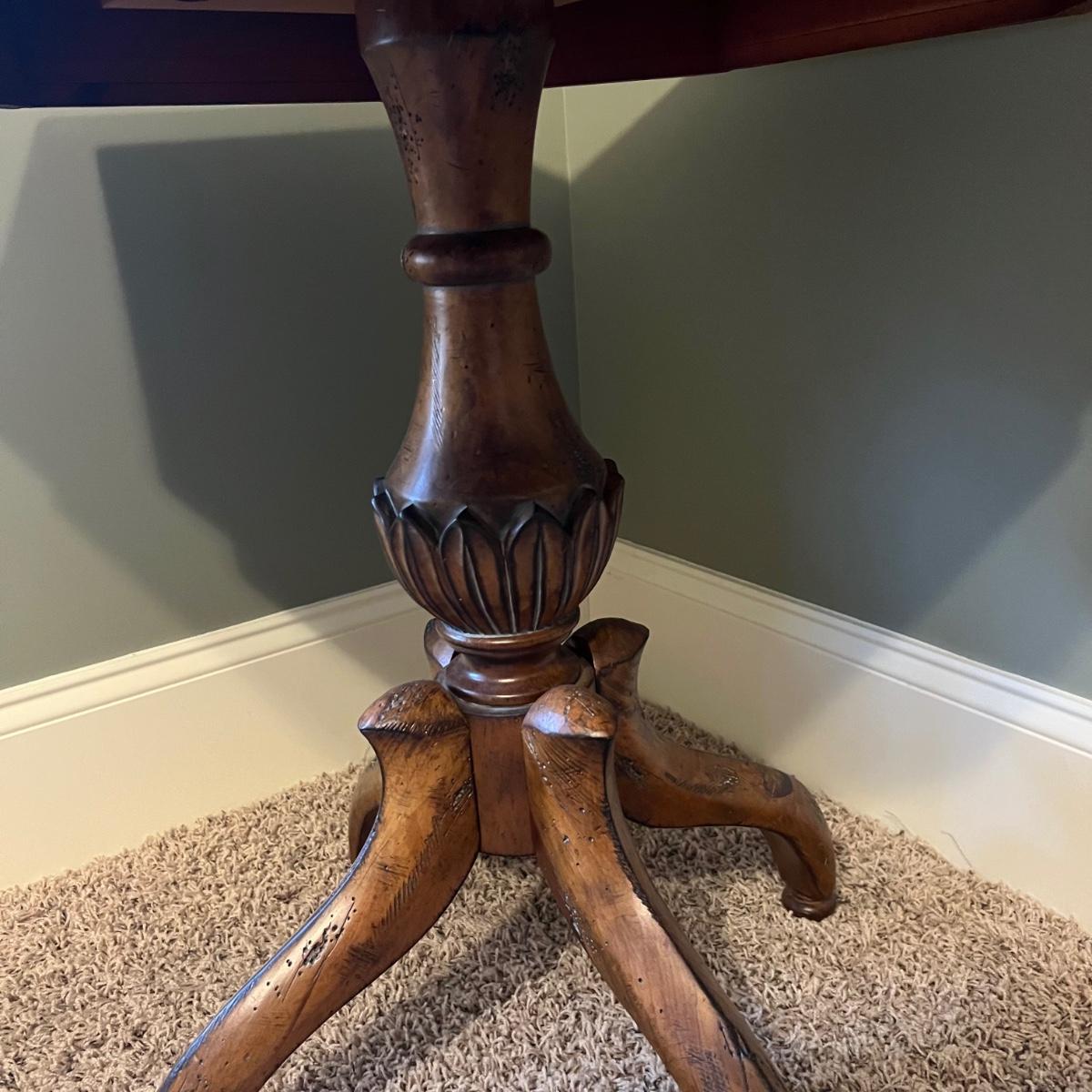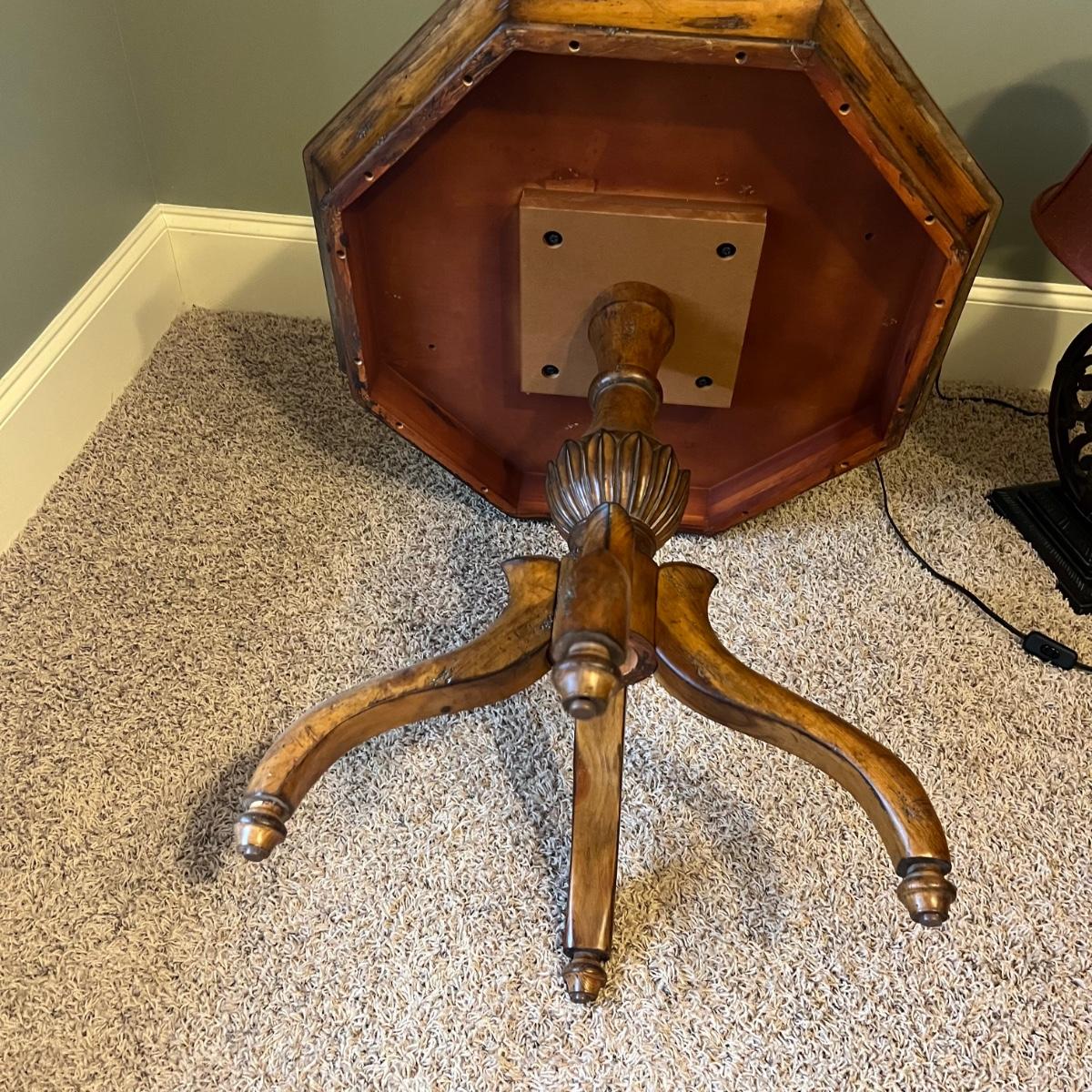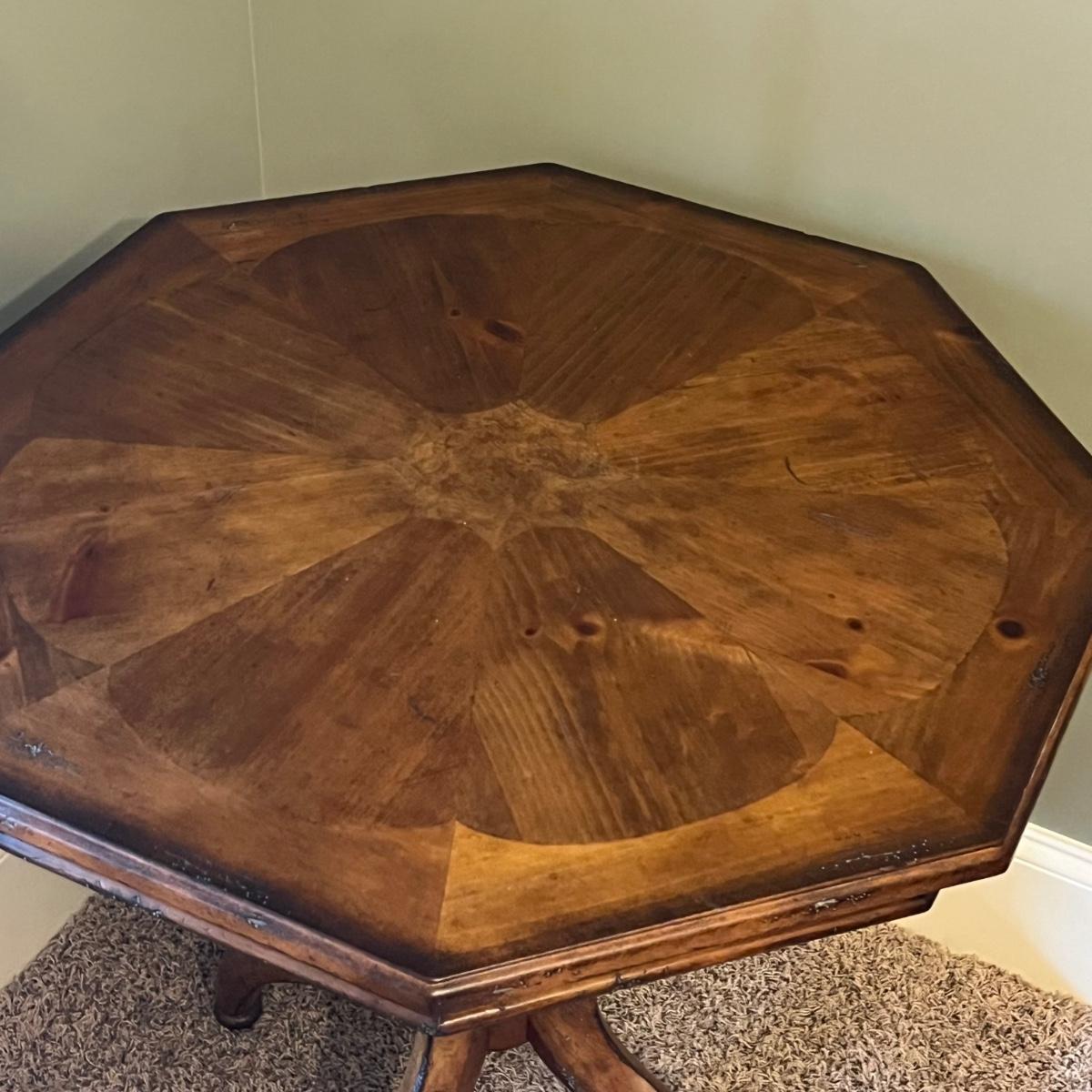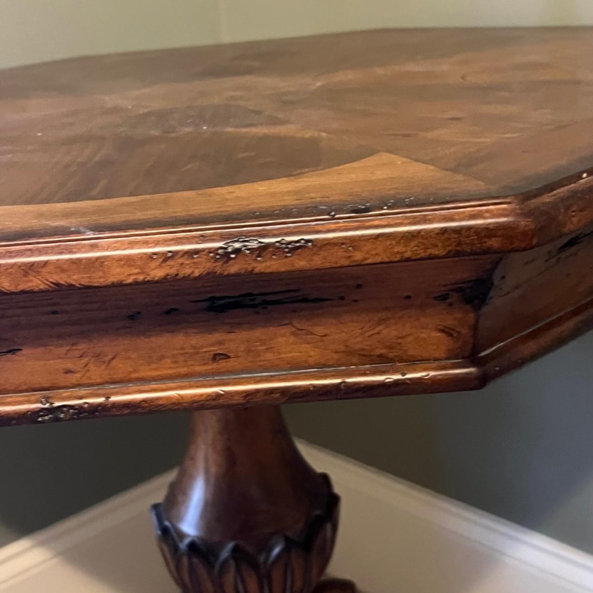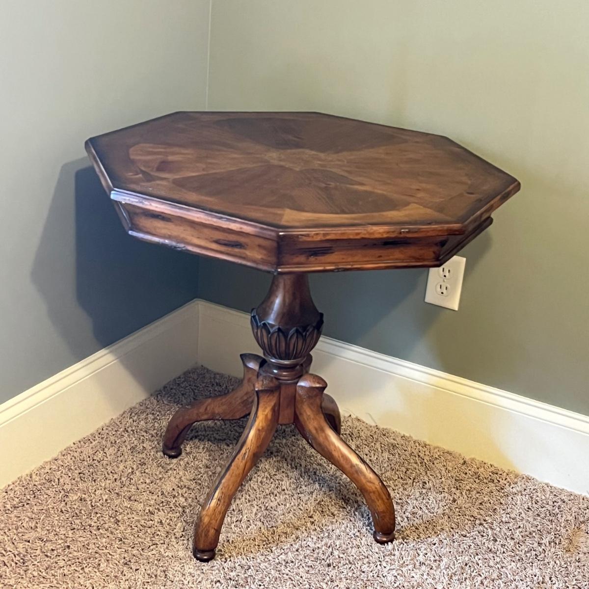 A solid wood pedestal side table with an octagonal shaped top. Table has a distressed finish.