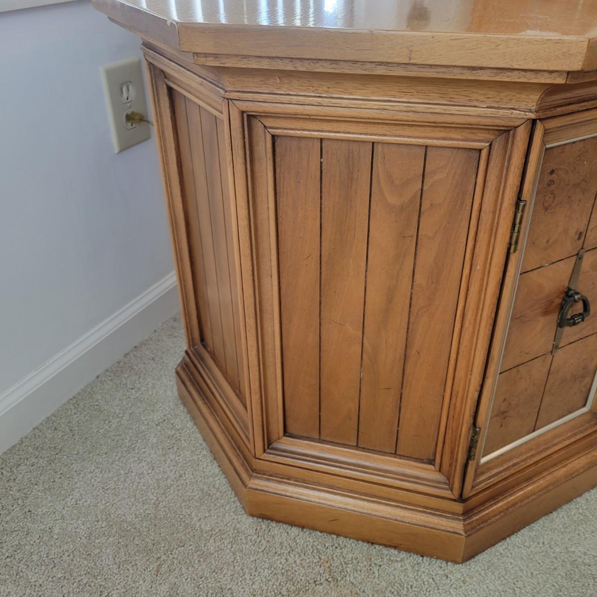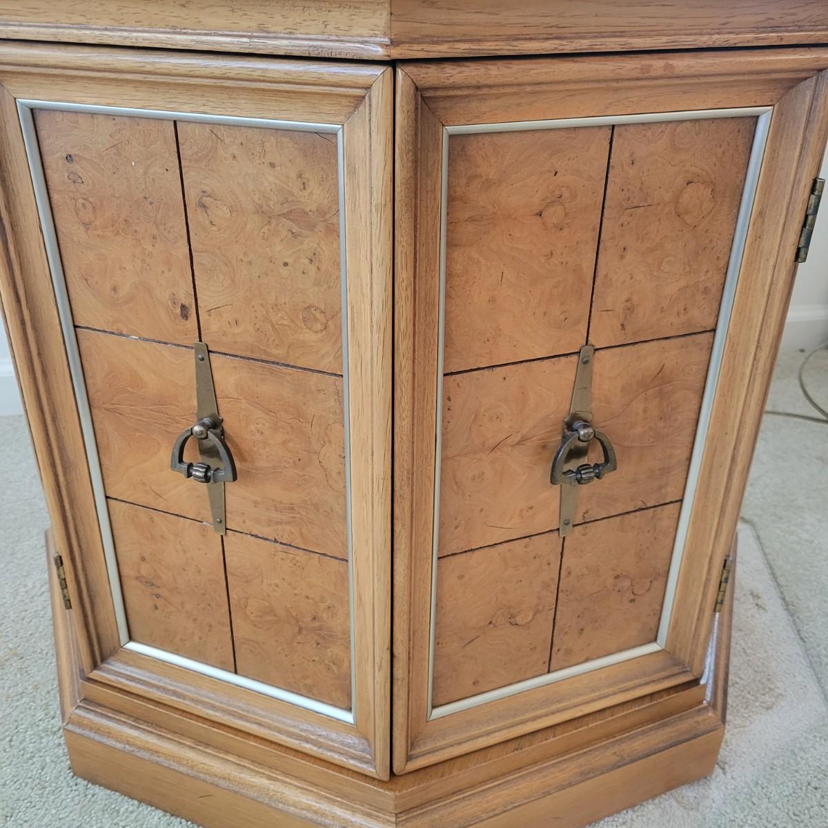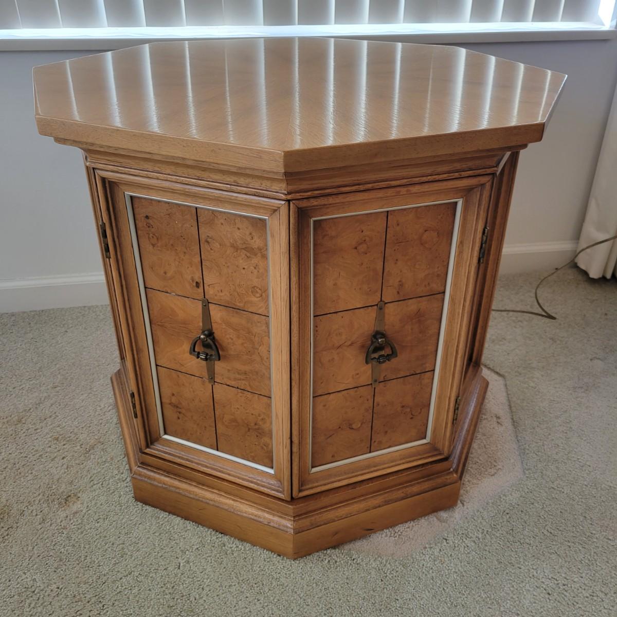 An octagonal solid wood side table. The table features what appears to be brass hardware and birdseye maple on its doors, with silver accents. Measures approximately 28"D x 22"H. Local pickup only