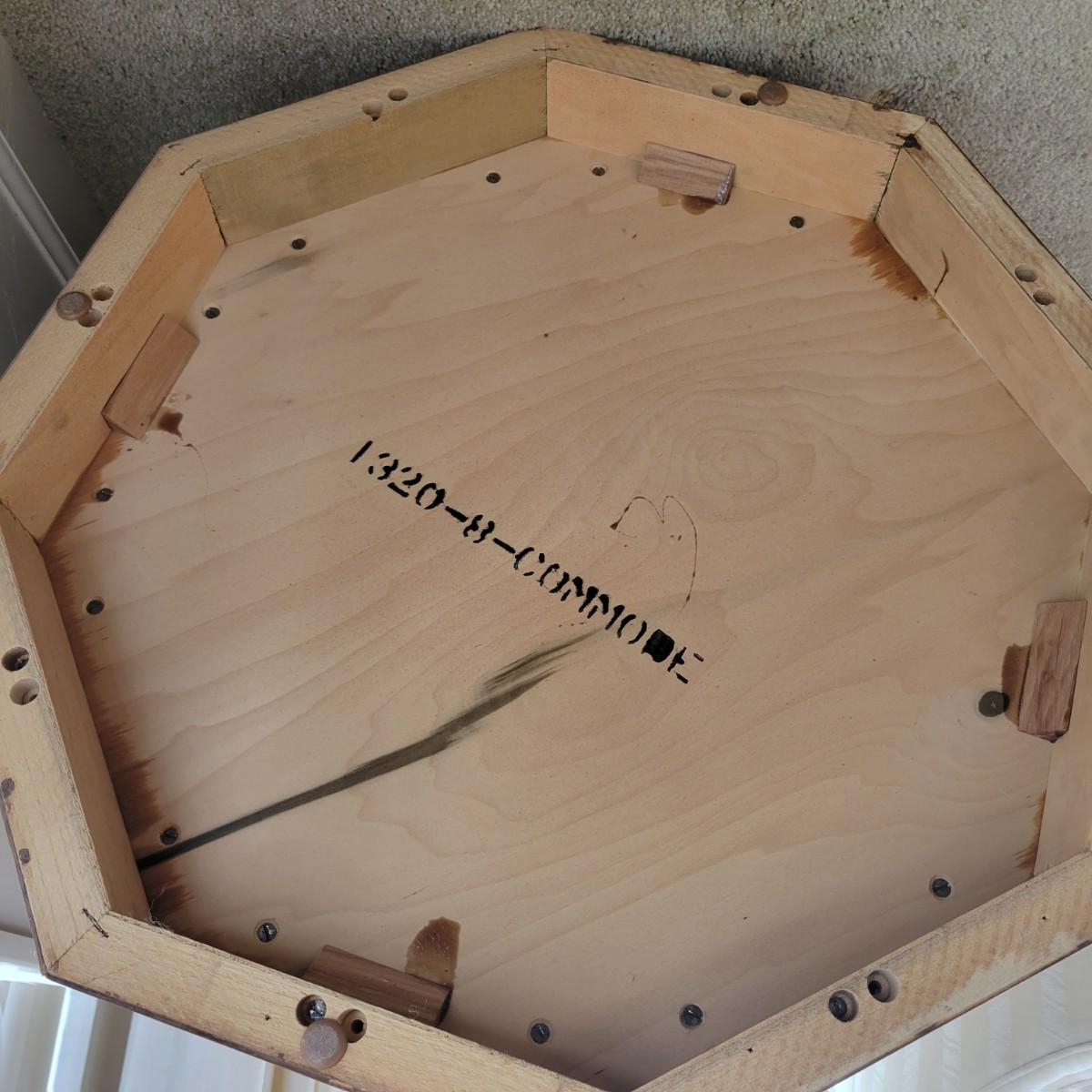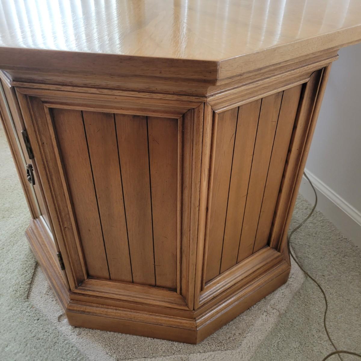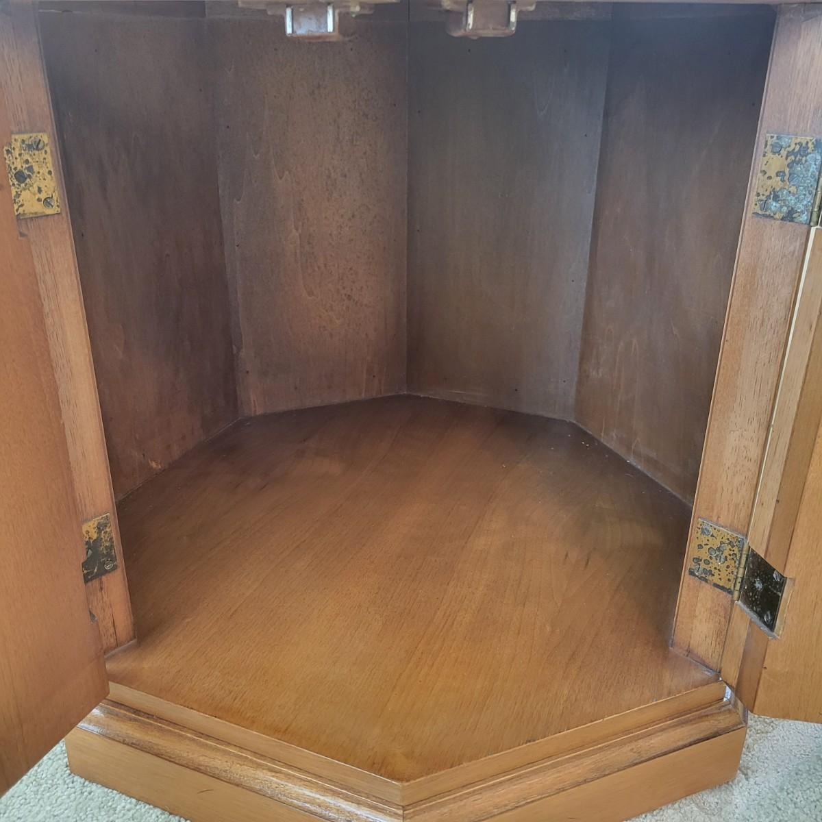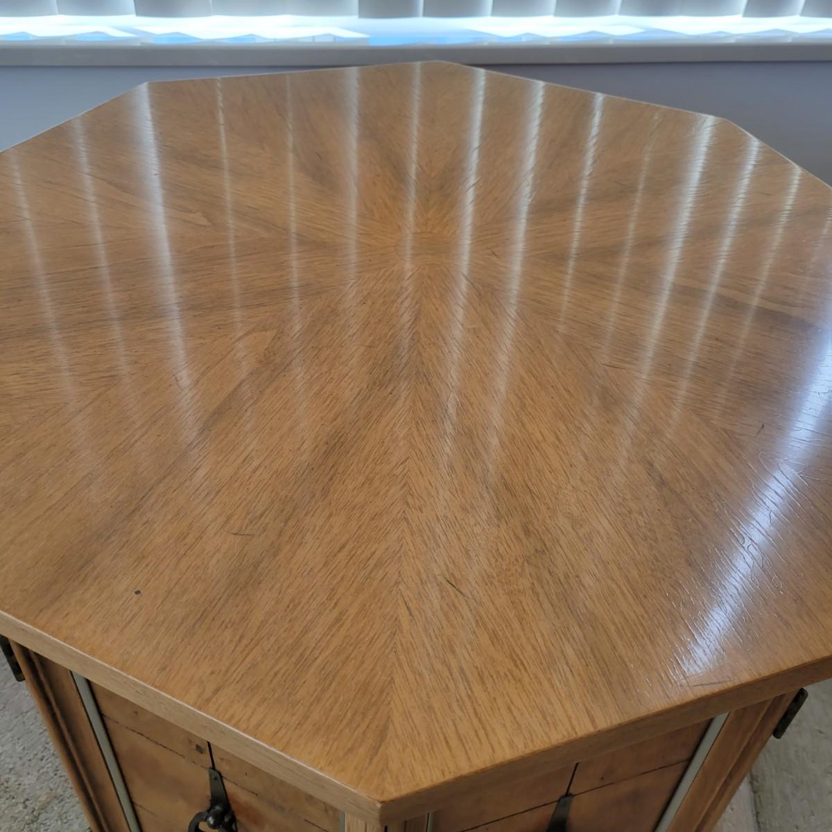 An octagonal solid wood side table. The table features what appears to be brass hardware and birdseye maple on its doors, with silver accents. Measures approximately 28"D x 22"H. Local pickup only