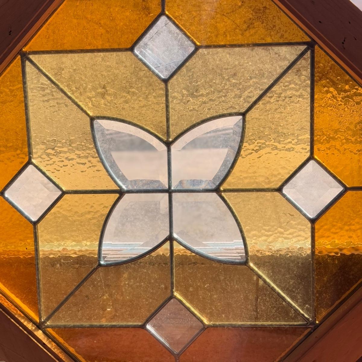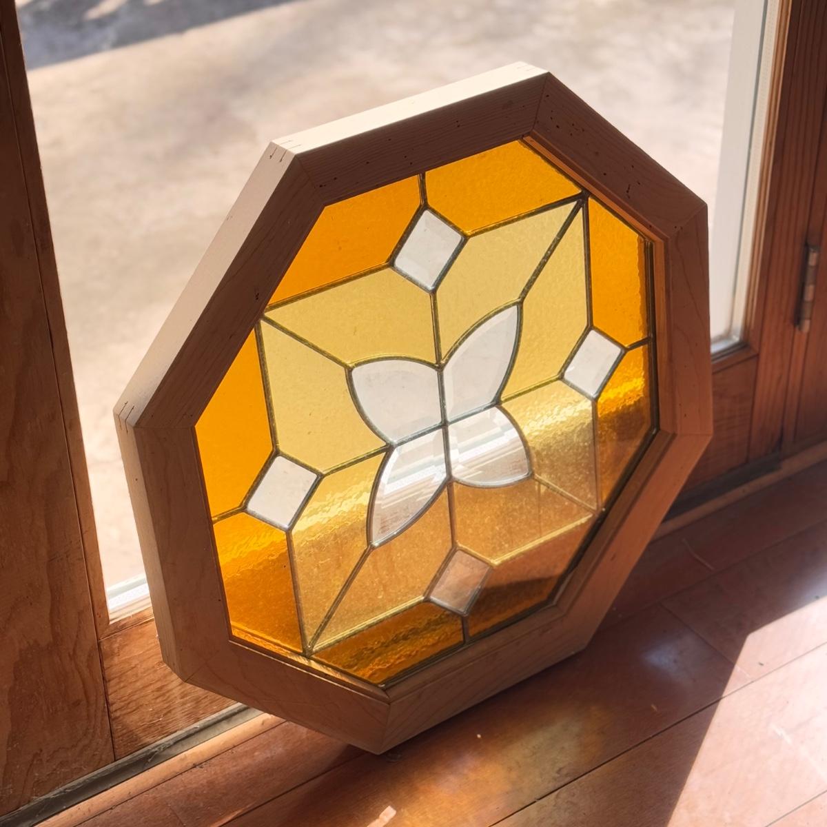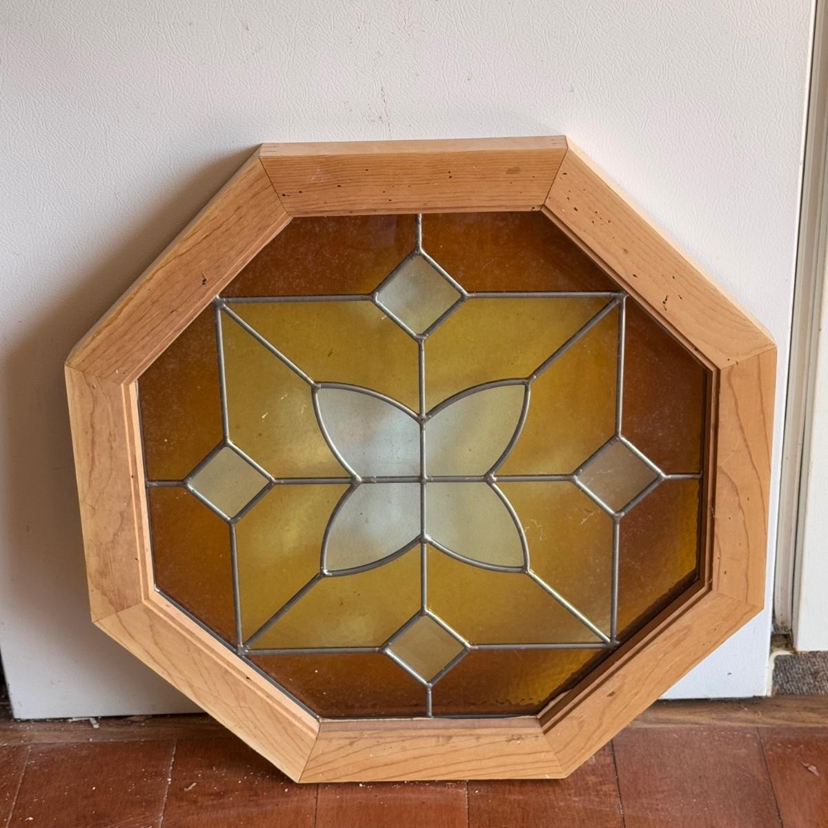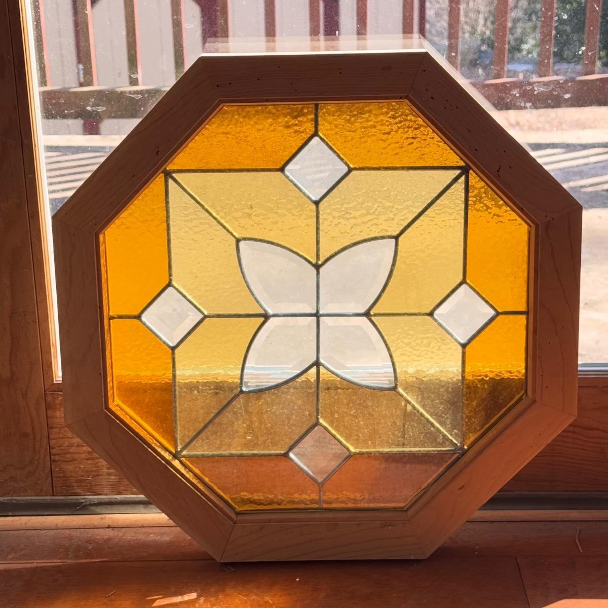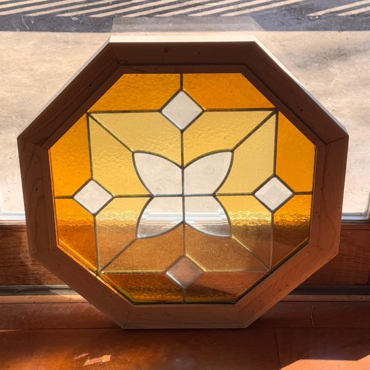 One stunning octagonal stained glass window is included in this lot! The stained glass is protected in a sturdy wooden frame. The frame measures 21.5” x 1.5” x 21.5”H. Shipping available. Shipping can be costly. We suggest contacting our preferred local shipping provider, Postage Express, with dimensions and getting an estimate before bidding: (828) 255-9250 or shipping@postageexpressnc.com.