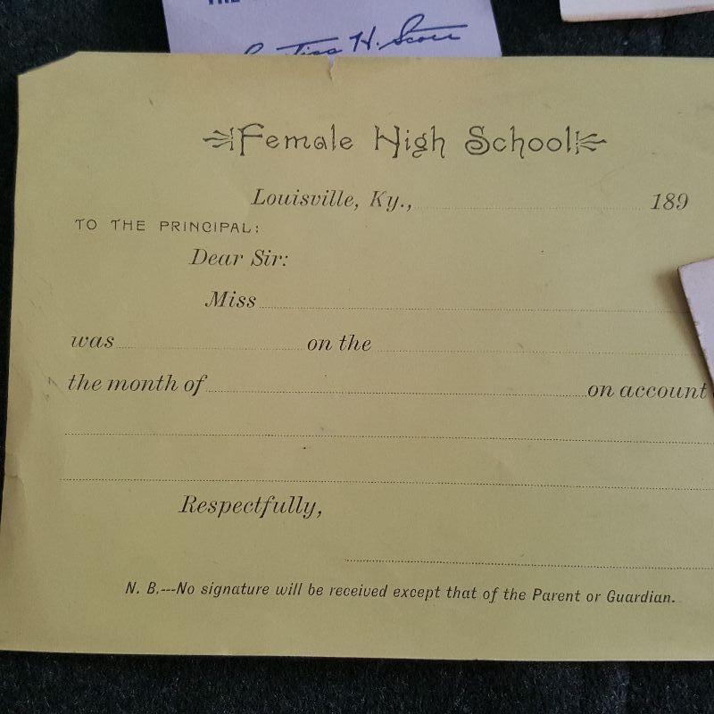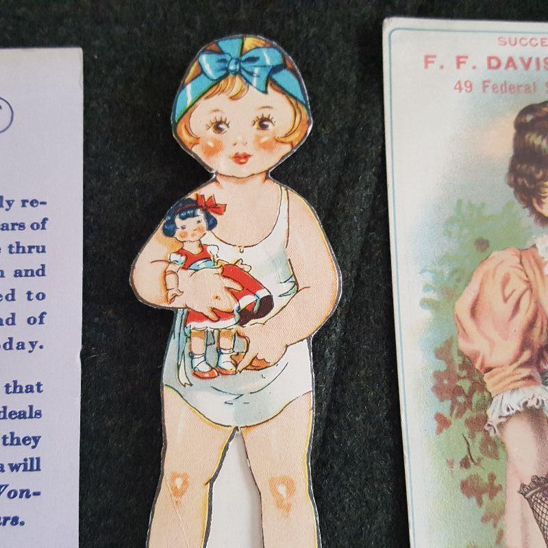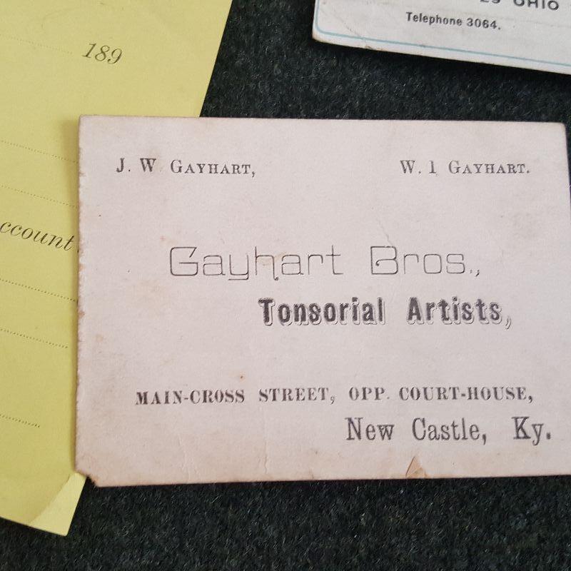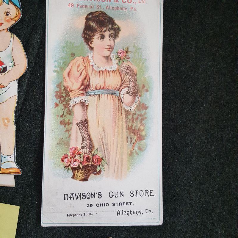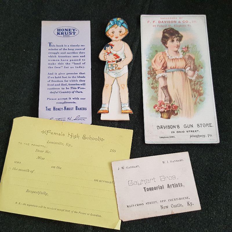 This auction lot is for an odd duck collection of miscellaneous paper goods. There are 5 items offered in the lot. The first is a book mark from Honey Krust Bread, the second is a little girl with dolly paper doll - no printing, next is a blank excuse slip to be used at Louisville, KY Female High School, the fourth item is a advertising card from Davidson's Fun Store in Allegheny, PA and last but not least is a wonderful old business card from the Gayhart Bros. Tonsorial Artists in New Castle, KY. See photos for condition.
