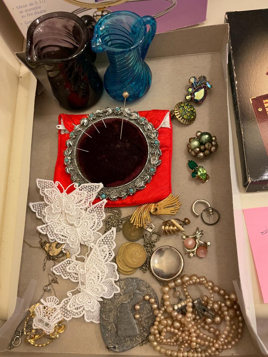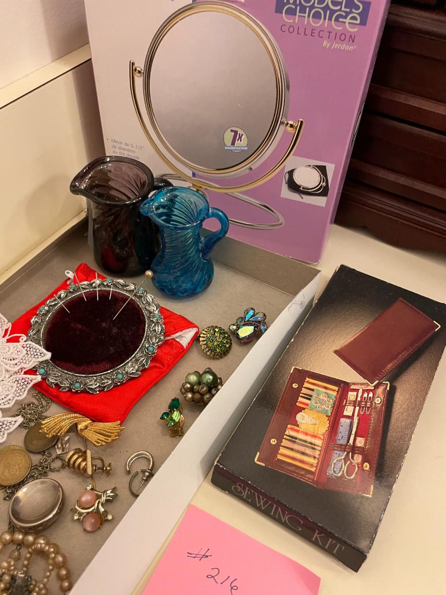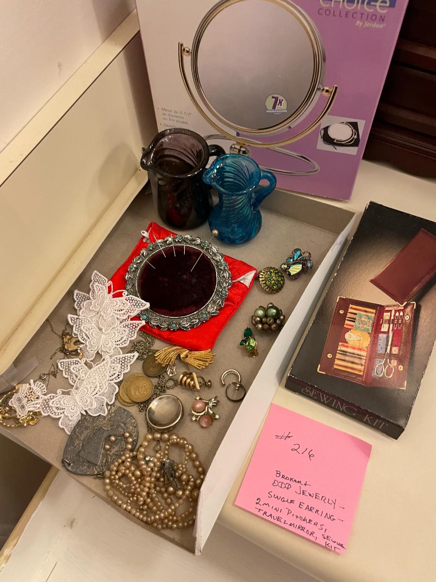 Broken & Odd jewelry plus 1 mirror, sewing kit, vases, etc.
