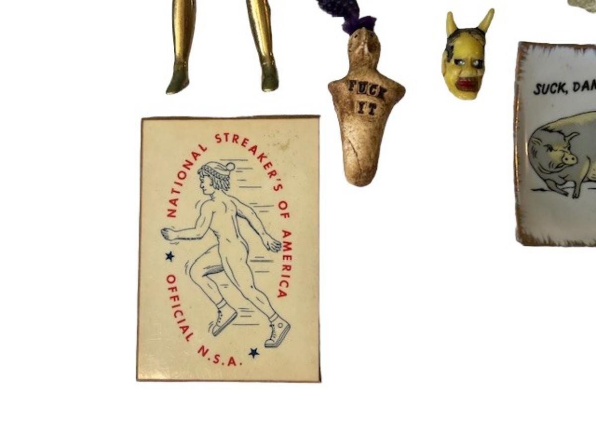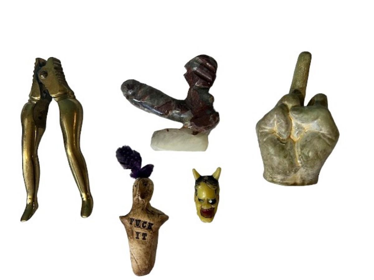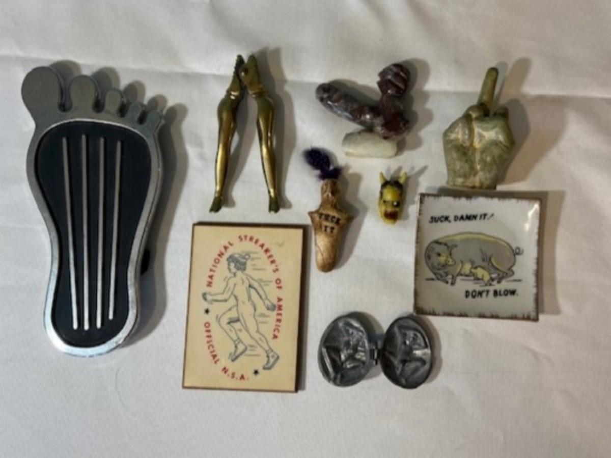 Includes a clam shell naughty, a nutcracker naughty, two plaques, a VW foot pedal, and more. Total of 9 pieces. Measurement of largest: 8.5"L.