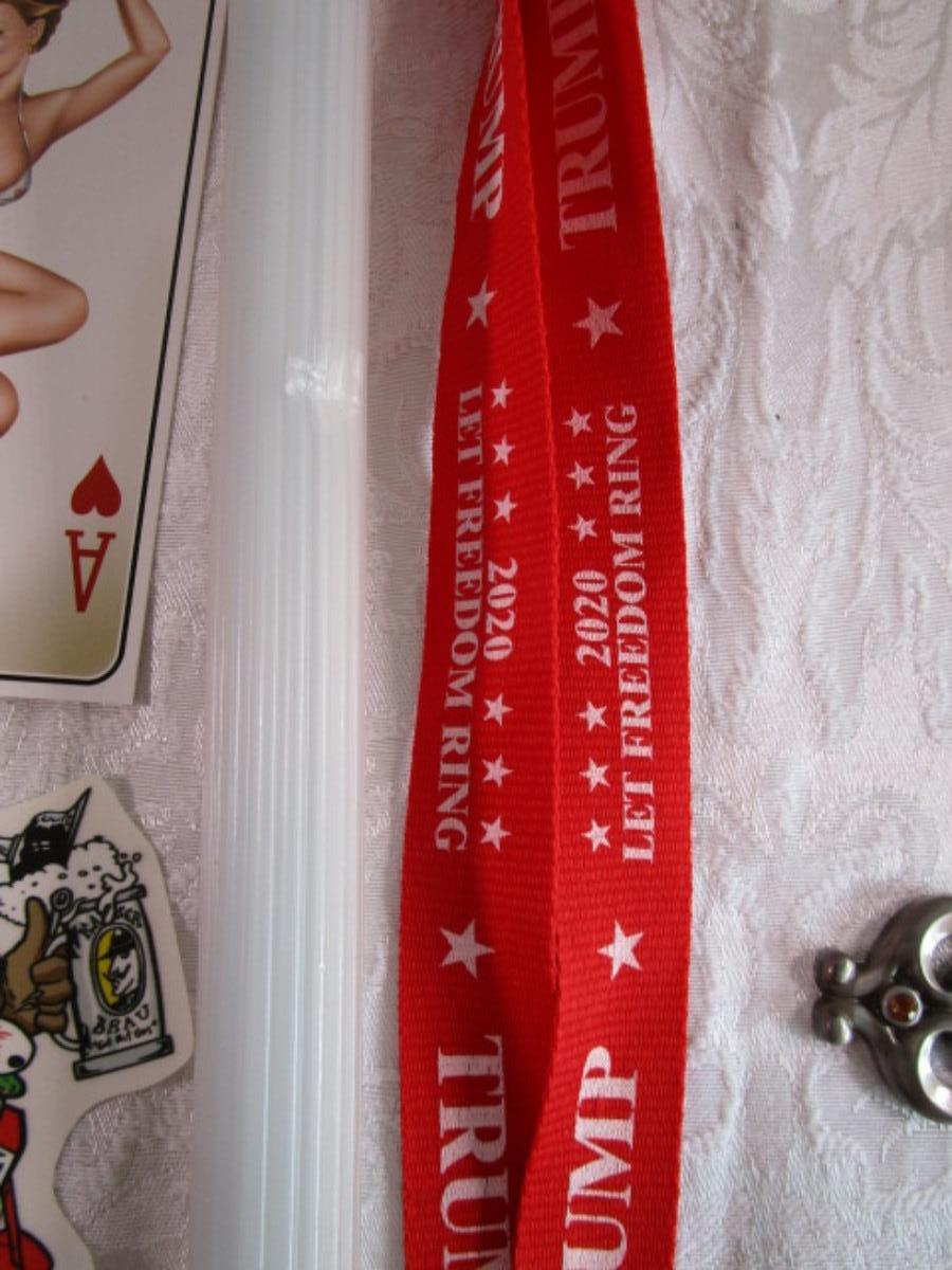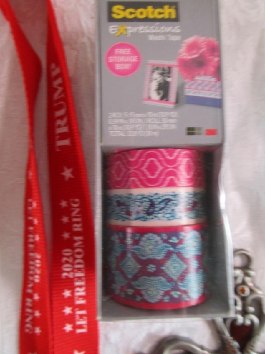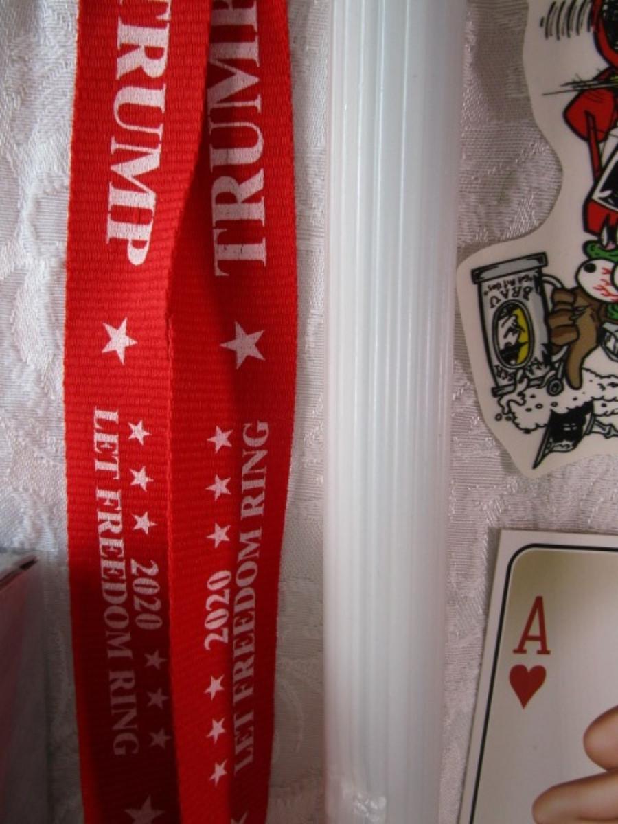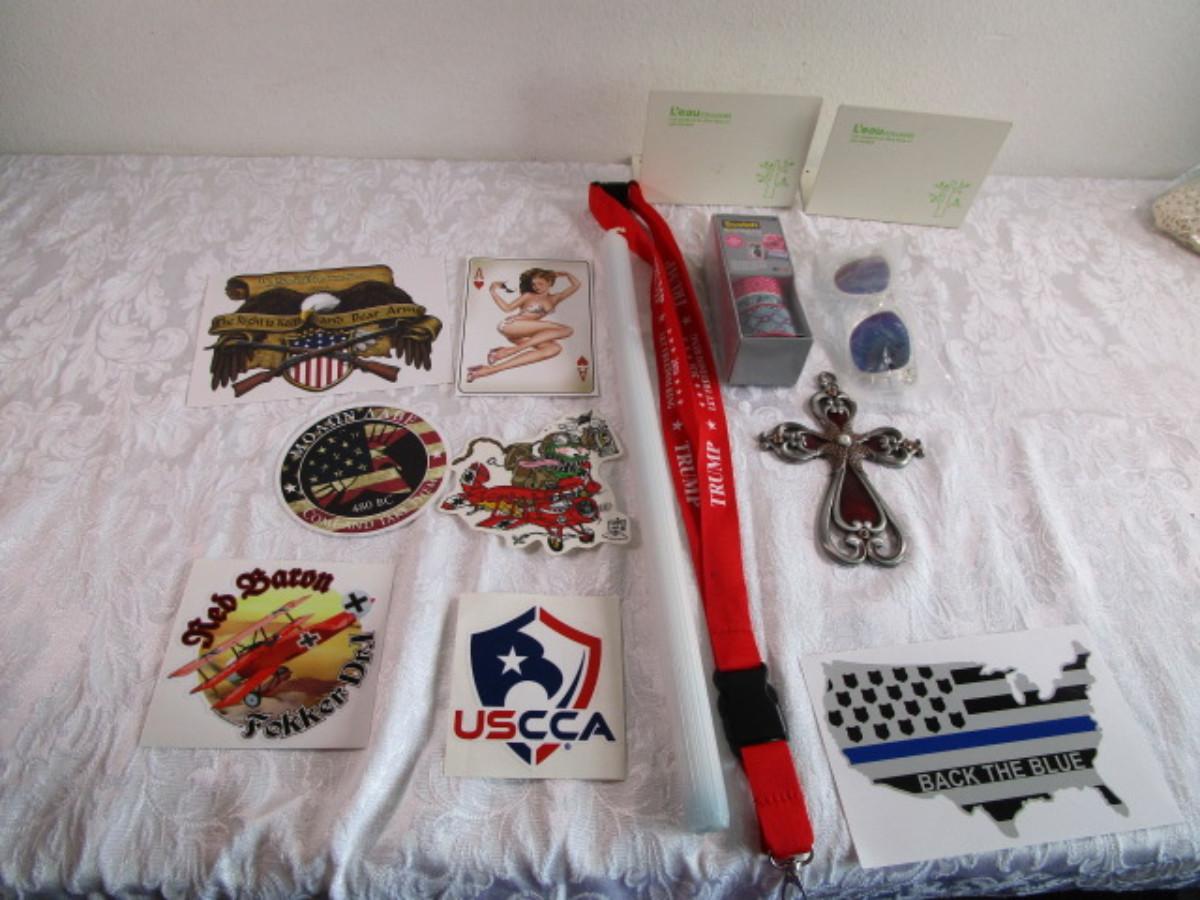 18" candle, 6 large stickers, 2020 Trump lanyard, metal cross, 1 pr sunglasses, 1 set of bookends, box of washi tape, 1 postcard