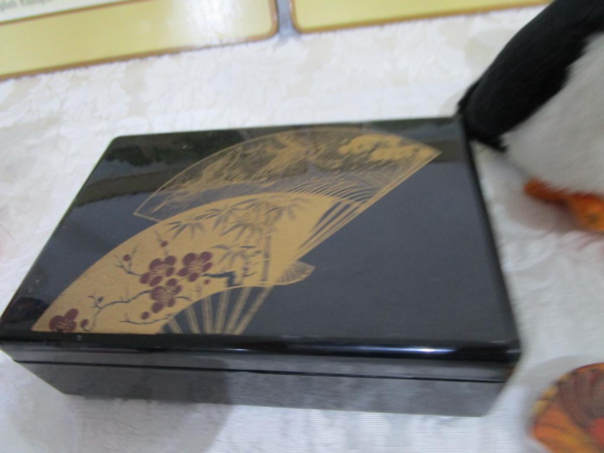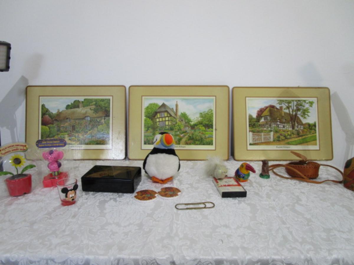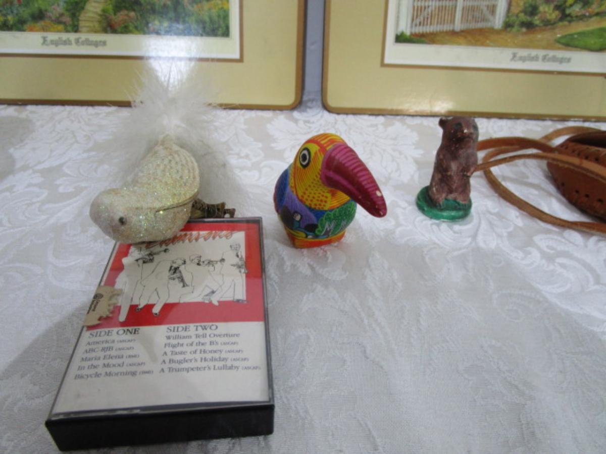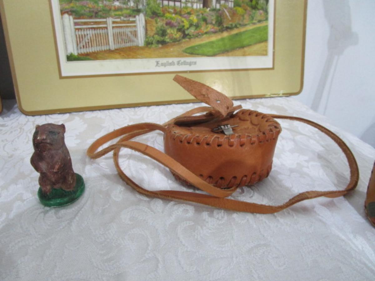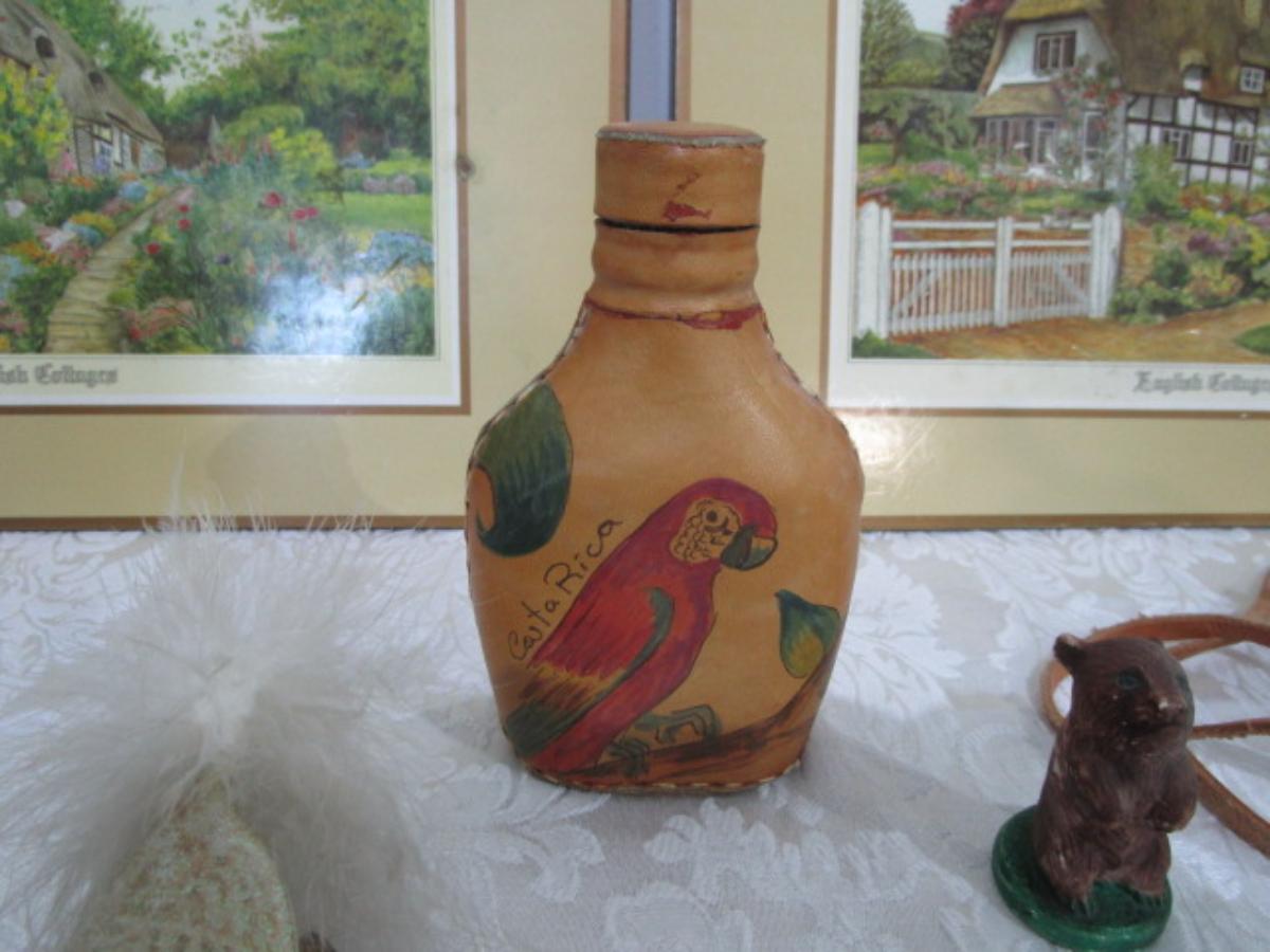 Leather pouch, noise making puffin, picture placemats, bottle with leather case from Costa Rica, figurines, Disney shot glass, oriental box, 2 solar figures