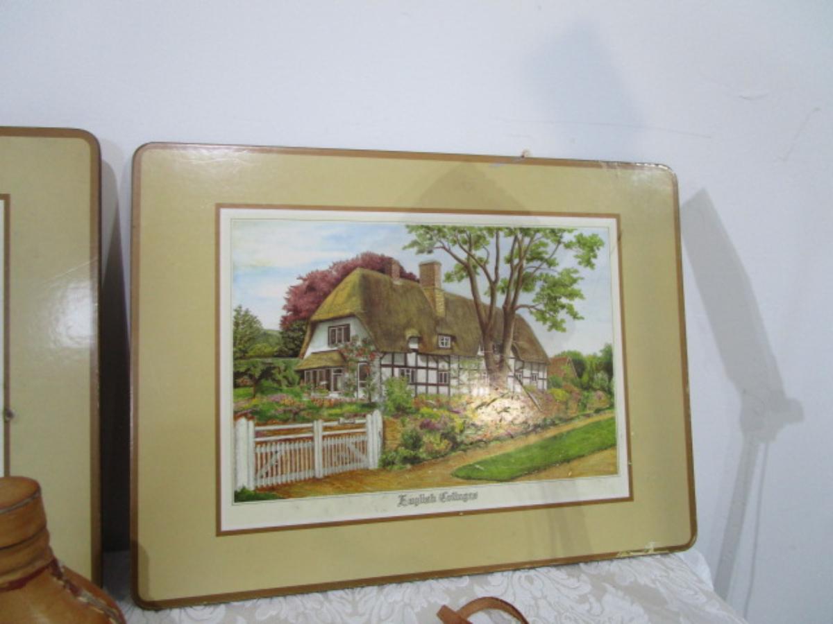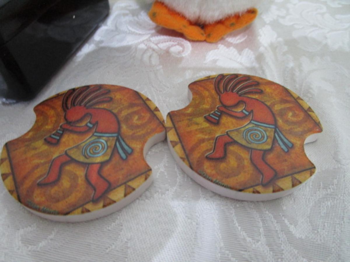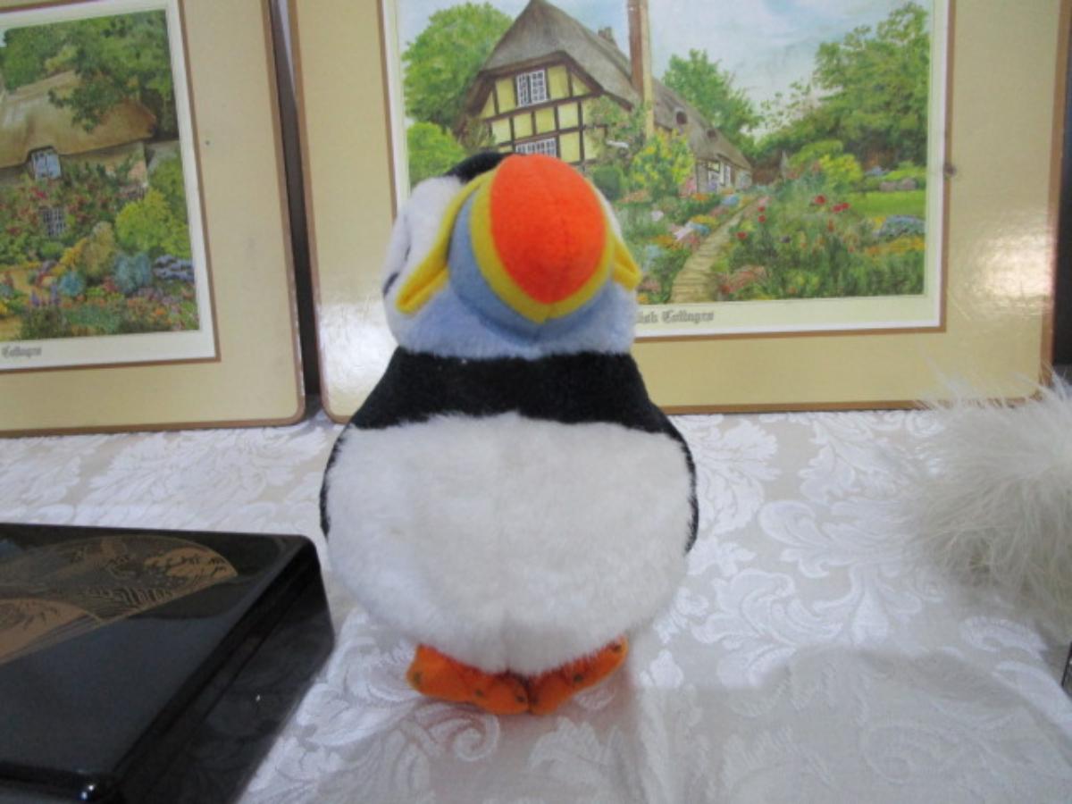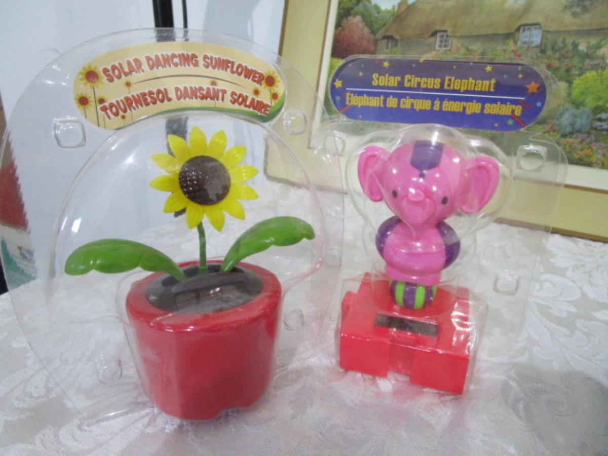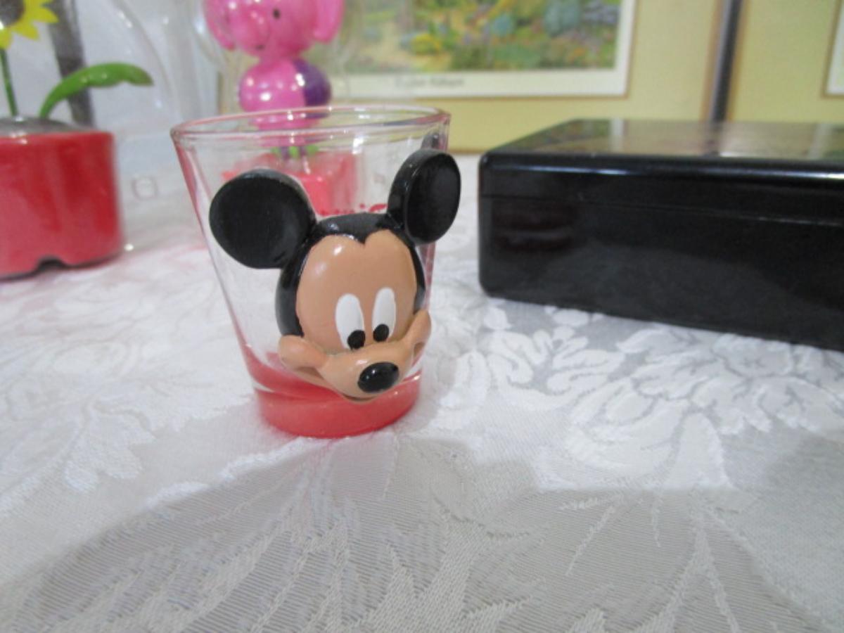 Leather pouch, noise making puffin, picture placemats, bottle with leather case from Costa Rica, figurines, Disney shot glass, oriental box, 2 solar figures