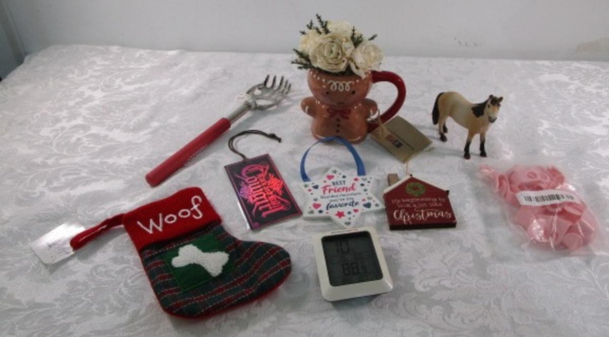 New Gingerbread vase with flowers, small Christmas stocking, bookmark, Schleich horse, hanger extenders, house ornament, star ornament, new extending back scratcher, Thermopro TP50 Digital hygrometer & indoor thermometer