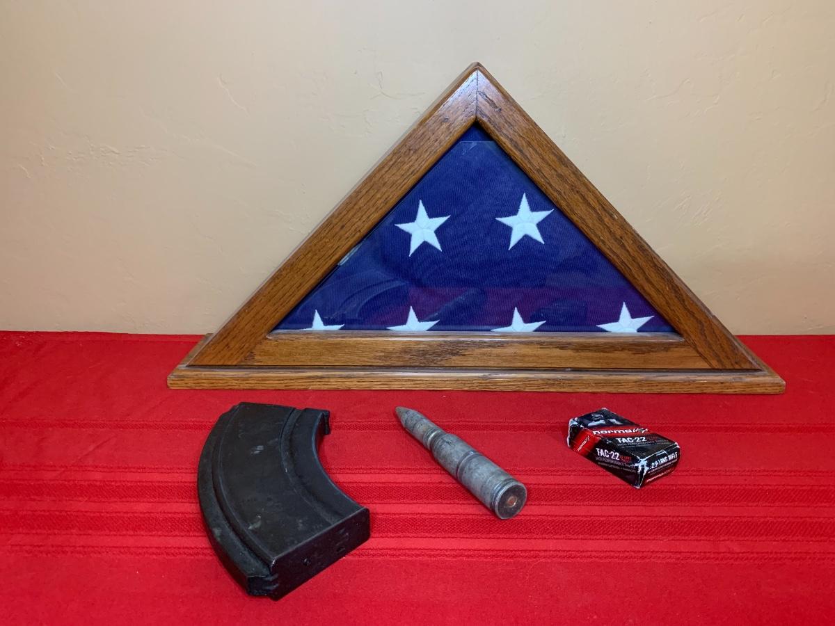 Includes one shadow box with flag flown over Shaw Air Force Base in South Carolina during Desert Storm, 32 .22 LR ammunition rounds and more! Ammo cannot be shipped