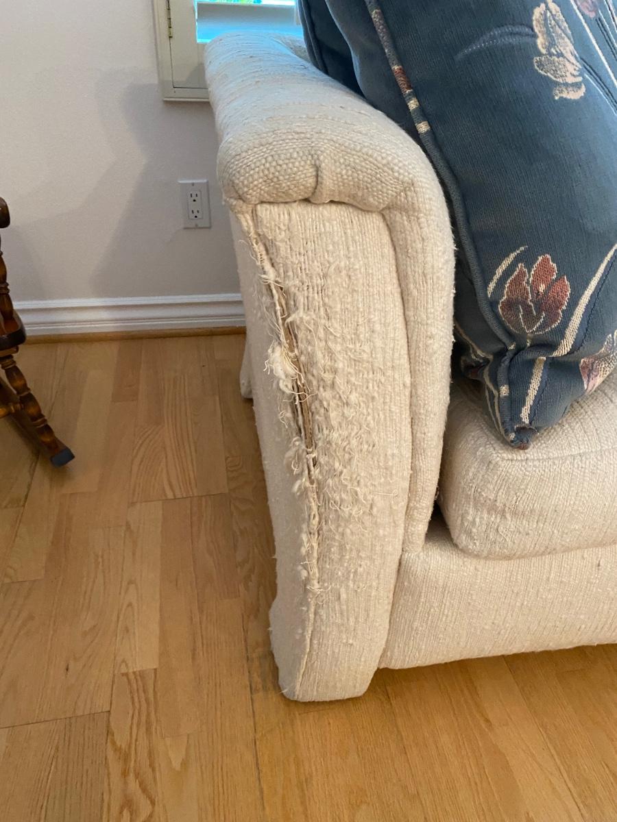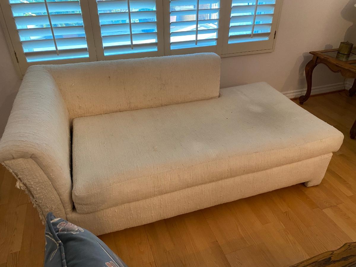 Off white fainting couch. Needs to be cleaned, and has cat damage on the corner. Sturdy.