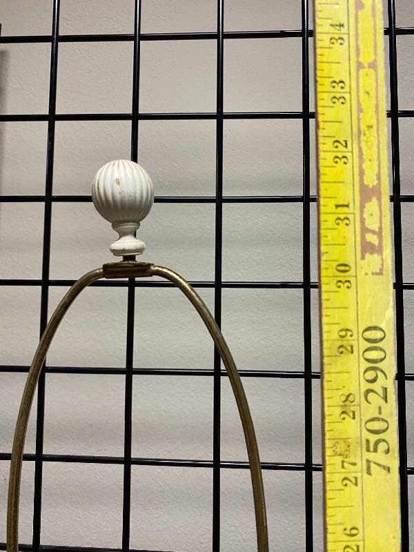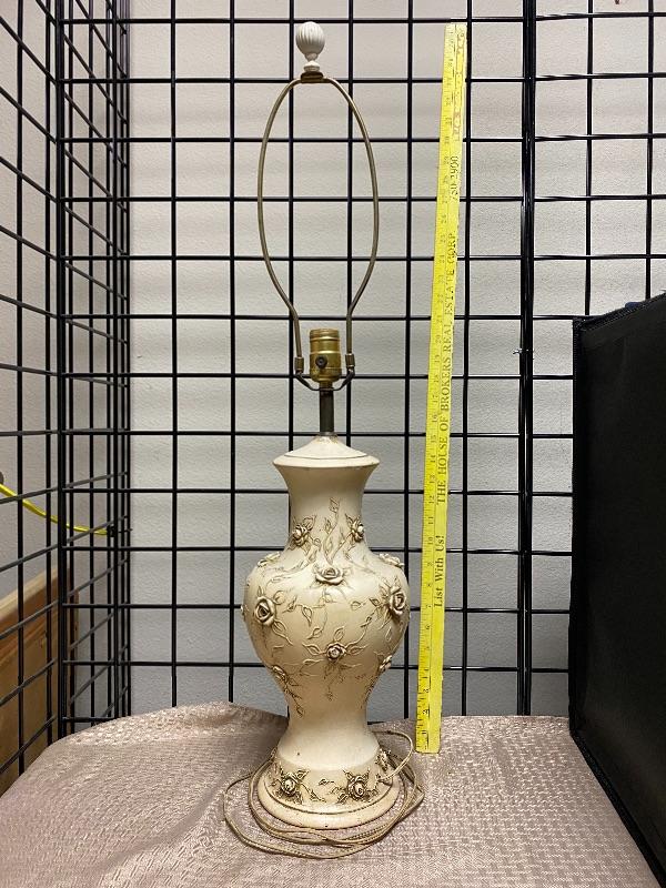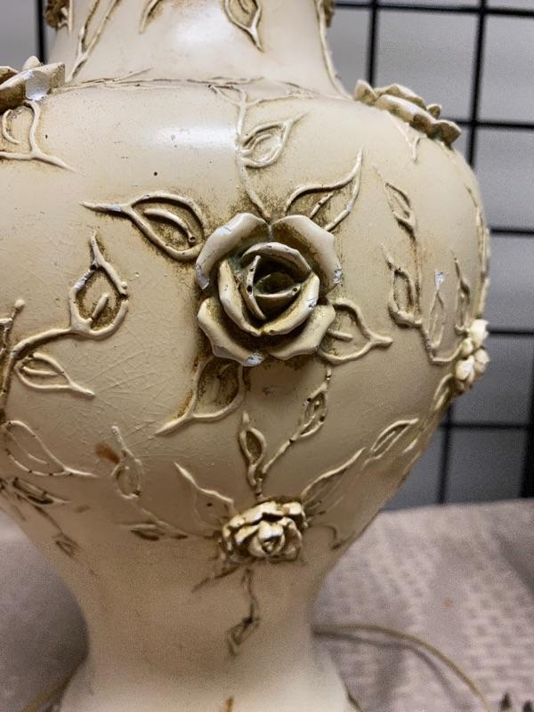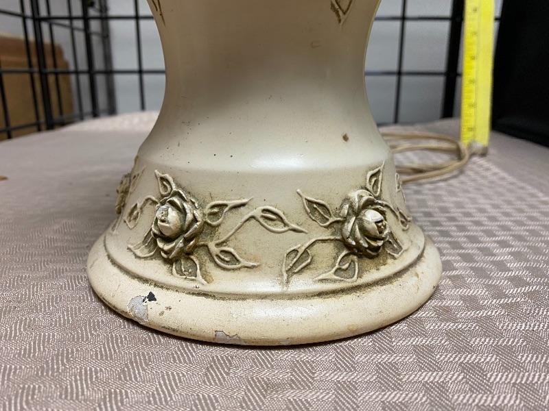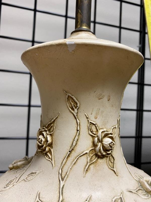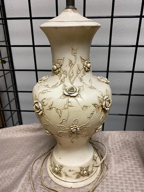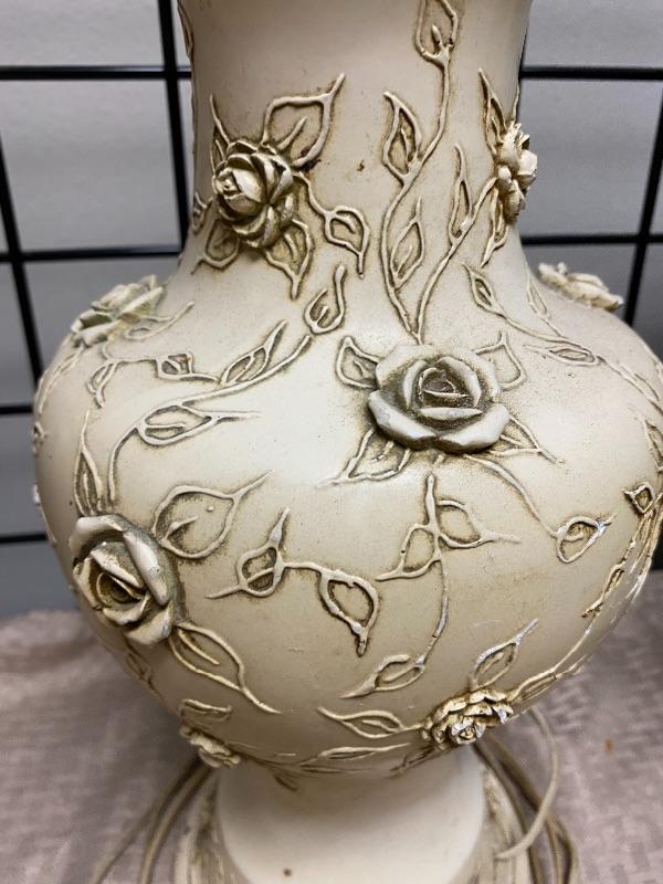 Off white flower covered table lamp. Roses and leaves adorn the upper half and bottom edge. There are a few chips in the glaze along edges. Needs to be cleaned, dusty from storage. Untested.