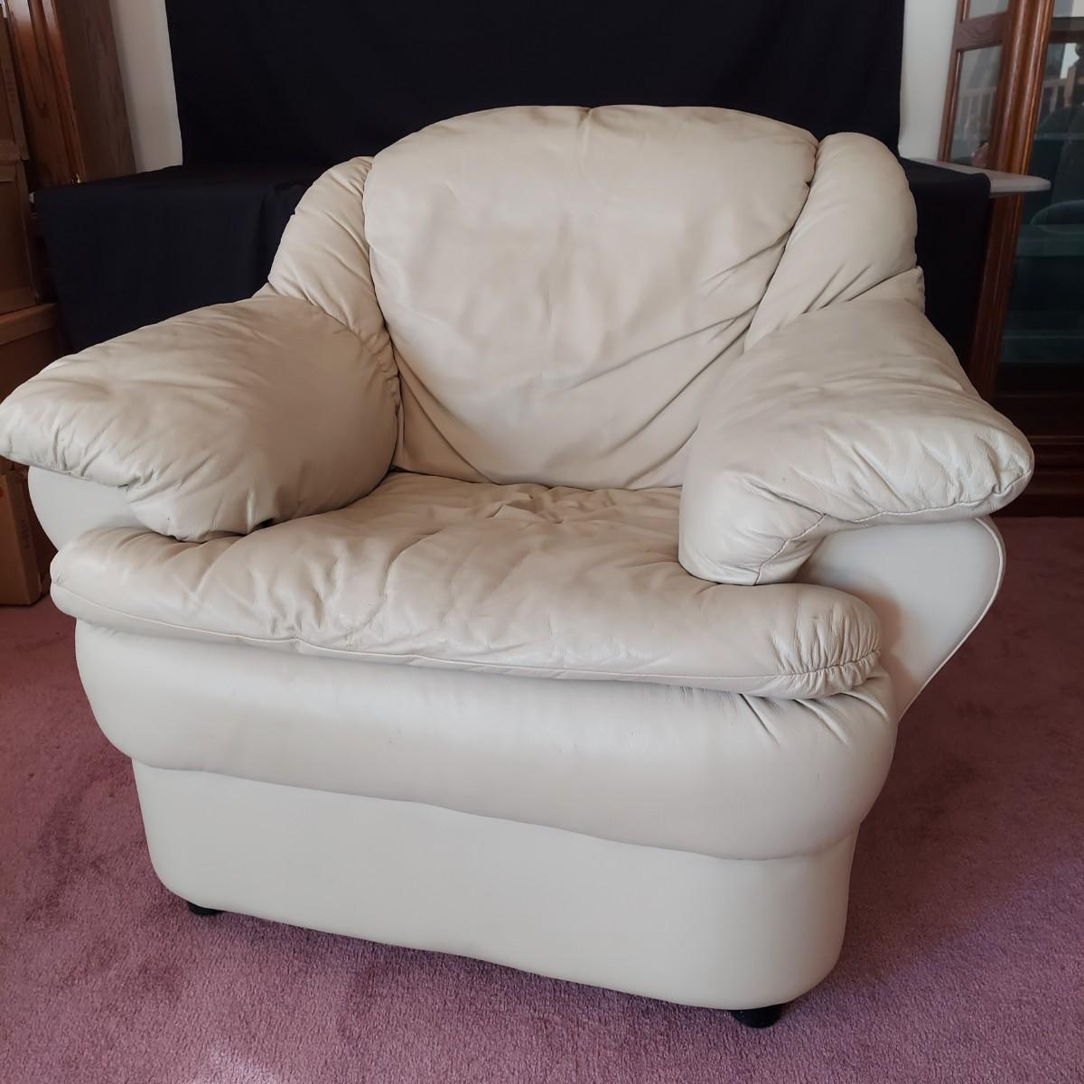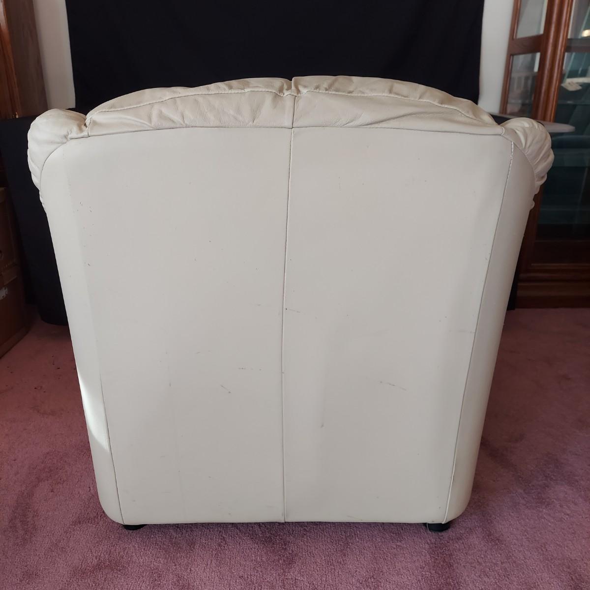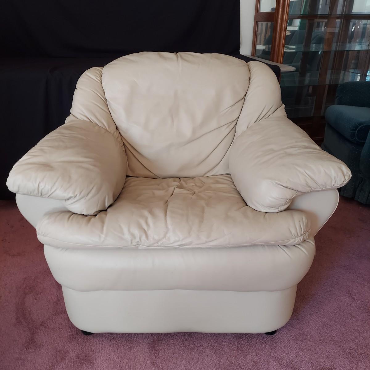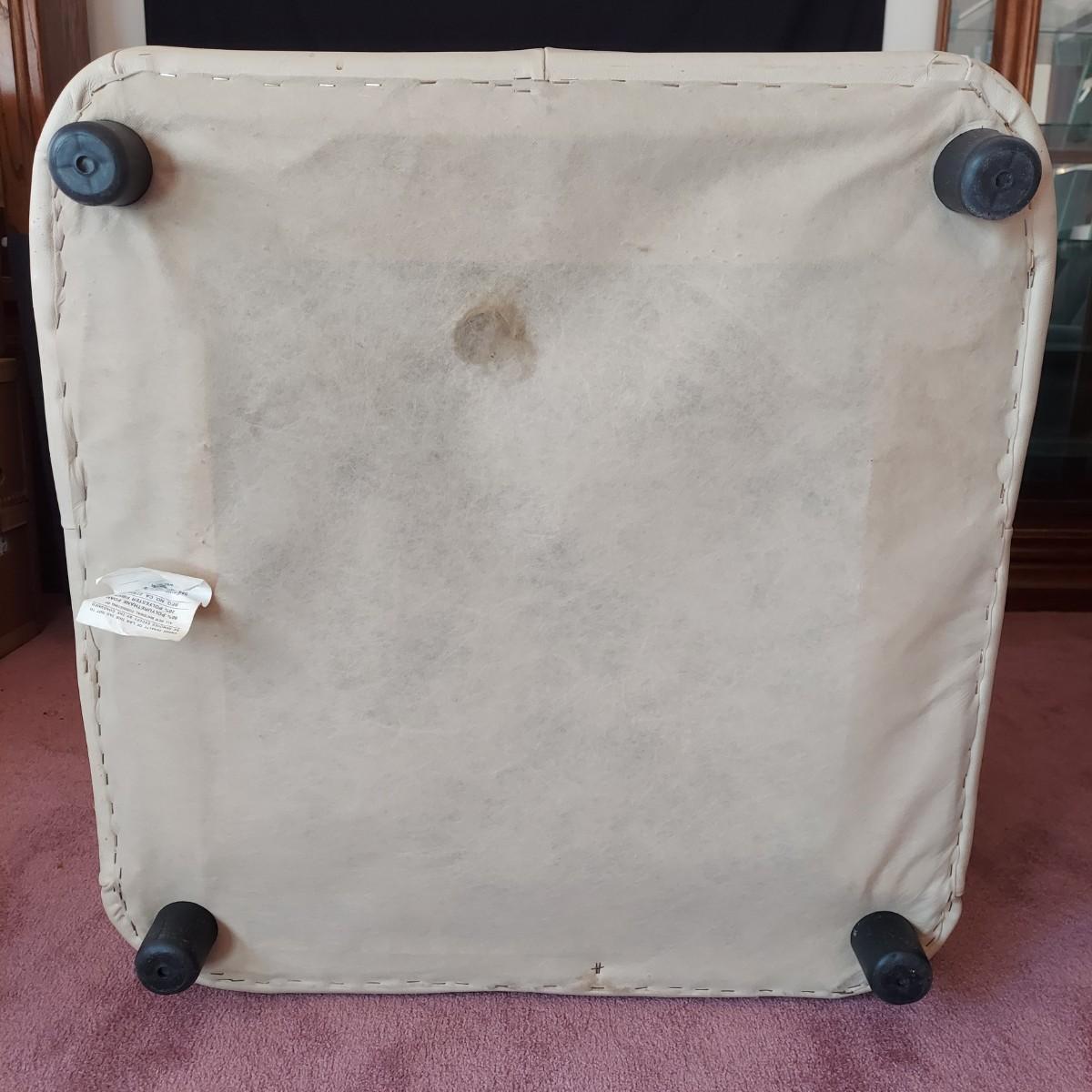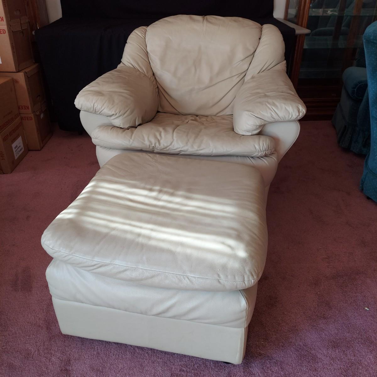 Off white faux leather chair and ottoman. Some overall wear. Some spots that can probably be cleaned off. The back leg of the chair is looser than the others but is still sturdy. The chair is approximately 39" x 32" x 34"H. Seat height is 18". The ottoman is 25" x 25" x 17"H. There is a matching piece in another lot in this auction. The cabinet and other items in the background are not included. Local Pickup Only. Winning bidder must bring assistance to help move and load this item due to its weight and/or size.