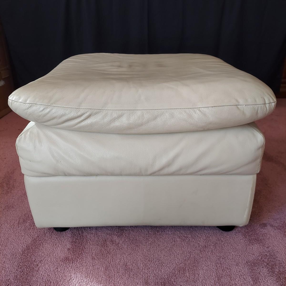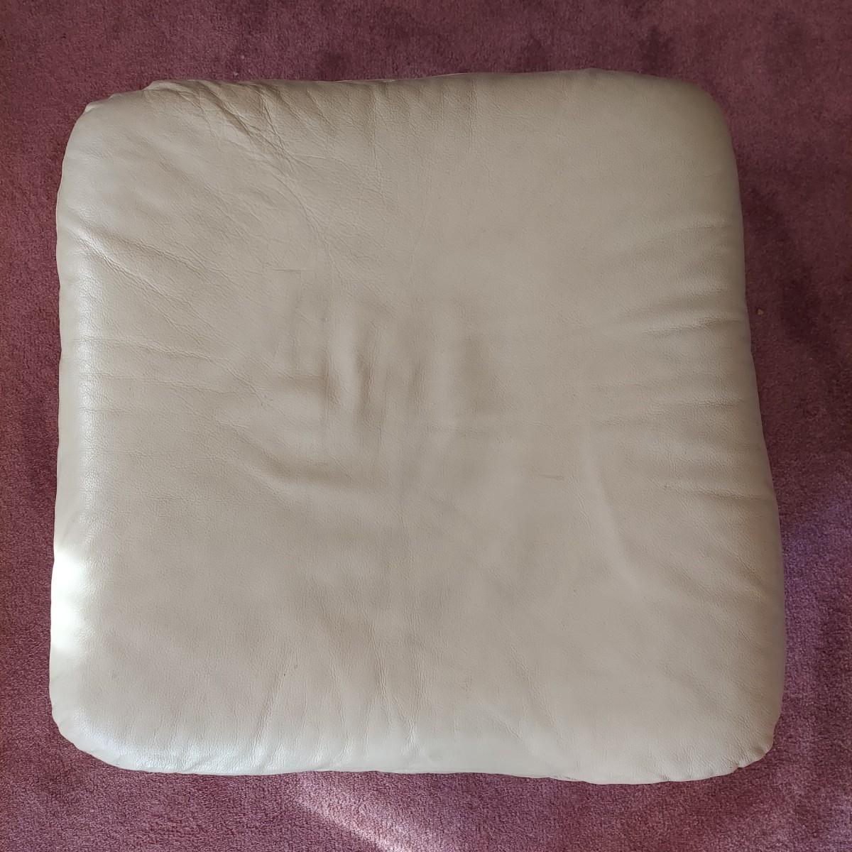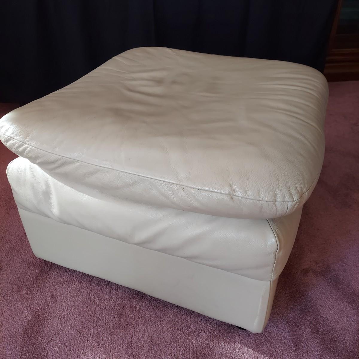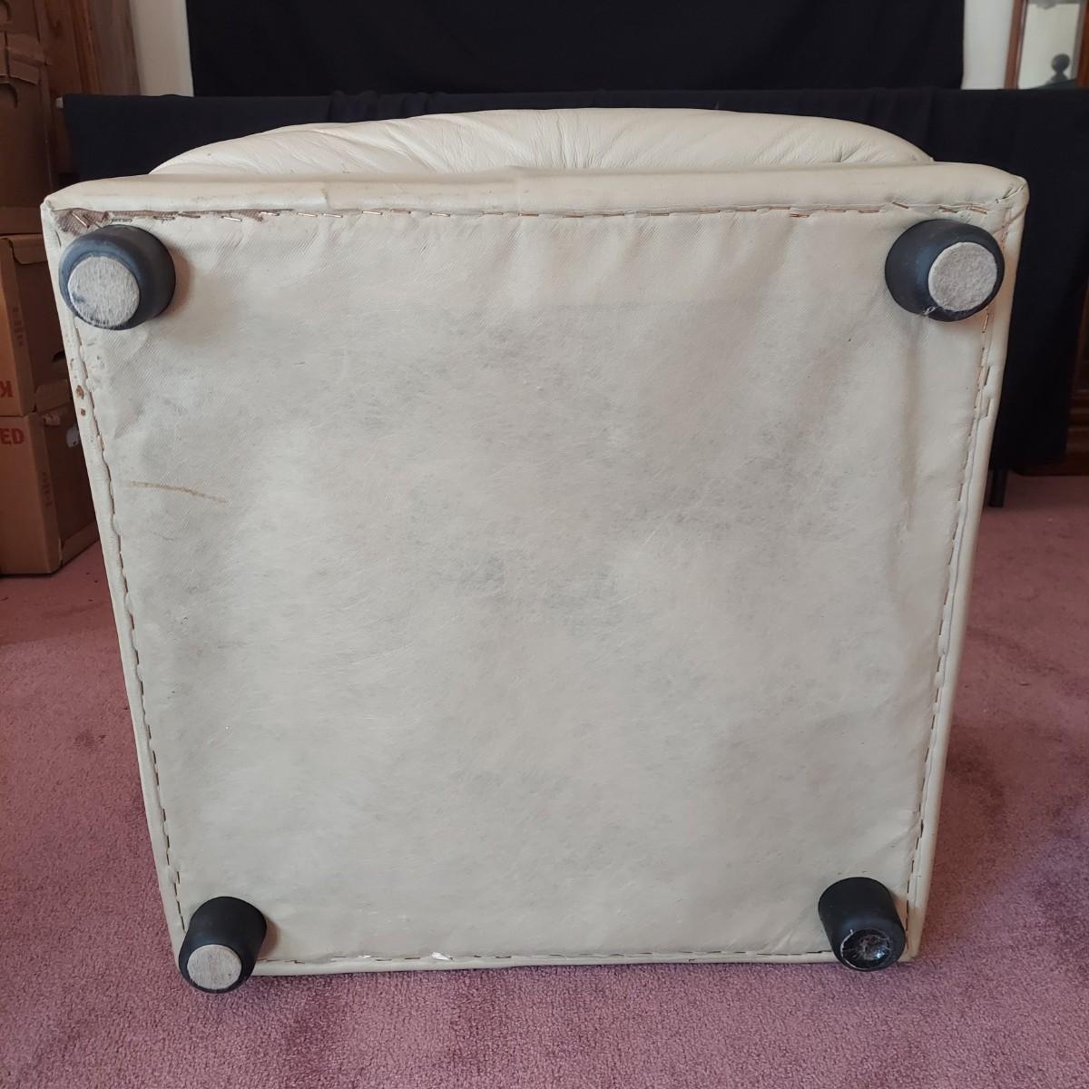 Off white faux leather chair and ottoman. Some overall wear. Some spots that can probably be cleaned off. The back leg of the chair is looser than the others but is still sturdy. The chair is approximately 39" x 32" x 34"H. Seat height is 18". The ottoman is 25" x 25" x 17"H. There is a matching piece in another lot in this auction. The cabinet and other items in the background are not included. Local Pickup Only. Winning bidder must bring assistance to help move and load this item due to its weight and/or size.