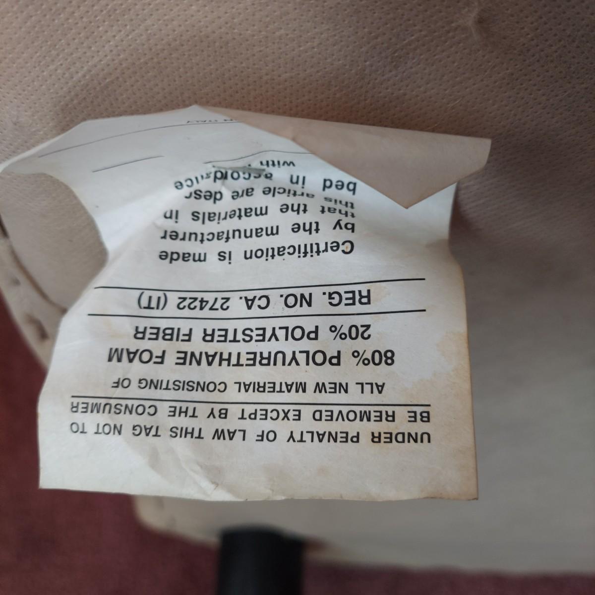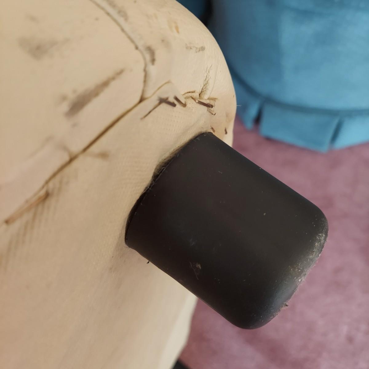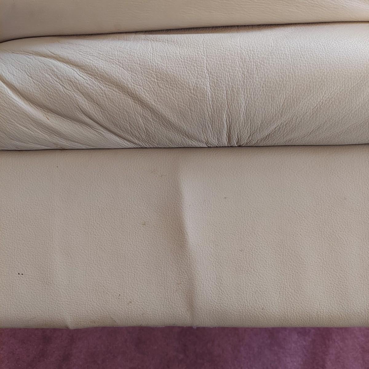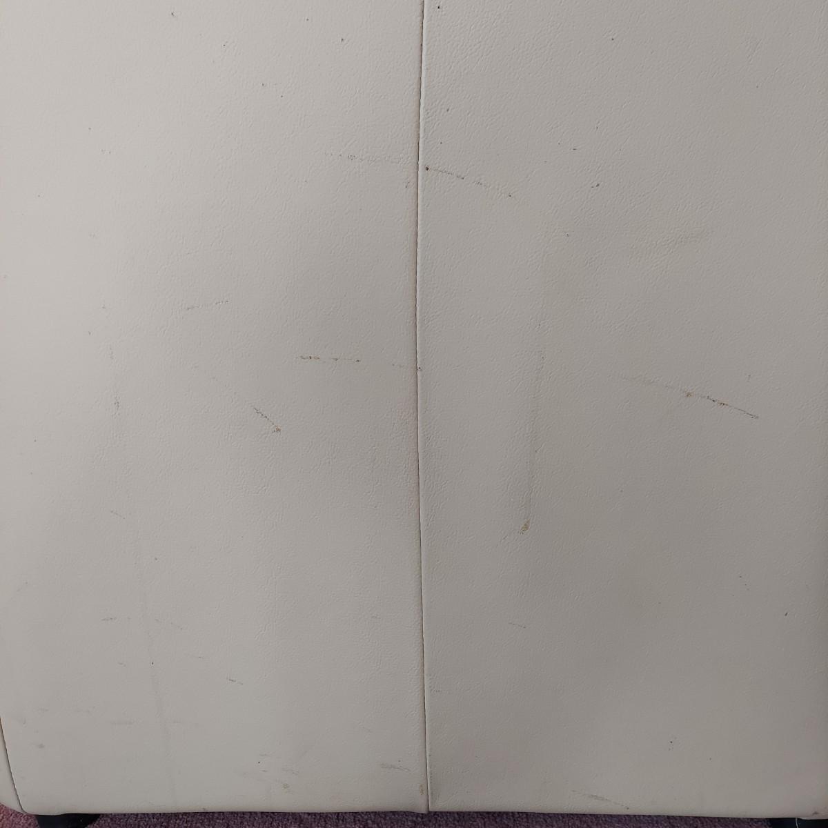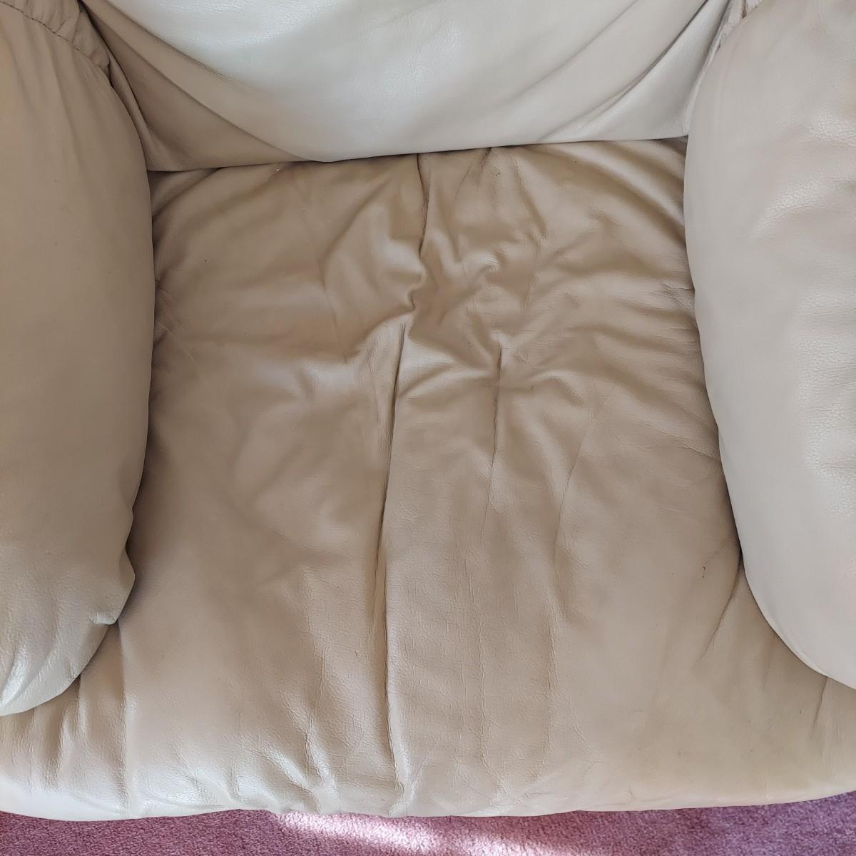 Off white faux leather chair and ottoman. Some overall wear. Some spots that can probably be cleaned off. The back leg of the chair is looser than the others but is still sturdy. The chair is approximately 39" x 32" x 34"H. Seat height is 18". The ottoman is 25" x 25" x 17"H. There is a matching piece in another lot in this auction. The cabinet and other items in the background are not included. Local Pickup Only. Winning bidder must bring assistance to help move and load this item due to its weight and/or size.