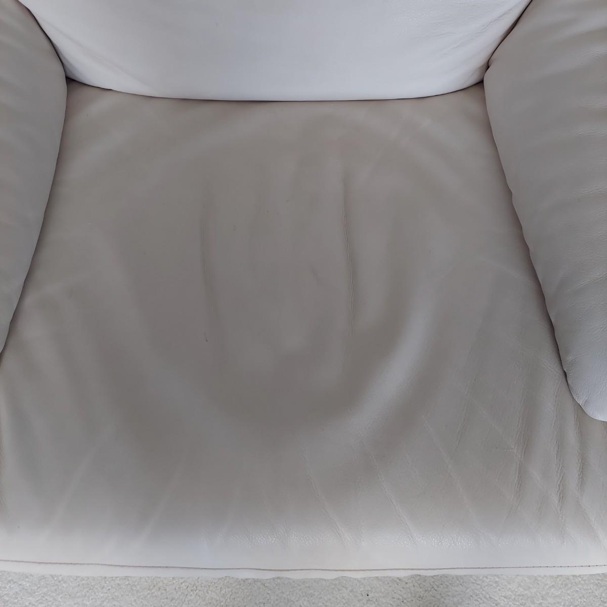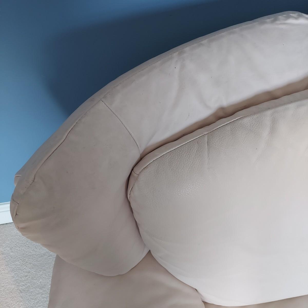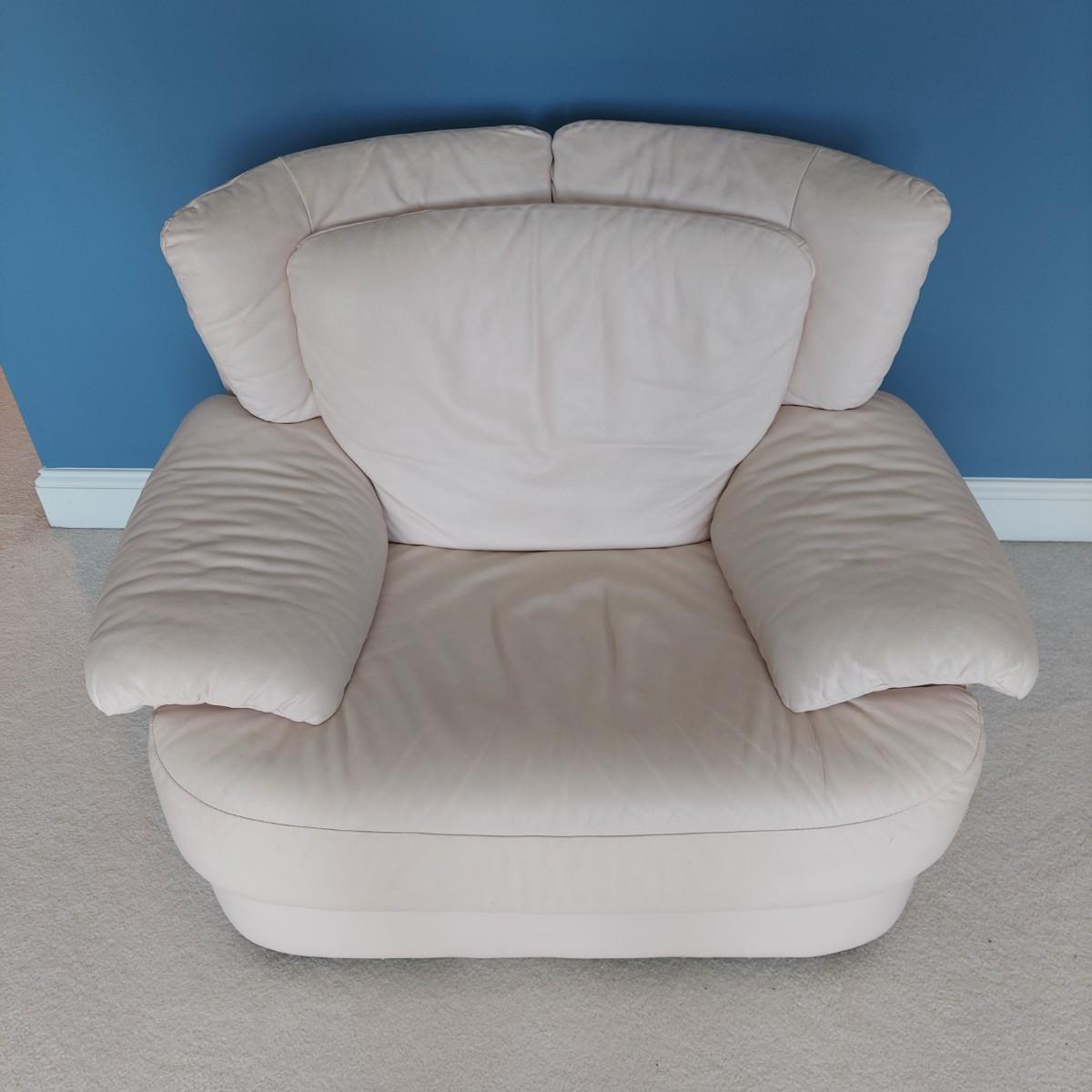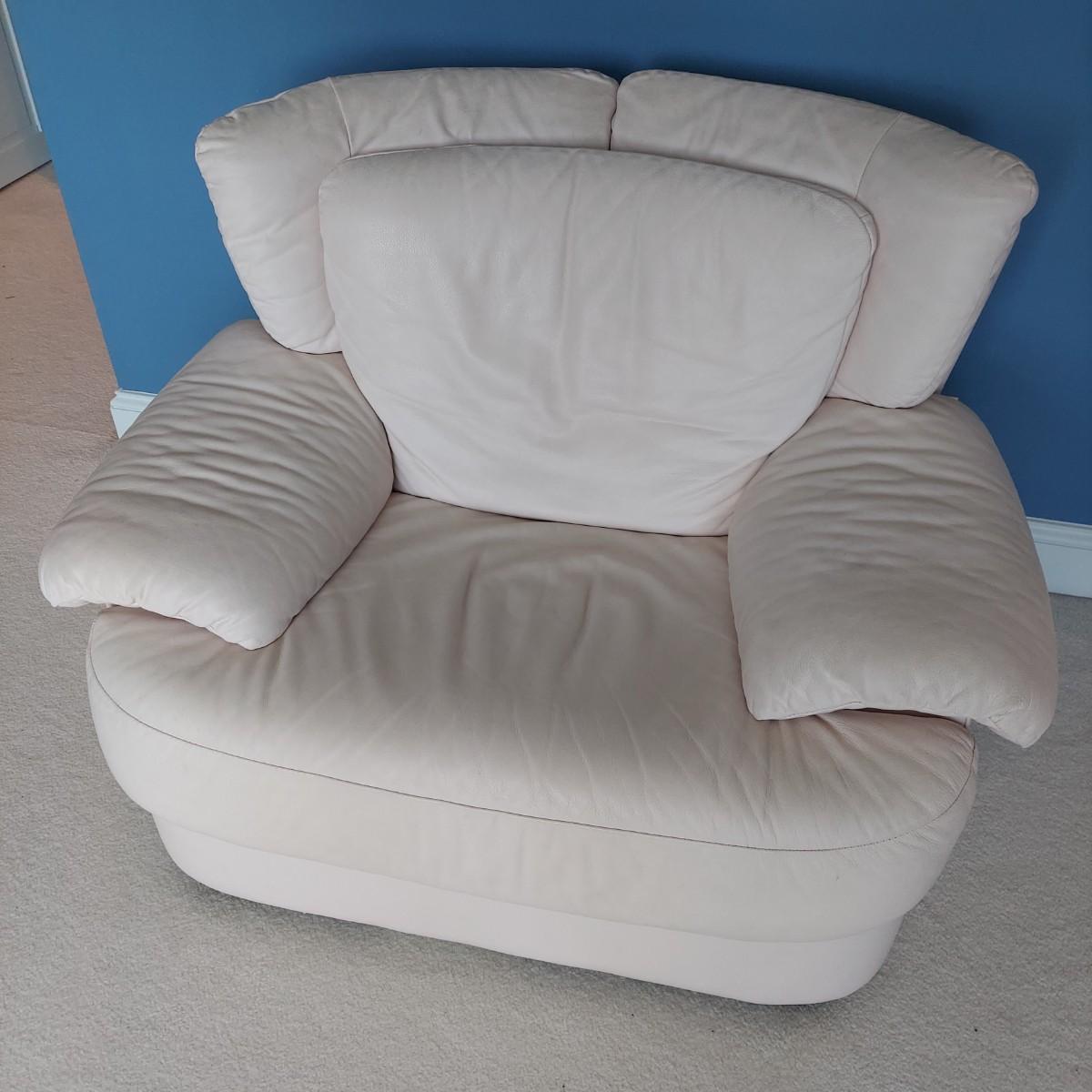 Large, over-stuffed off white lounge chair. Appears to be leather. Chair measures approximately 45” x 38” x 33"H with a 16"H seat height. Matching love seat and sofa for sale in other lots. Has some discoloration and wear. Please see photos for details. Local Pickup Only. Located upstairs. Please bring help to load this item.