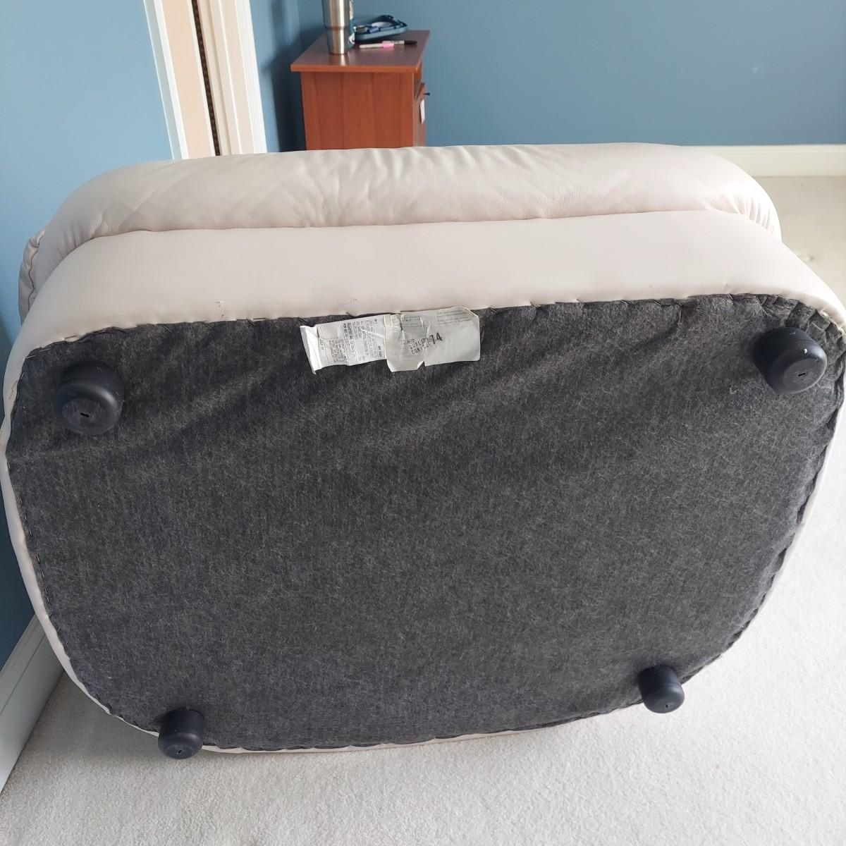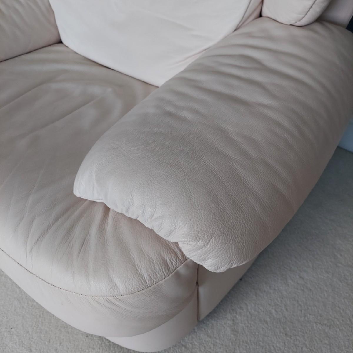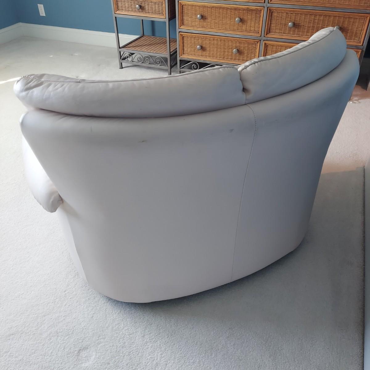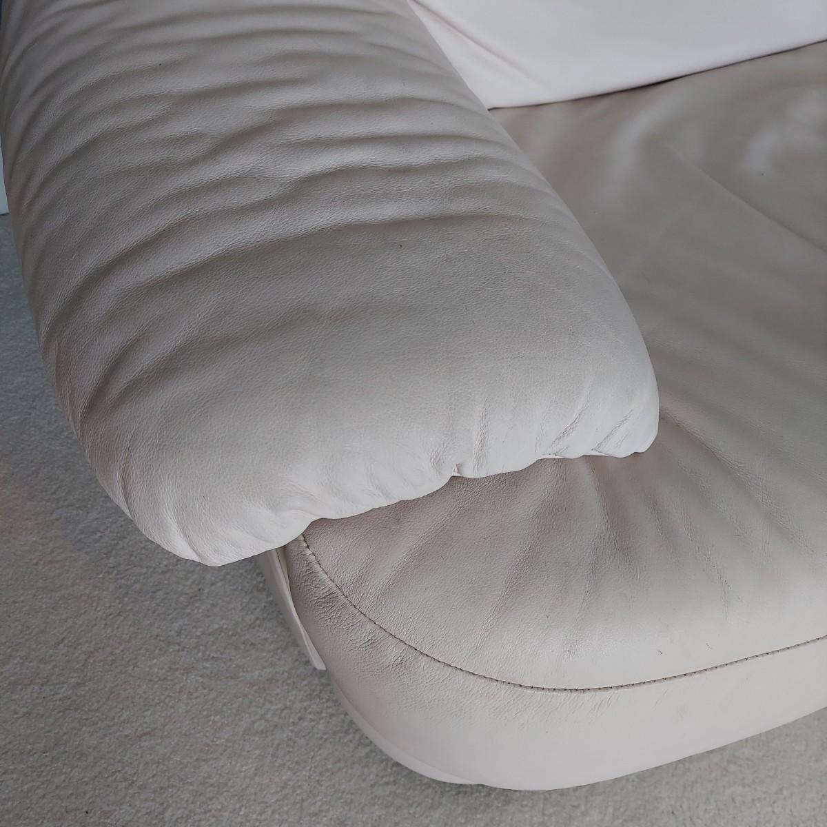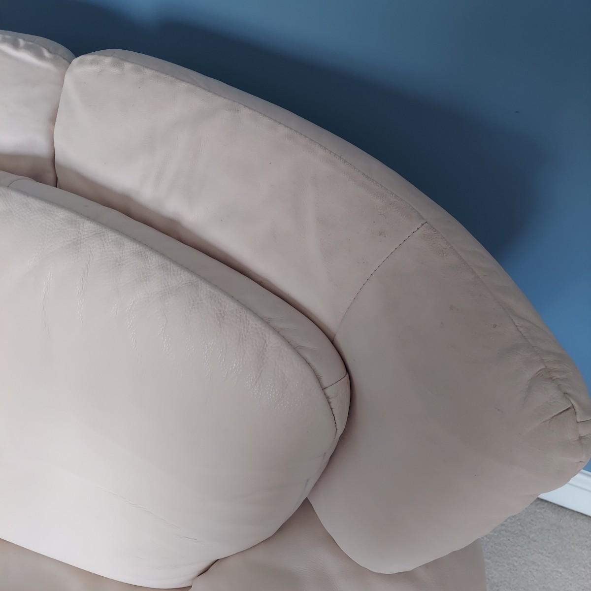 Large, over-stuffed off white lounge chair. Appears to be leather. Chair measures approximately 45” x 38” x 33"H with a 16"H seat height. Matching love seat and sofa for sale in other lots. Has some discoloration and wear. Please see photos for details. Local Pickup Only. Located upstairs. Please bring help to load this item.