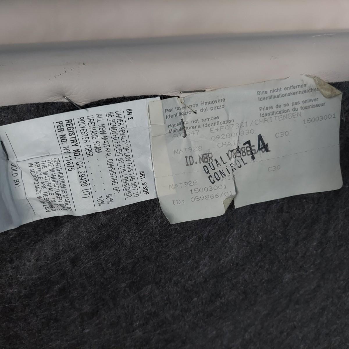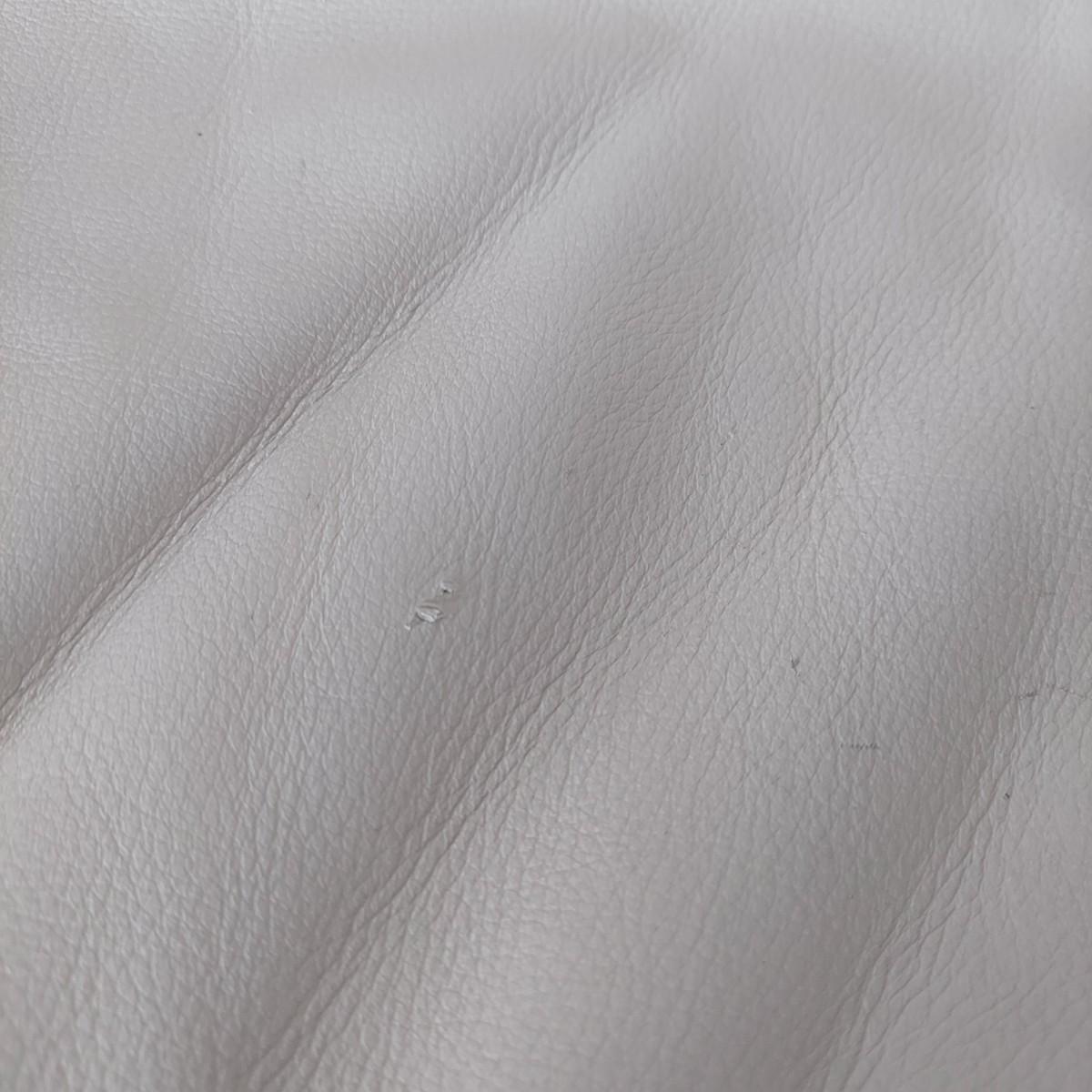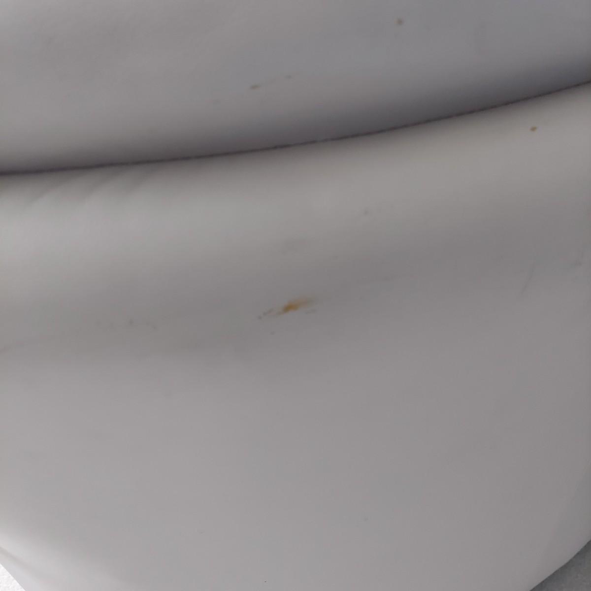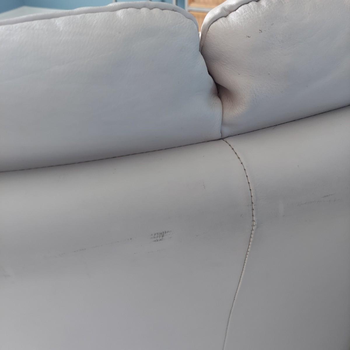Large, over-stuffed off white lounge chair. Appears to be leather. Chair measures approximately 45” x 38” x 33"H with a 16"H seat height. Matching love seat and sofa for sale in other lots. Has some discoloration and wear. Please see photos for details. Local Pickup Only. Located upstairs. Please bring help to load this item.