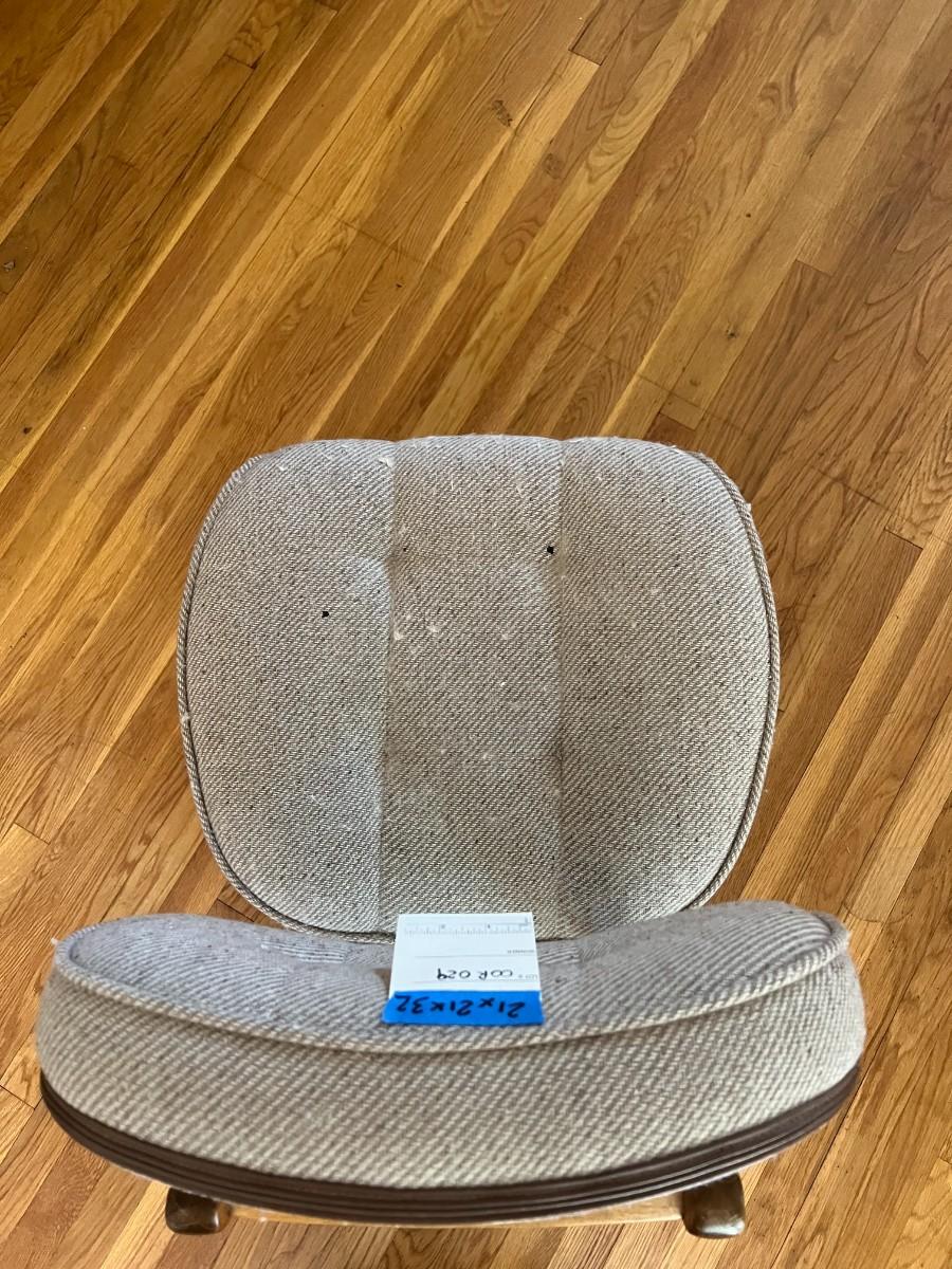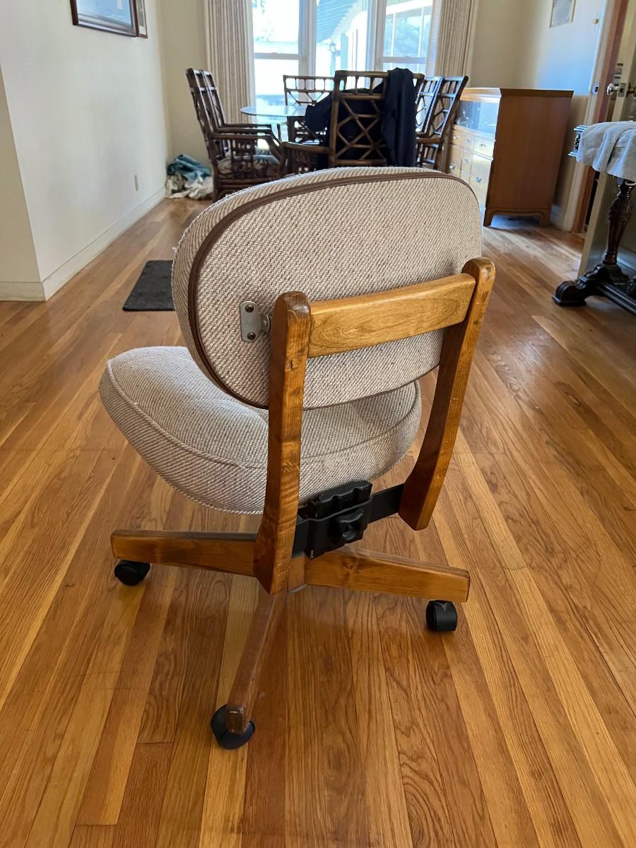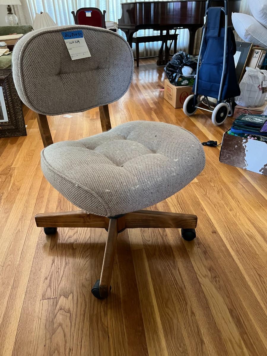 Grey upholstered office chair, with wooden back and legs. Is height adjustable, on 4 wheels.