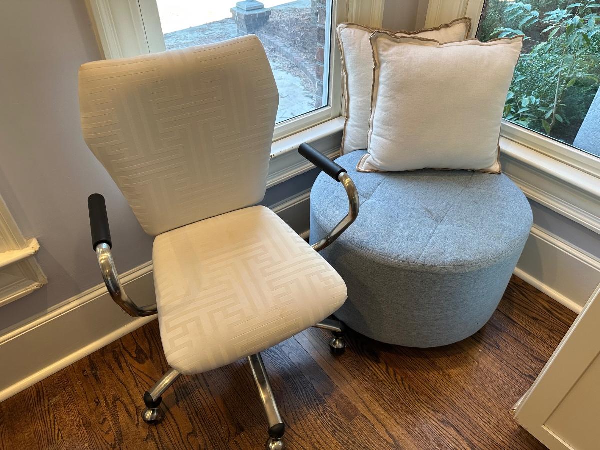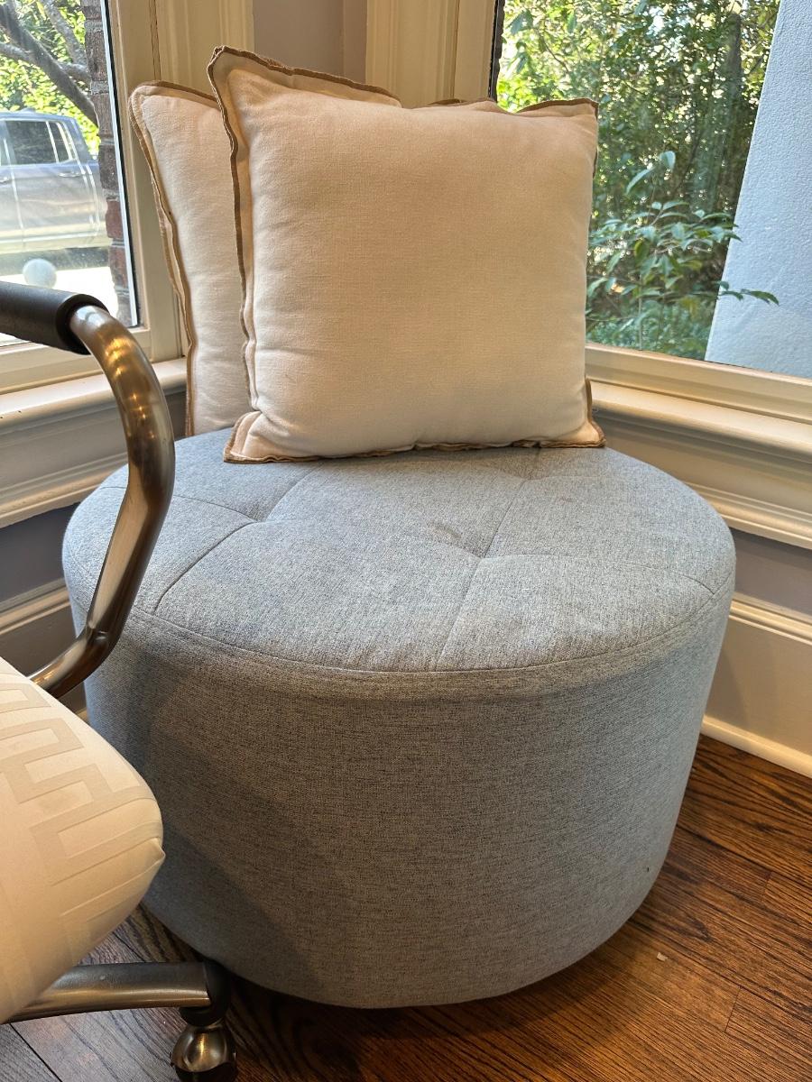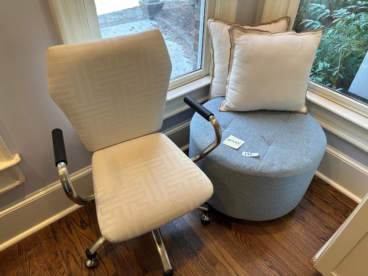 OFFICE CHAIR(MINOR STAINS), BLUE OTTOMAN, PILLOW PAIR