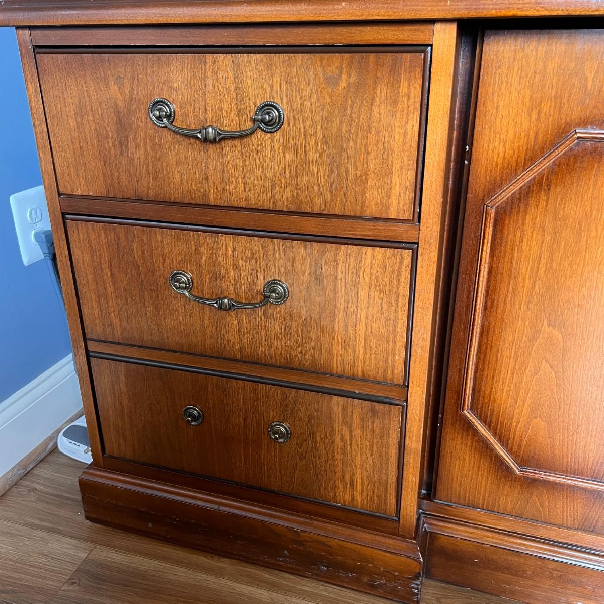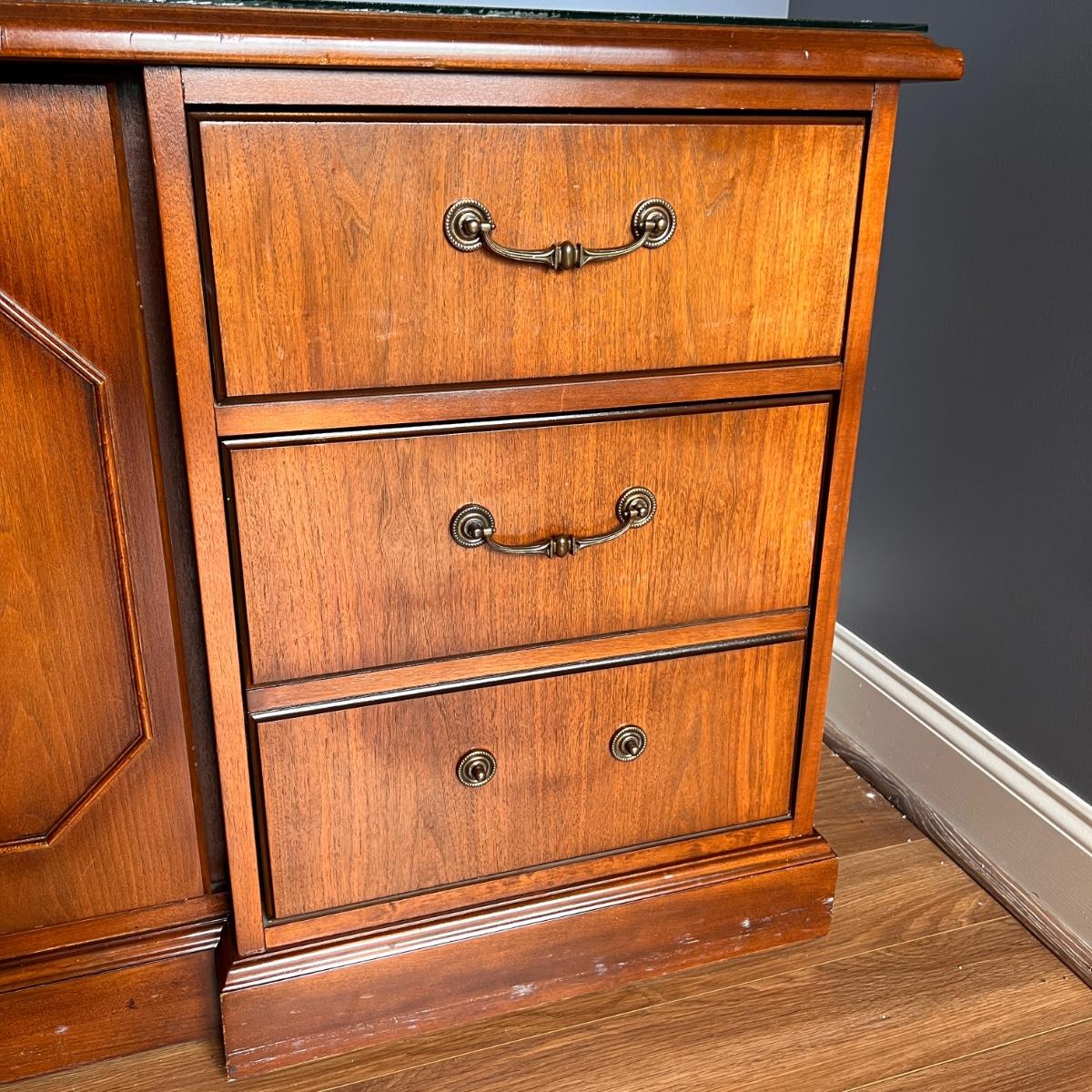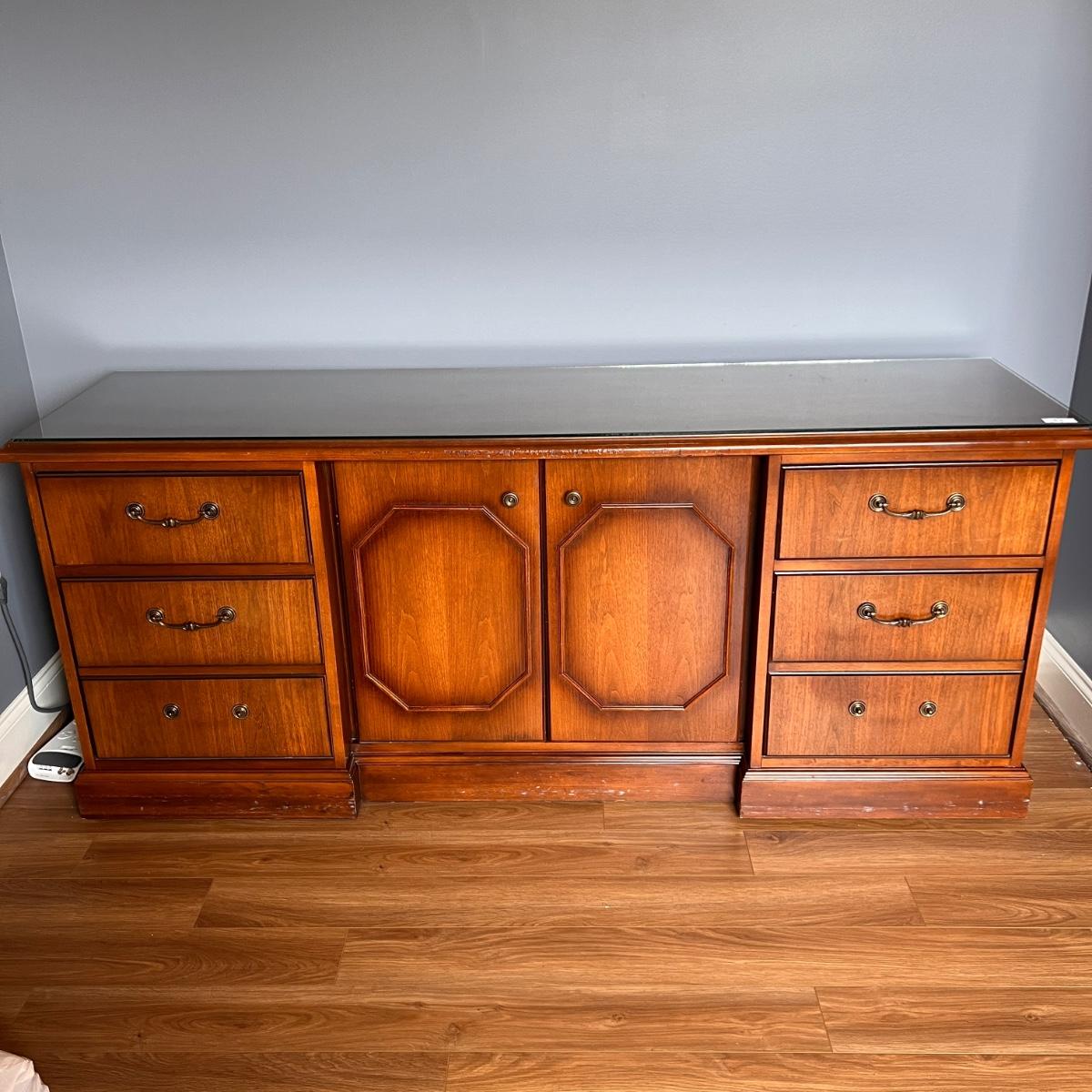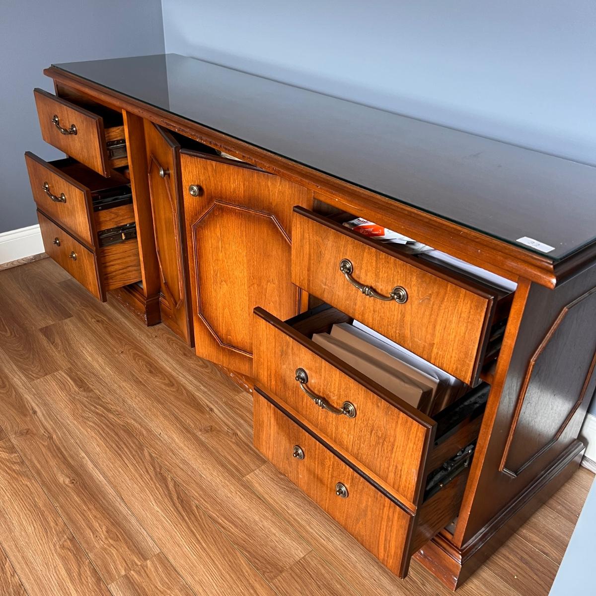 This is a high quality piece of furniture with cabinet storage, 4 drawers 2 of which have hanging folder hardware. It has raised panels and a protective piece of glass on top. It does have quite a few scratches and nicks as shown in the pictures. Some of which have been touched up. Its also missing bottom handles on the bottom larger drawers on each side. See all the pictures.