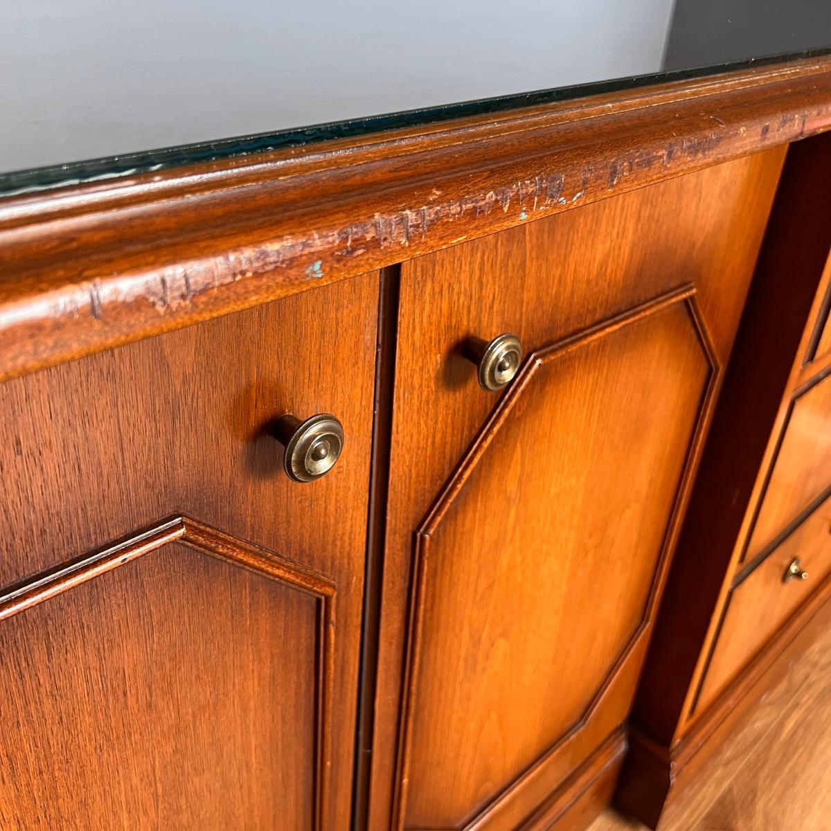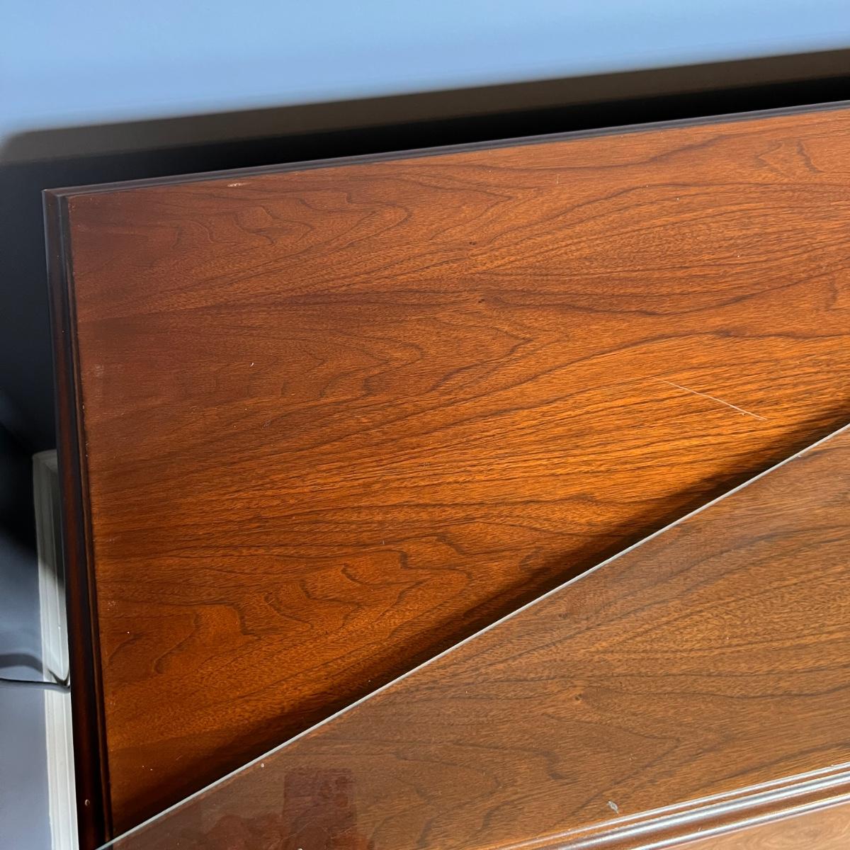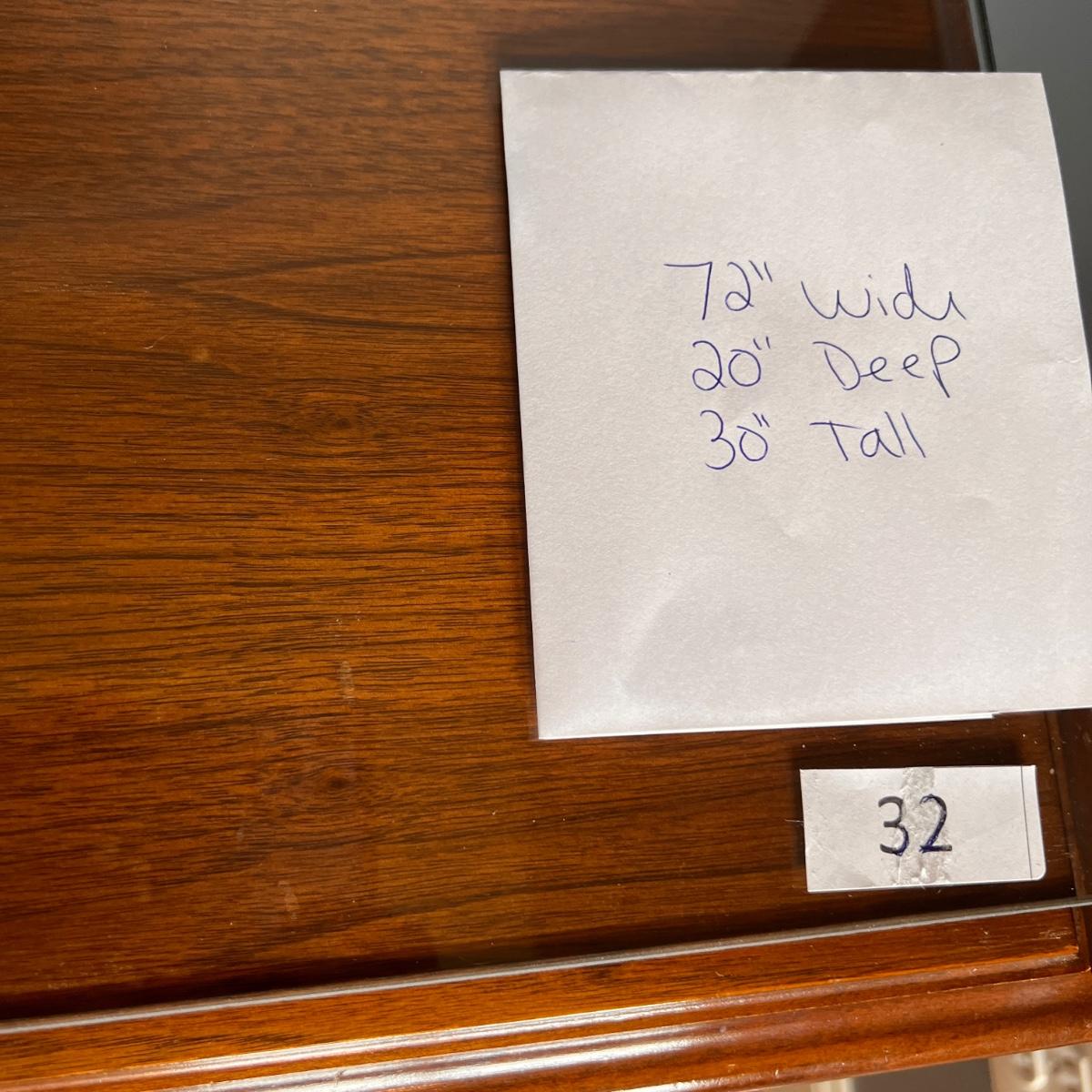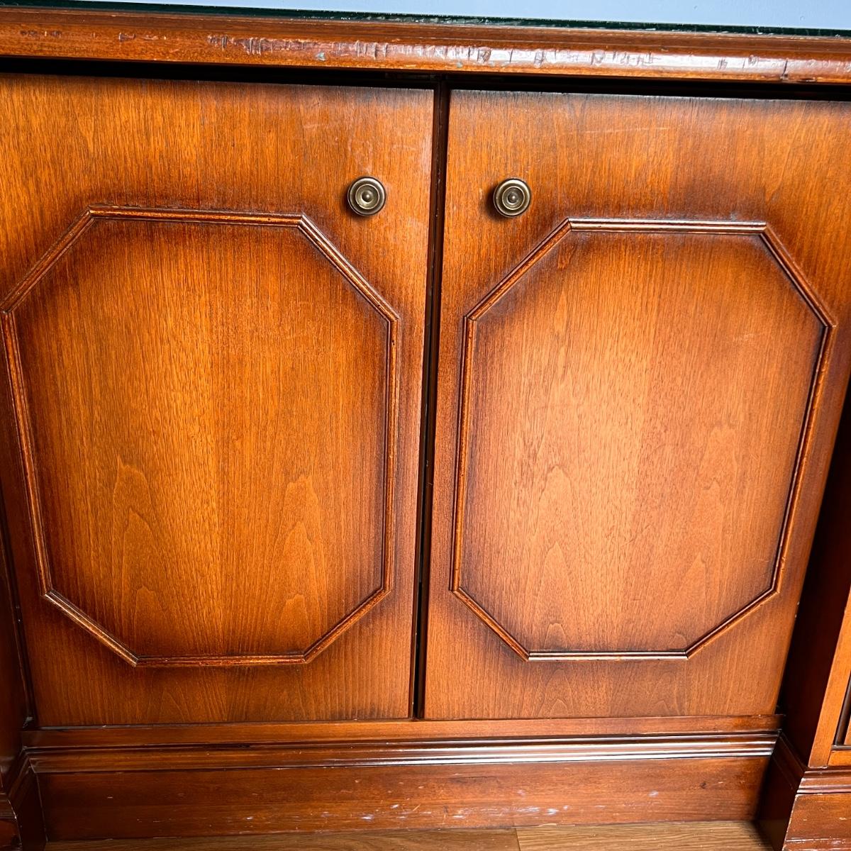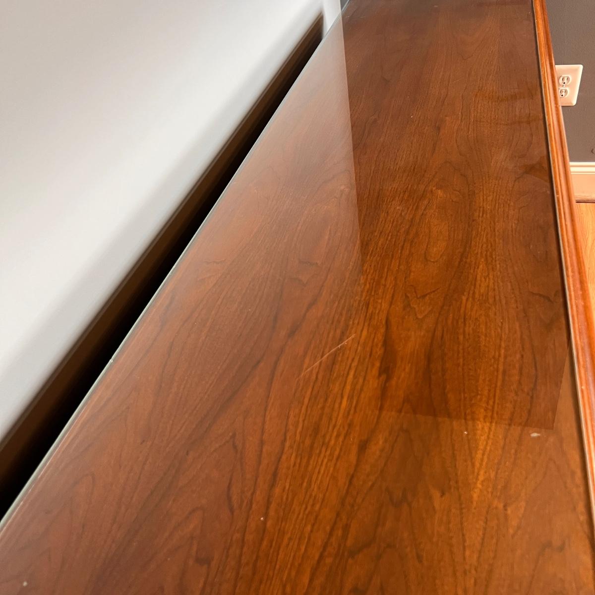 This is a high quality piece of furniture with cabinet storage, 4 drawers 2 of which have hanging folder hardware. It has raised panels and a protective piece of glass on top. It does have quite a few scratches and nicks as shown in the pictures. Some of which have been touched up. Its also missing bottom handles on the bottom larger drawers on each side. See all the pictures.