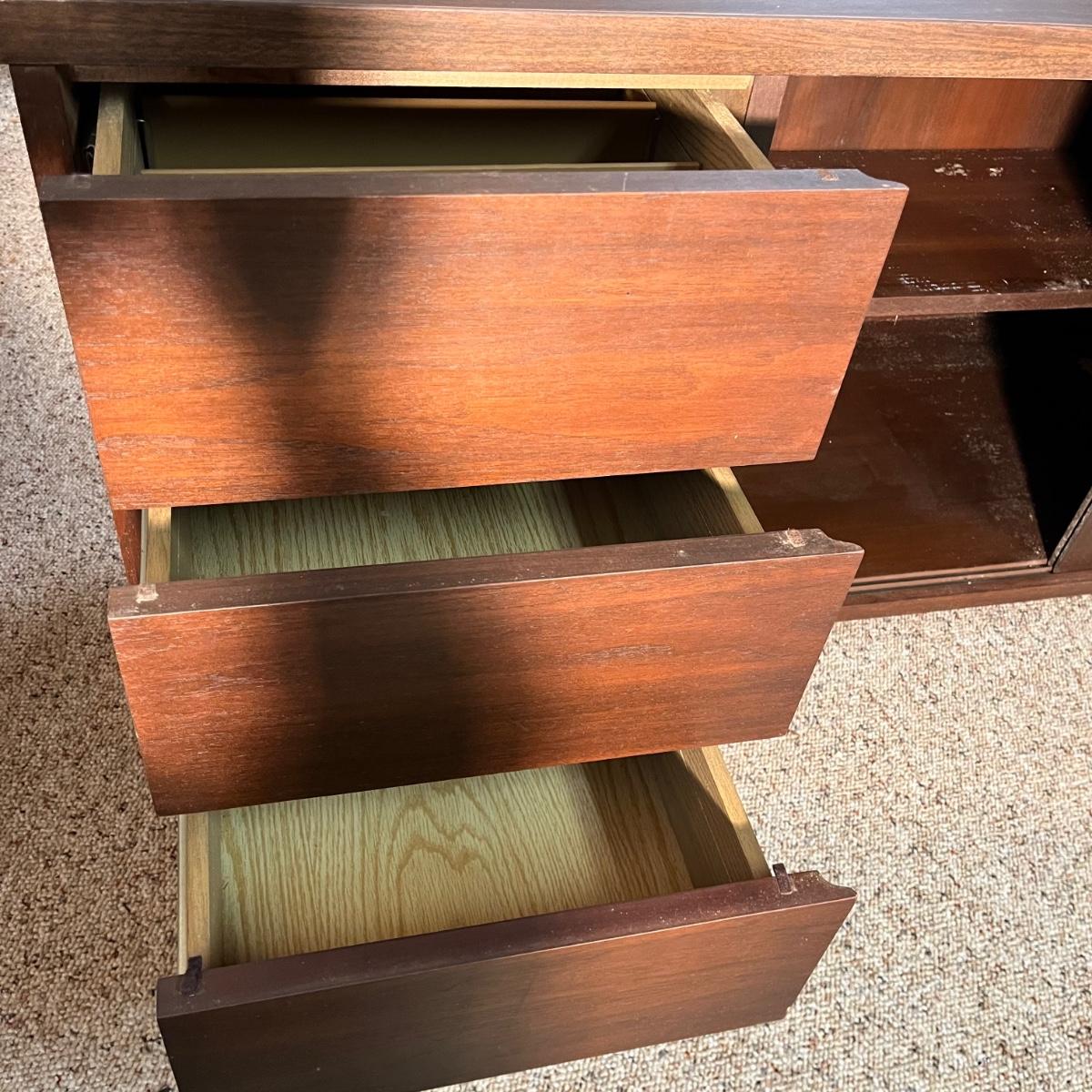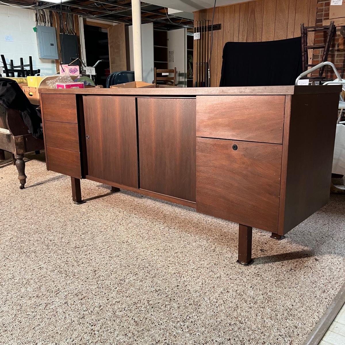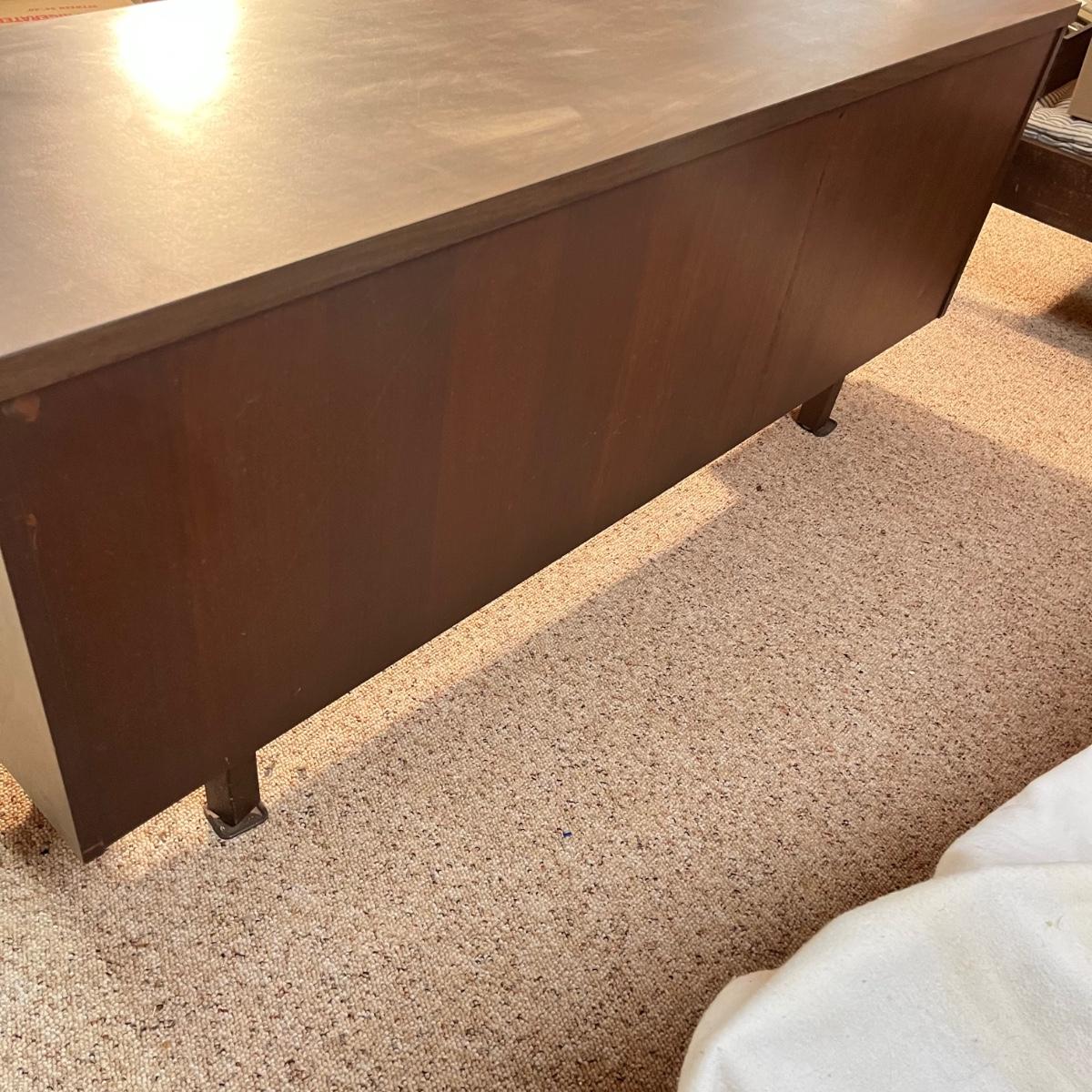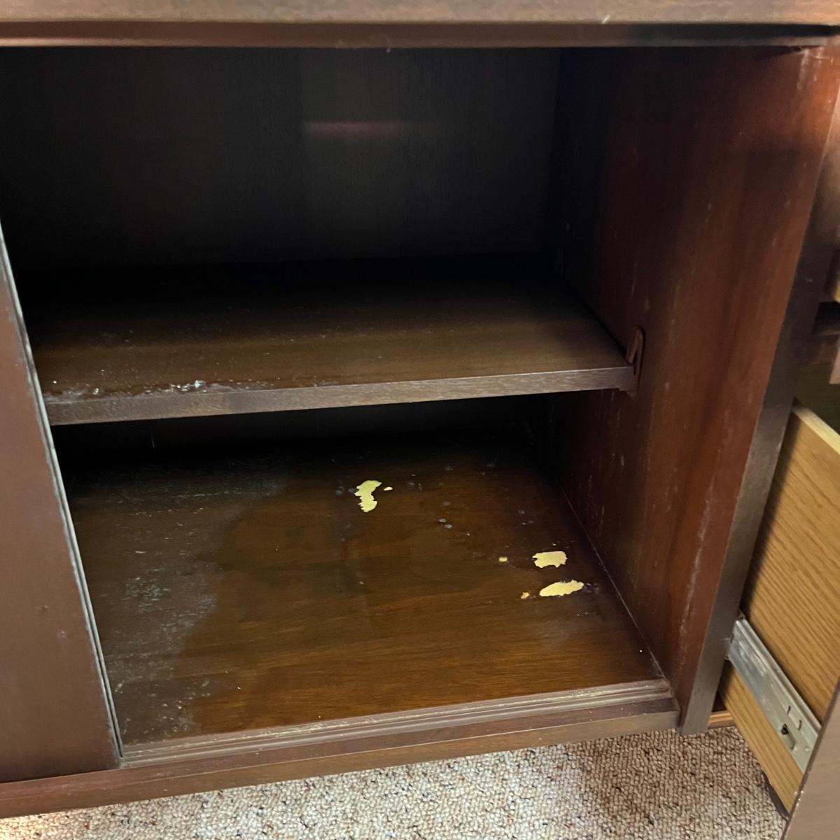 Lot includes an office credenza with adjustable shelf inside sliding cabinet doors. Also has one file sized drawer and four smaller drawers. The brown patches inside the cabinet appear to be paper stuck to the wood and may be removable. Credenza measures 66” x 20”. X 29.5”.
