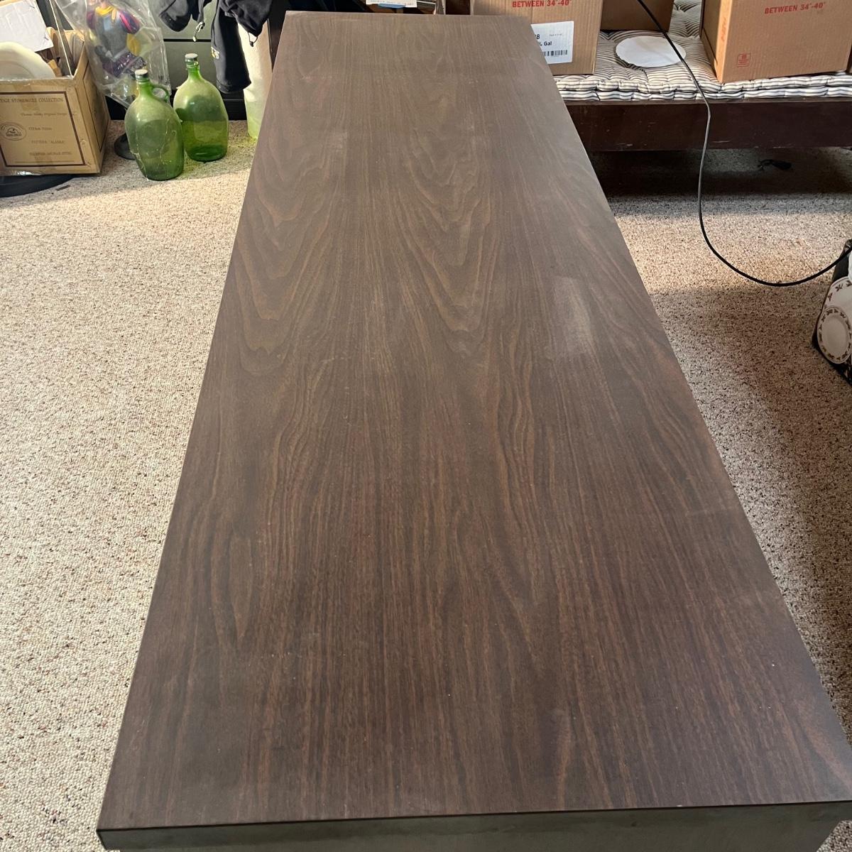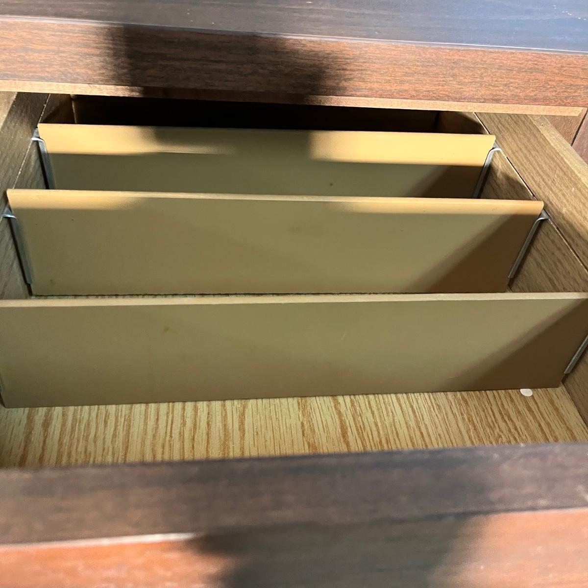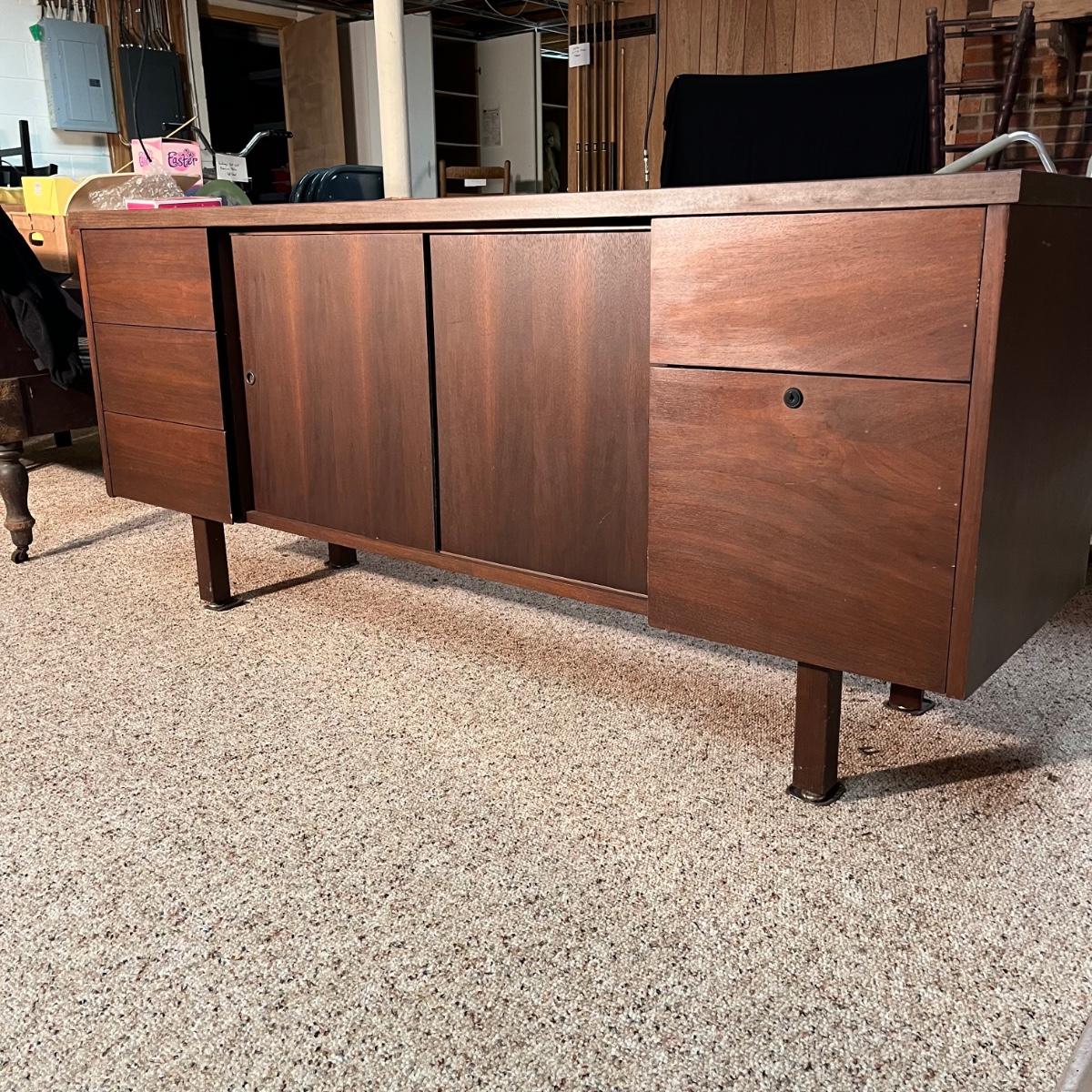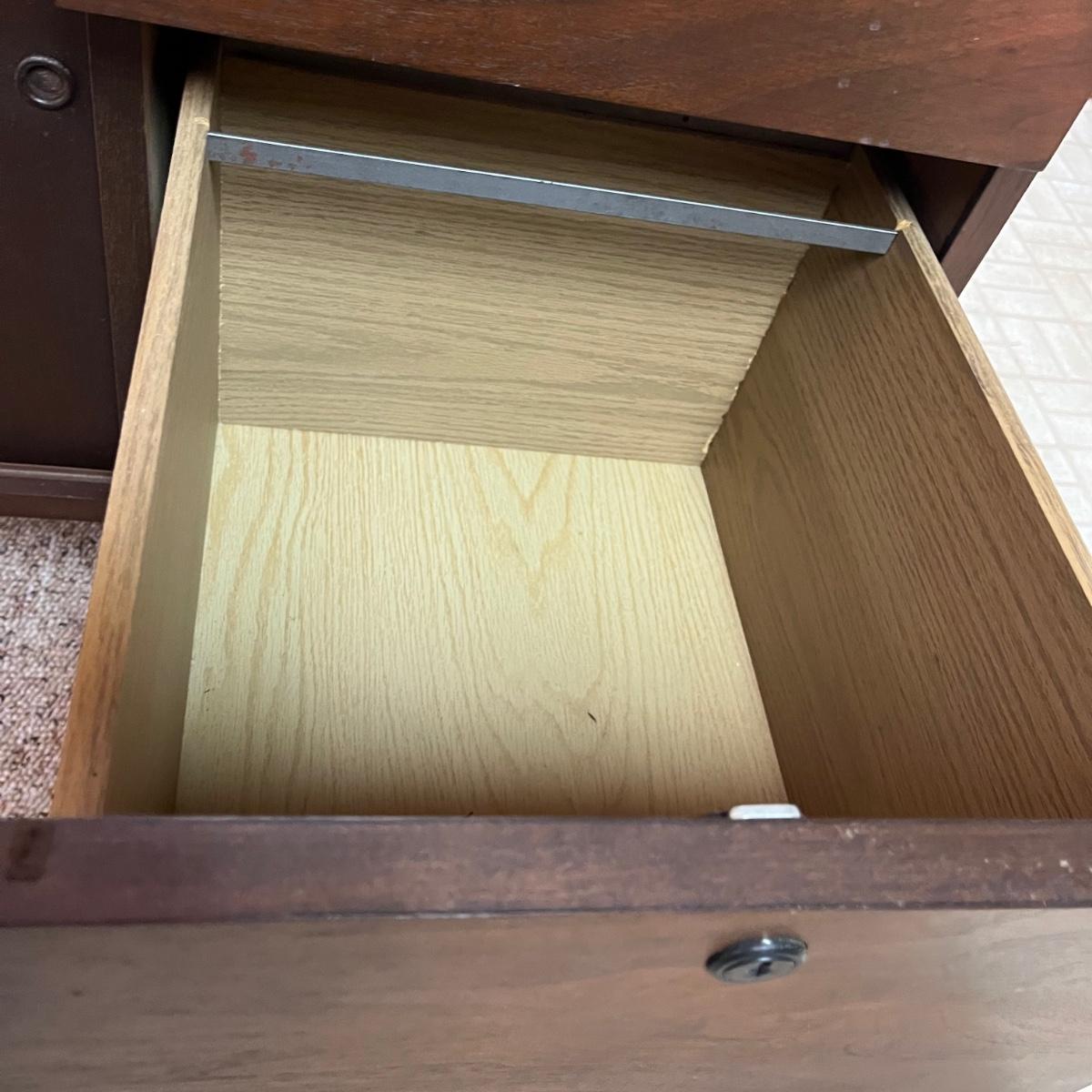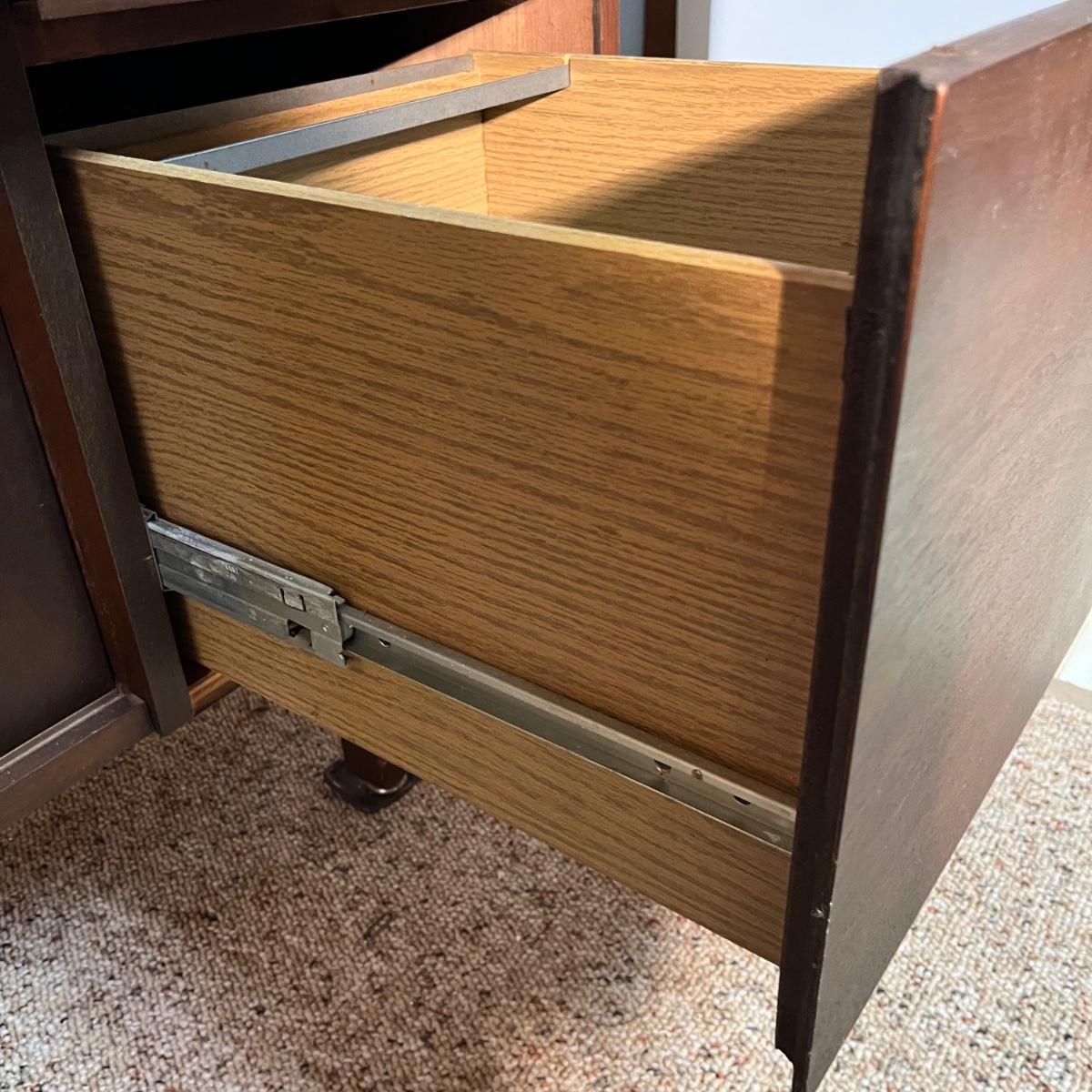 Lot includes an office credenza with adjustable shelf inside sliding cabinet doors. Also has one file sized drawer and four smaller drawers. The brown patches inside the cabinet appear to be paper stuck to the wood and may be removable. Credenza measures 66” x 20”. X 29.5”.