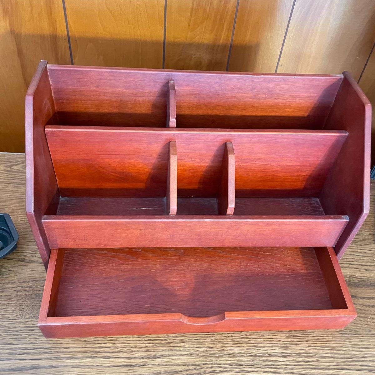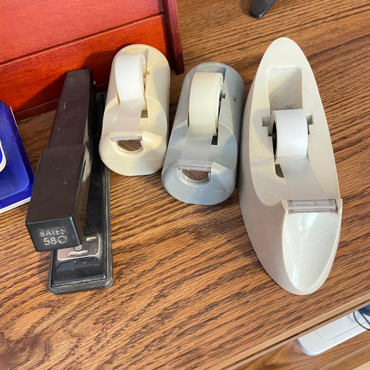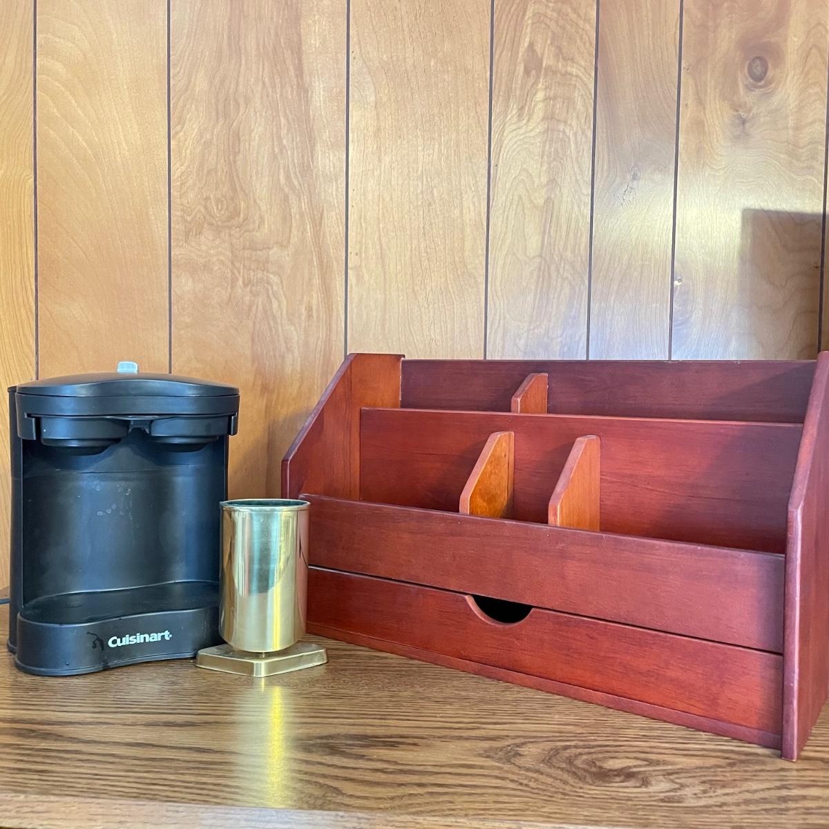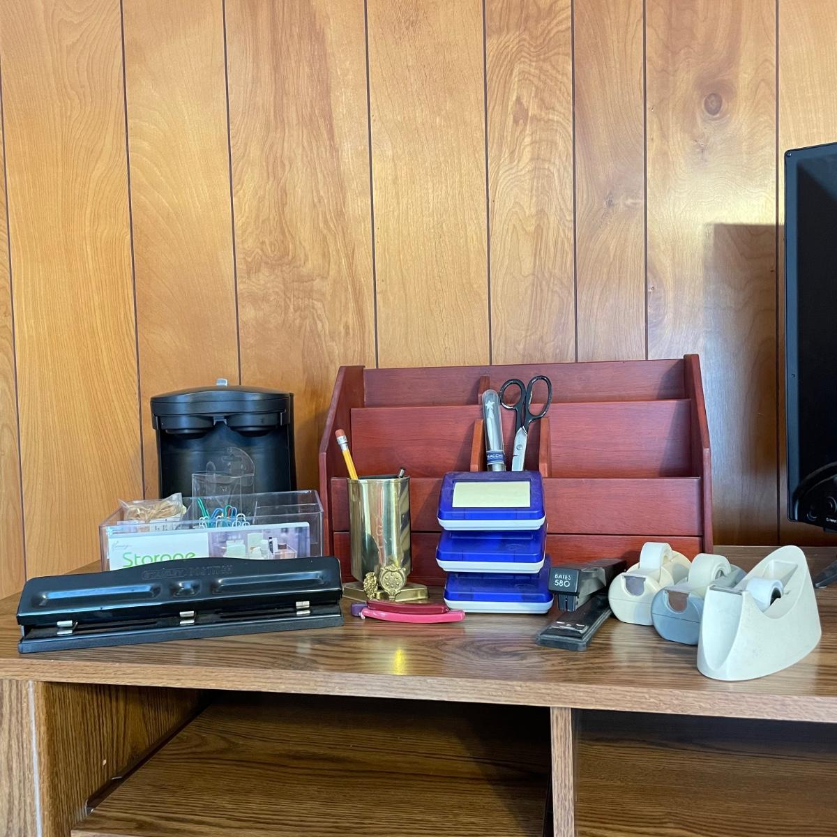 Office supplies including a Cuisinart two cup soft pod brewer perfect for coffee or tea, a wooden cherry colored mail organizer, tape and post-it dispensers, Stanley 3-hole punch, stapler and more! A few vintage items include two wax stamps and a monogrammed brass pen holder. The Target mail center measures 16.5” x 7” x 9.75”. See images. Local pick up only.