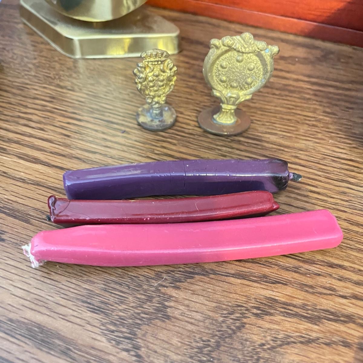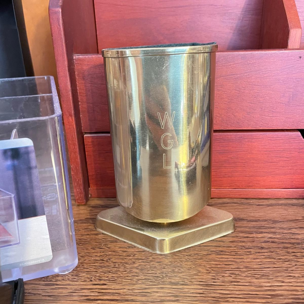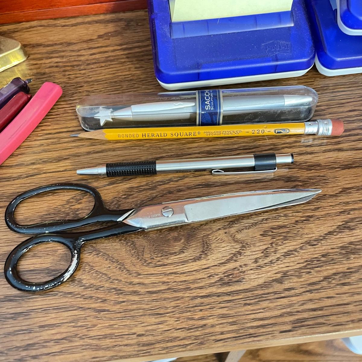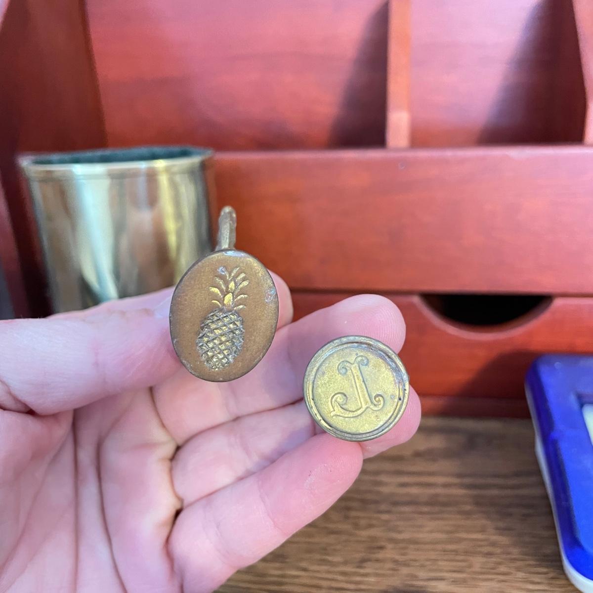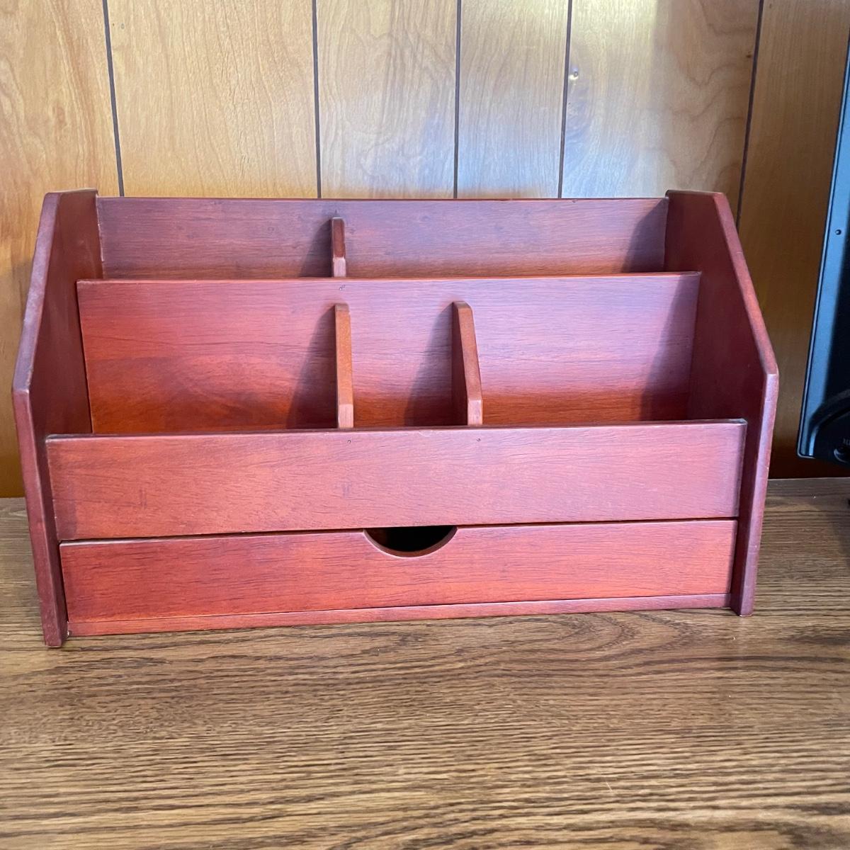 Office supplies including a Cuisinart two cup soft pod brewer perfect for coffee or tea, a wooden cherry colored mail organizer, tape and post-it dispensers, Stanley 3-hole punch, stapler and more! A few vintage items include two wax stamps and a monogrammed brass pen holder. The Target mail center measures 16.5” x 7” x 9.75”. See images. Local pick up only.