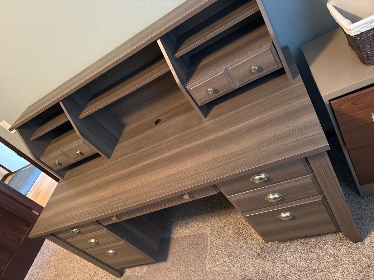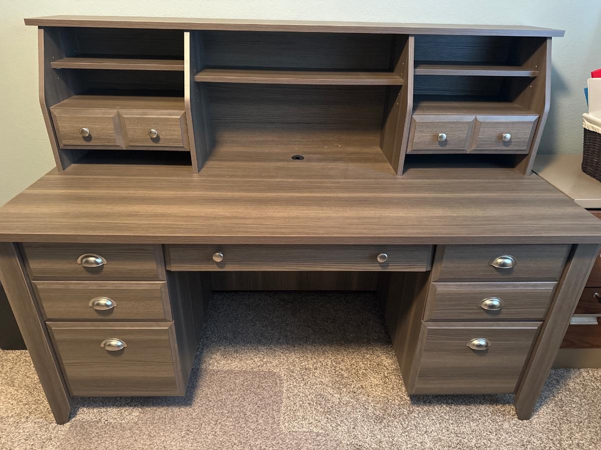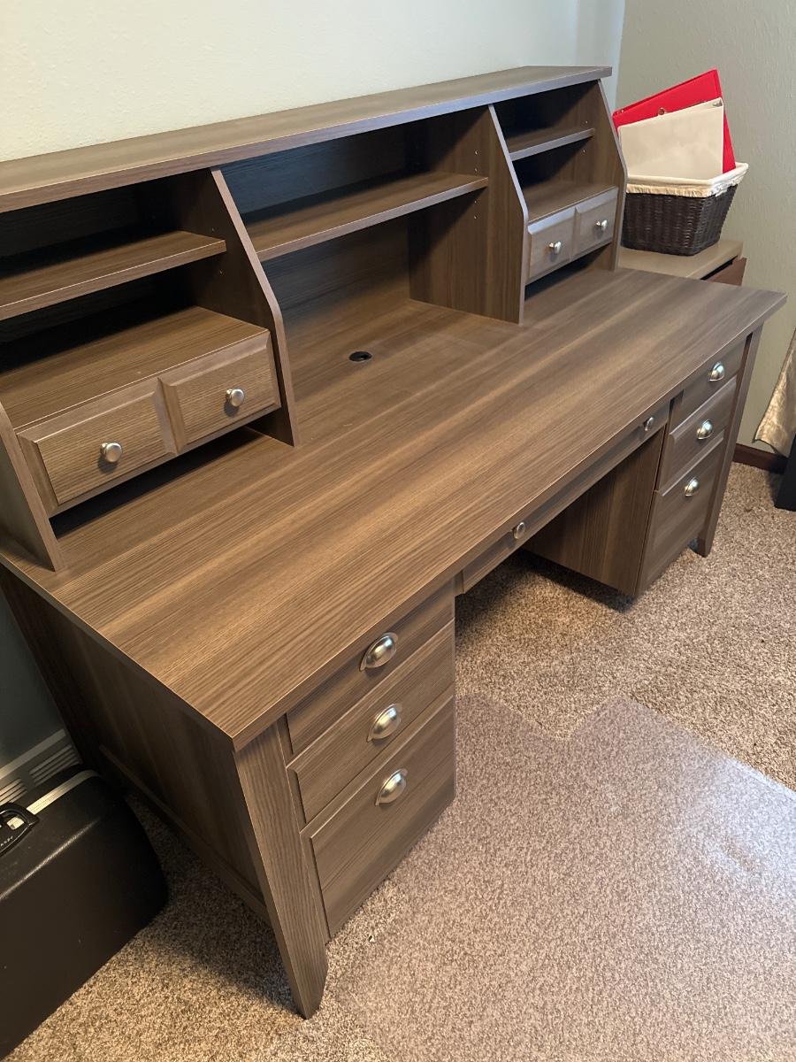 Desk like new with little to no blemishes.it was purchased from Office Max. Dimensions are 65 inches wide by 48 inches tall by 29 1/2 inches deep