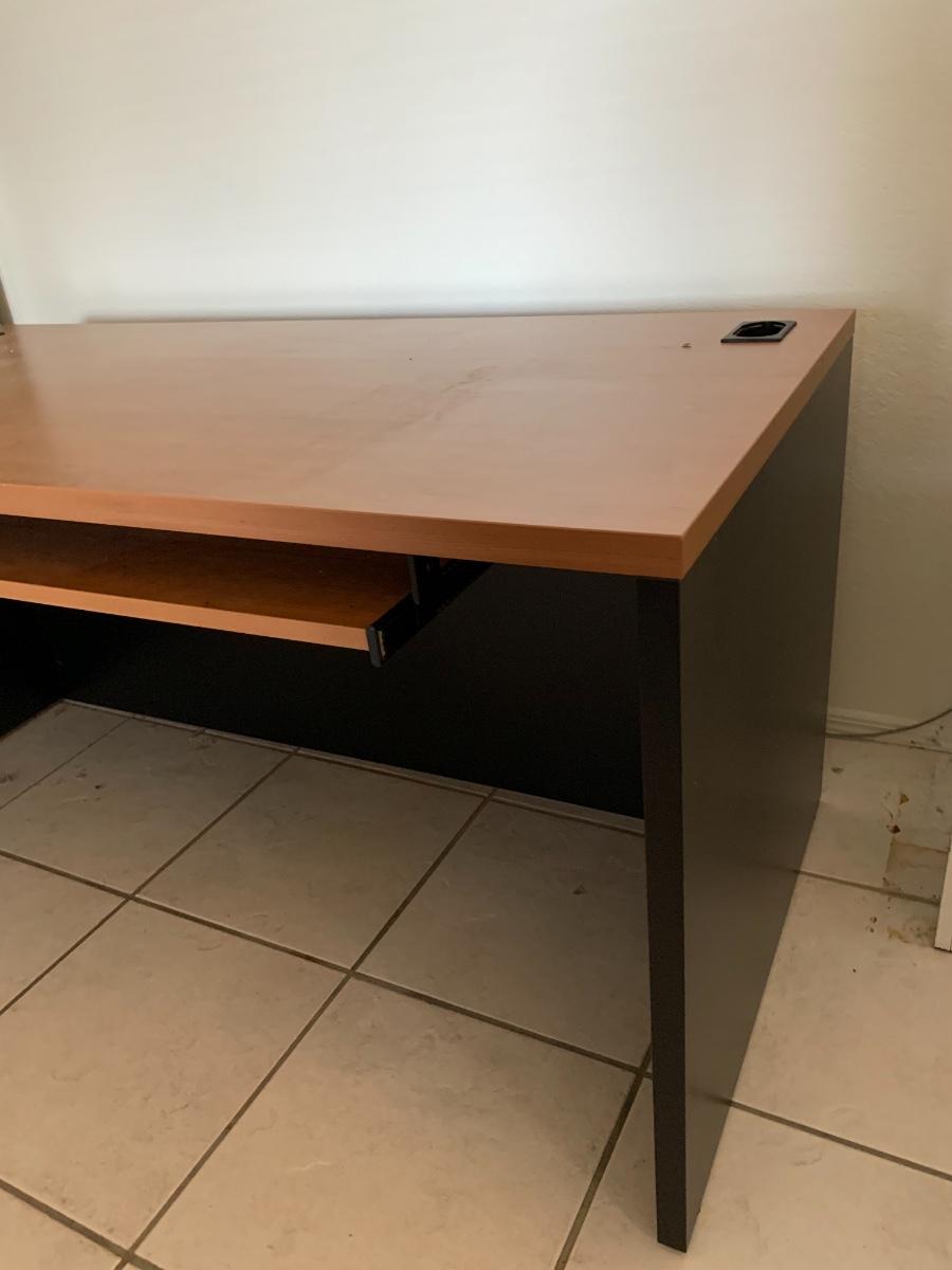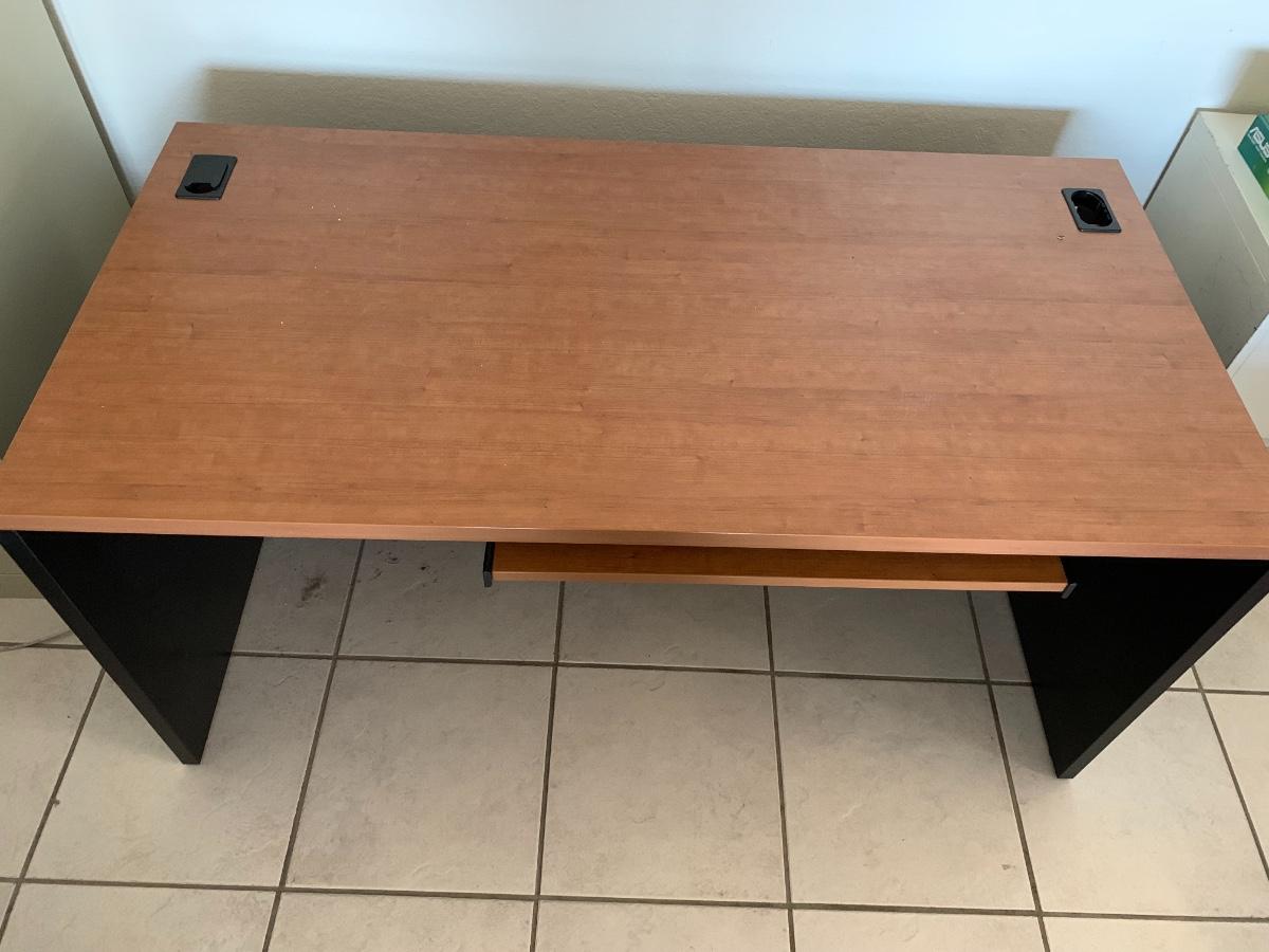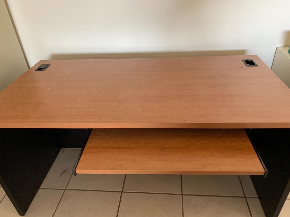 Wood top, black side office desk with built in holes on top to hide cords. Has a pull out keyboard tray. 60” long x 30” deep x 29” high. Good condition.
