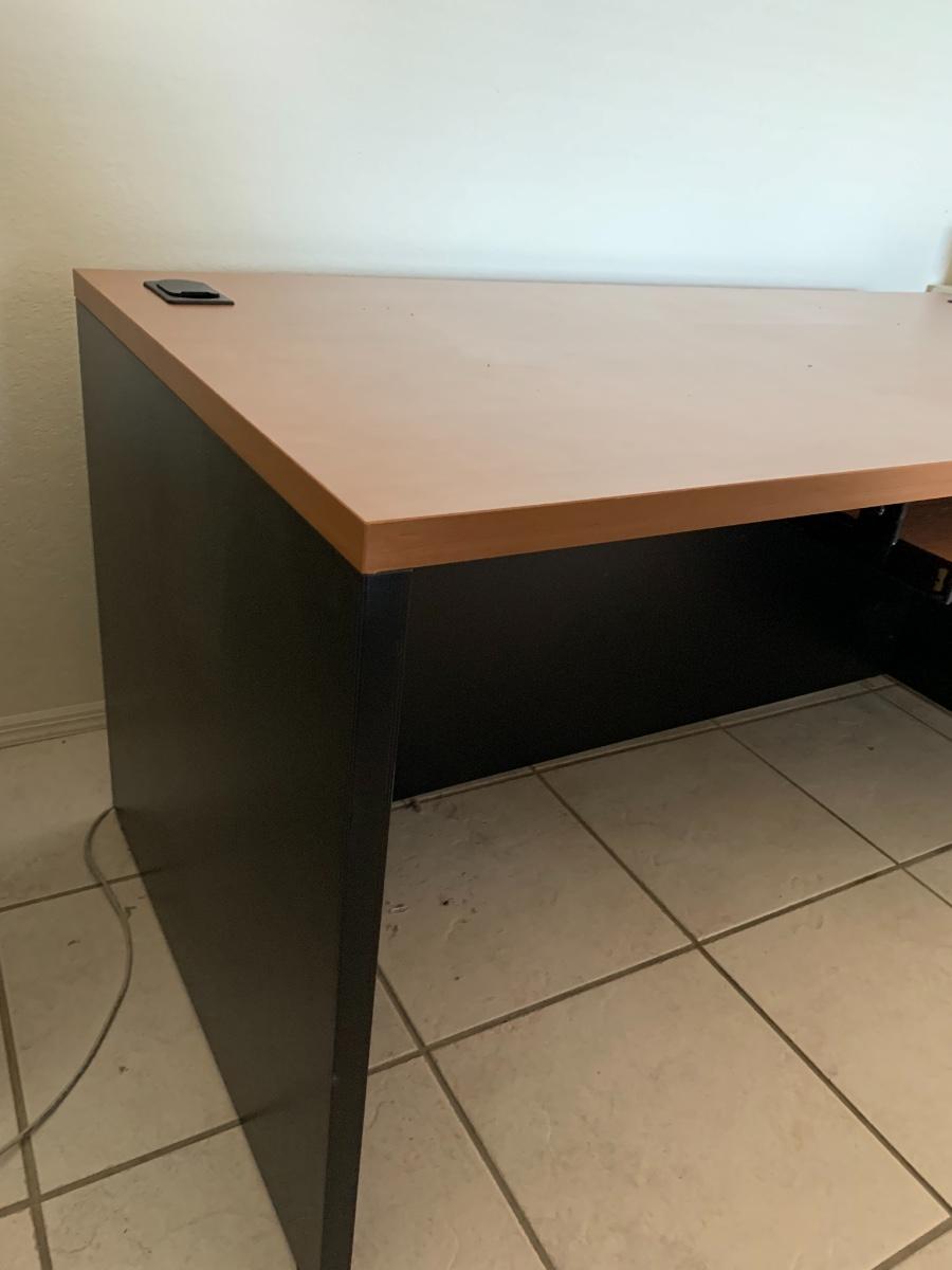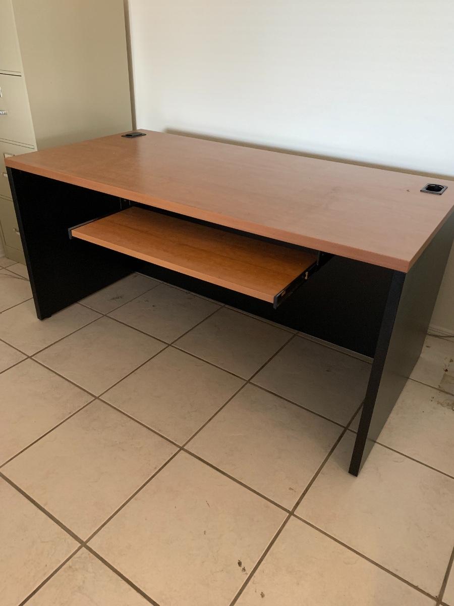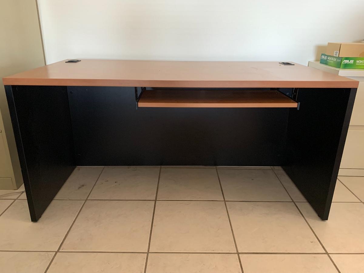 Wood top, black side office desk with built in holes on top to hide cords. Has a pull out keyboard tray. 60” long x 30” deep x 29” high. Good condition.