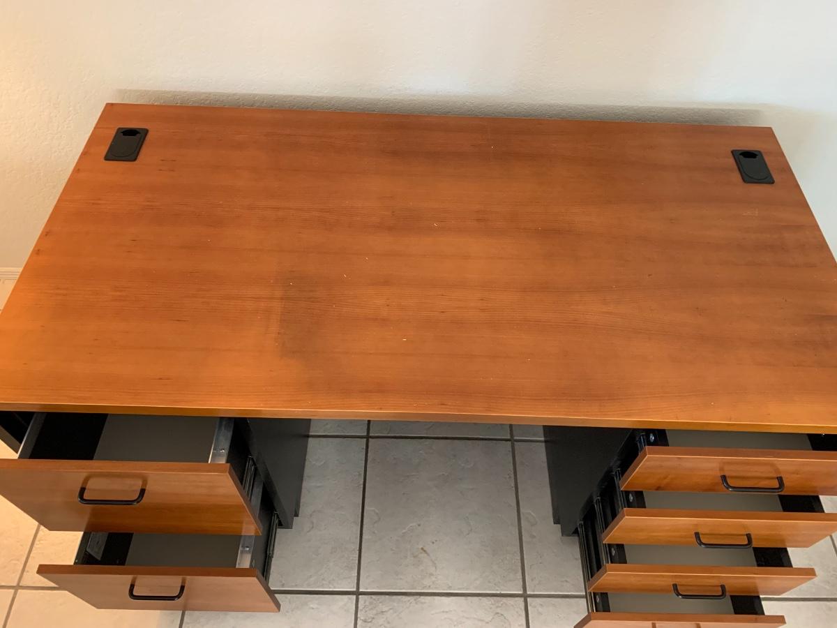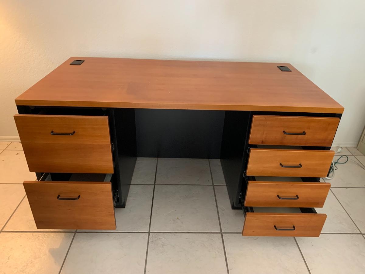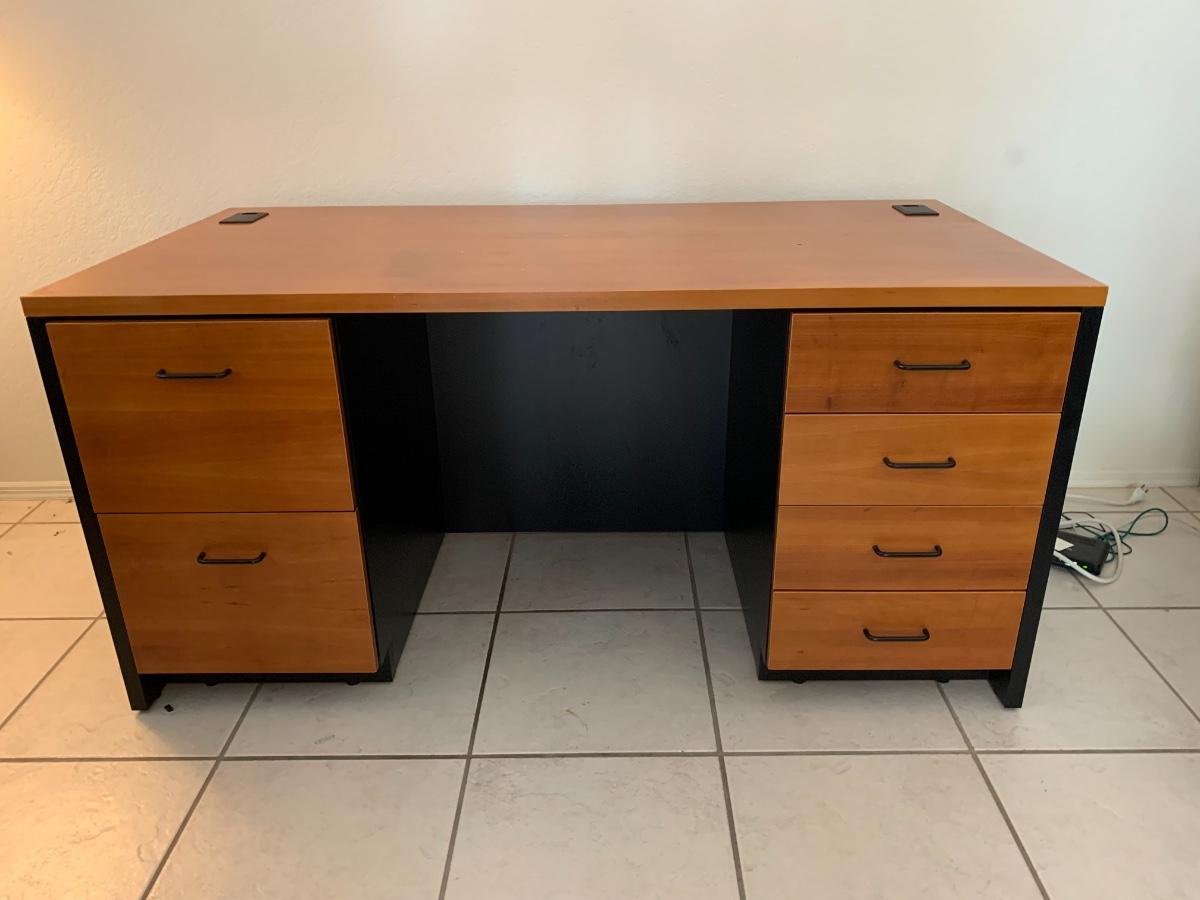 One dark wood and black desk with 4 small drawers on right and two file drawers on the left. Plastic pulls, two holes on the top for electrical cables and cords. In good condition with some minor wear to the top. Drawers slide easily. ( 60 inches in width, 30 inches in depth, 29 inches in height) *wood top with black sides*